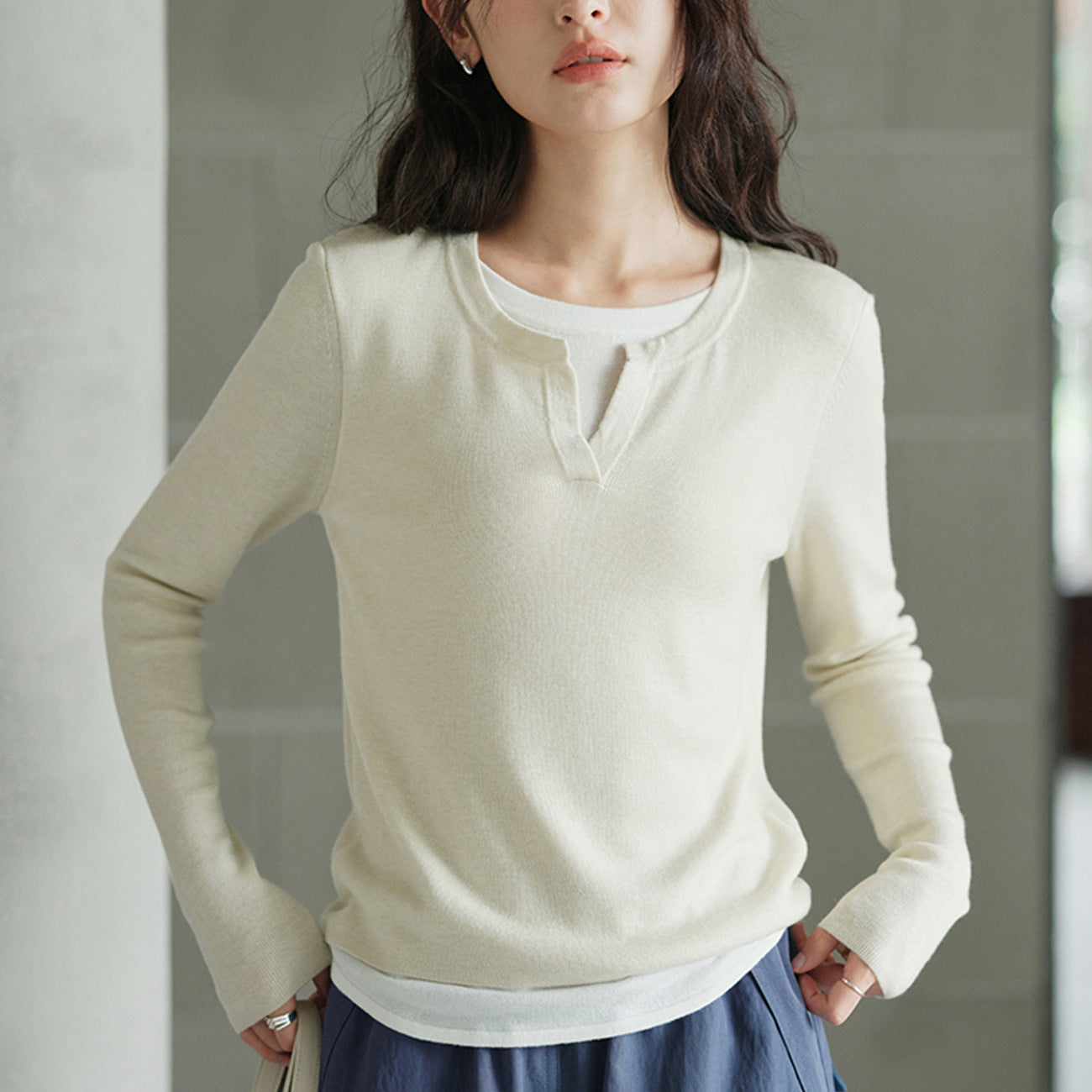 #混纺轻盈莫代尔棉亲肤柔软# 拼色假两件T恤女2026秋冬长袖打底衫