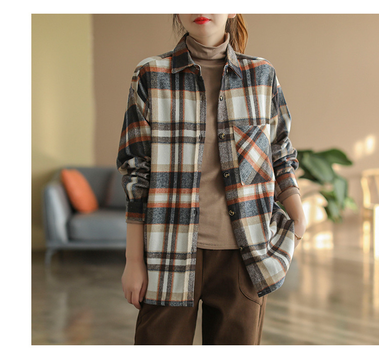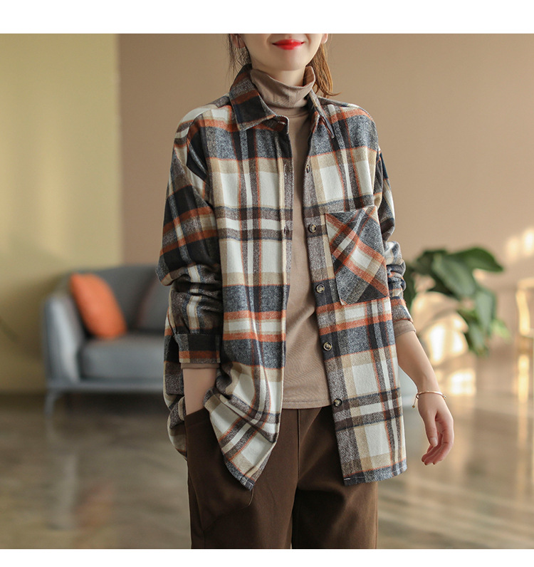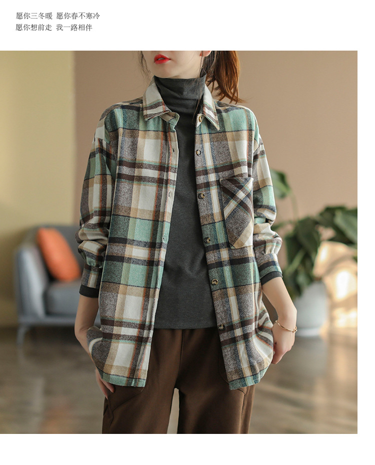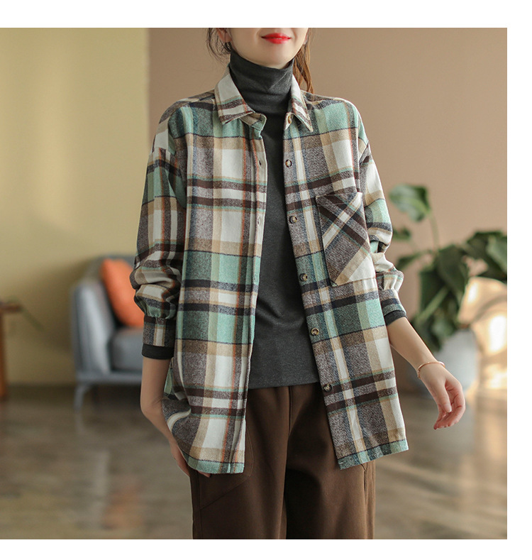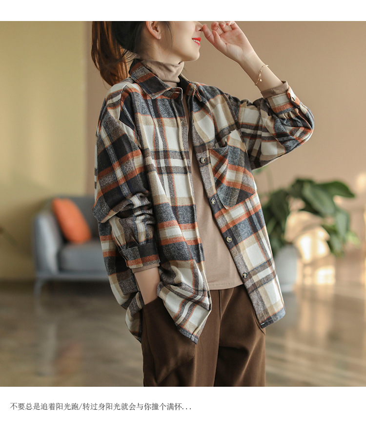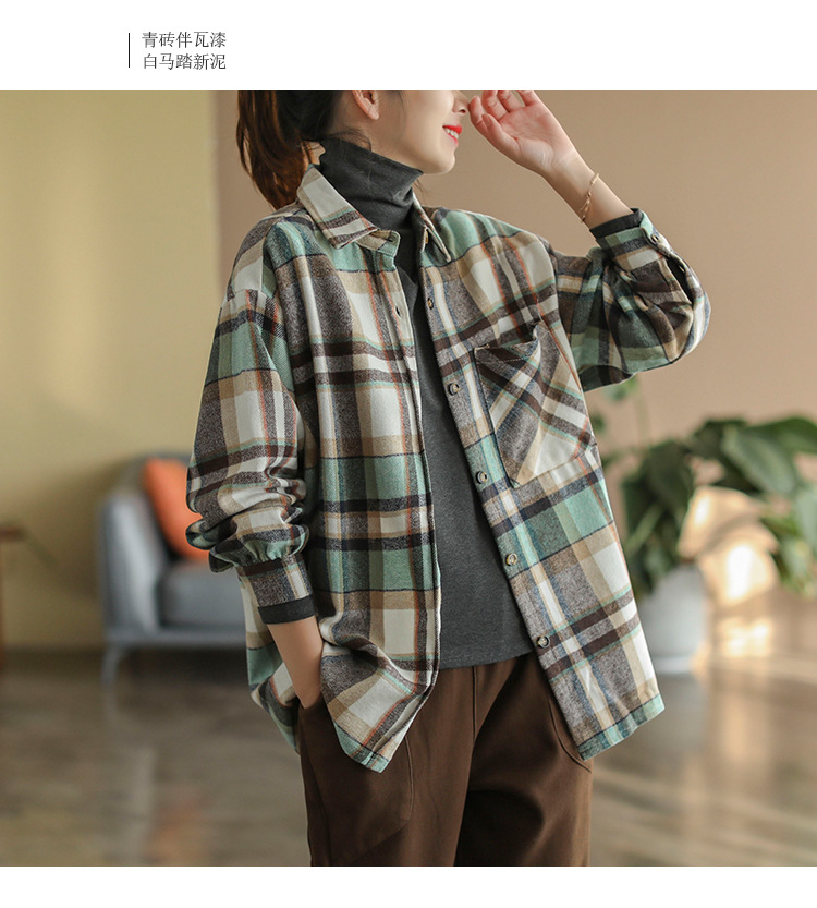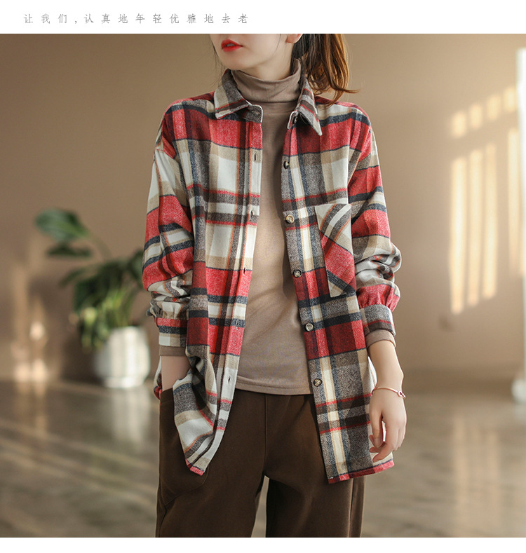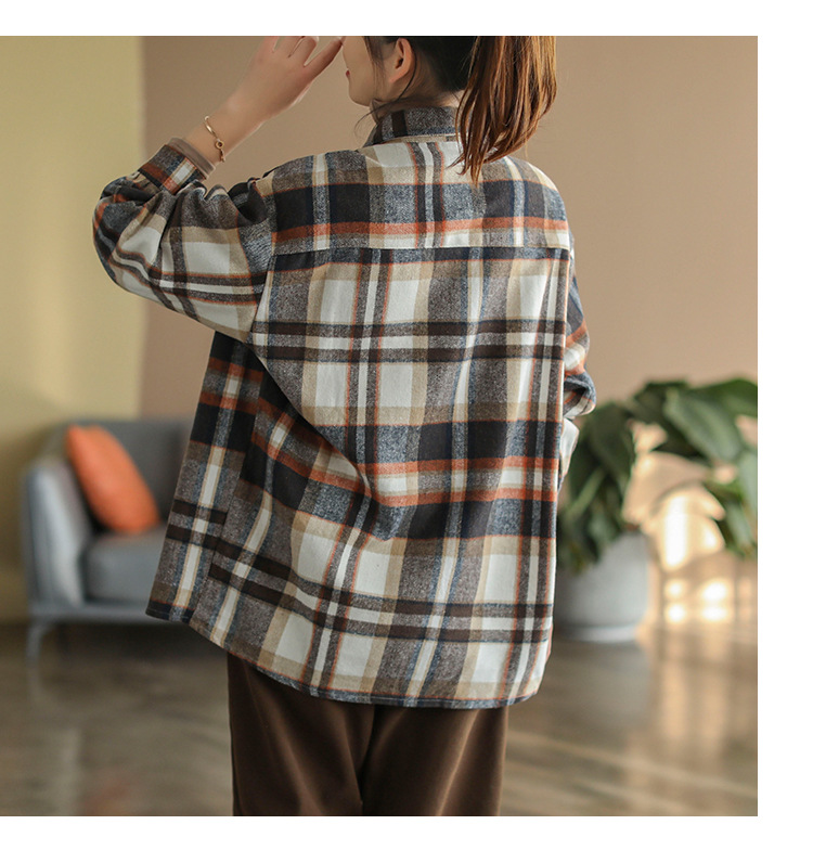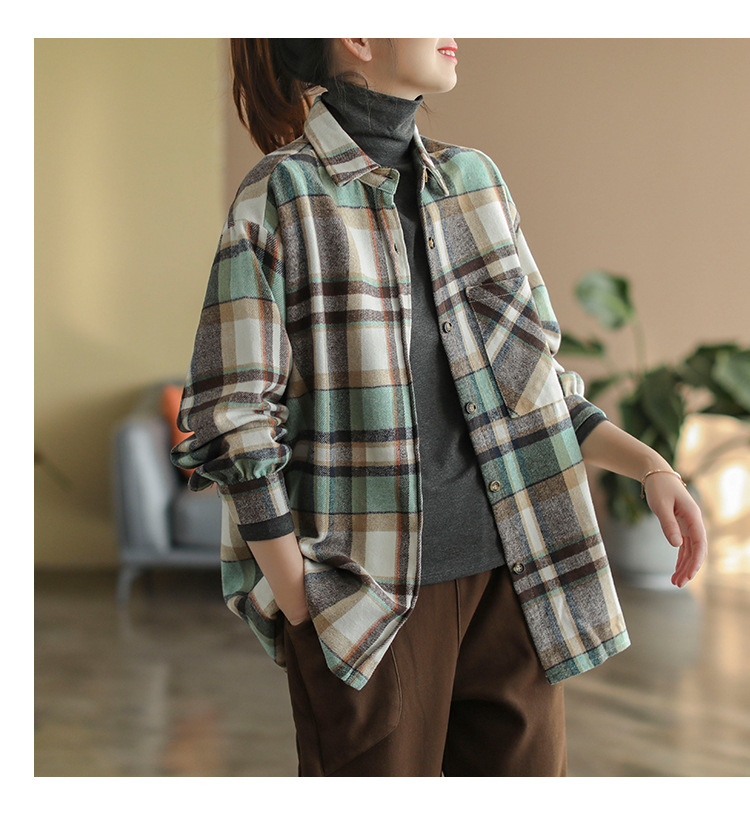 2024 autumn new literary and retro loose polished cotton plaid long-sleeved thin shirt top women's 9260