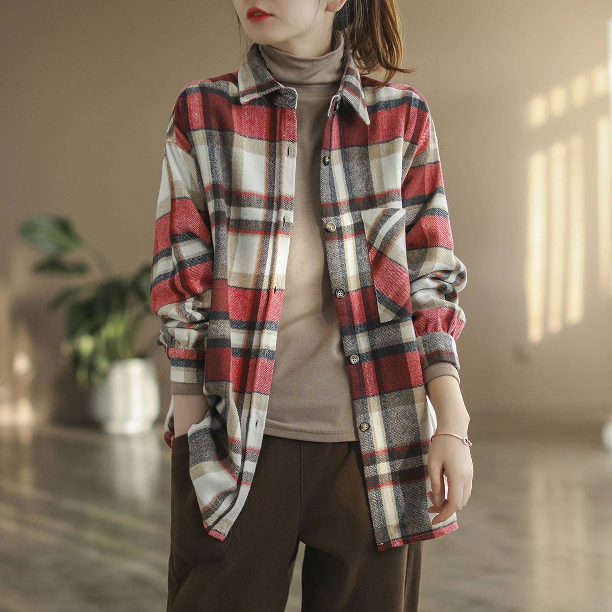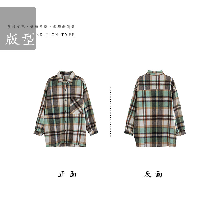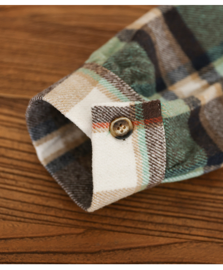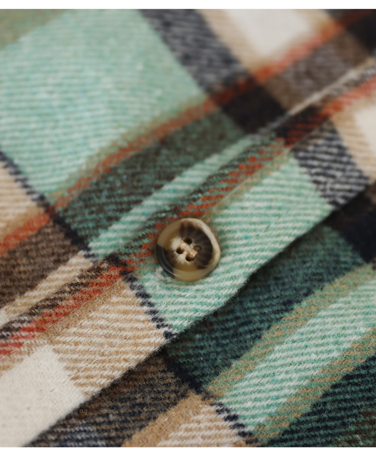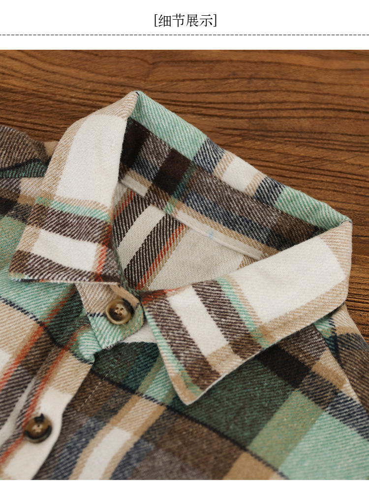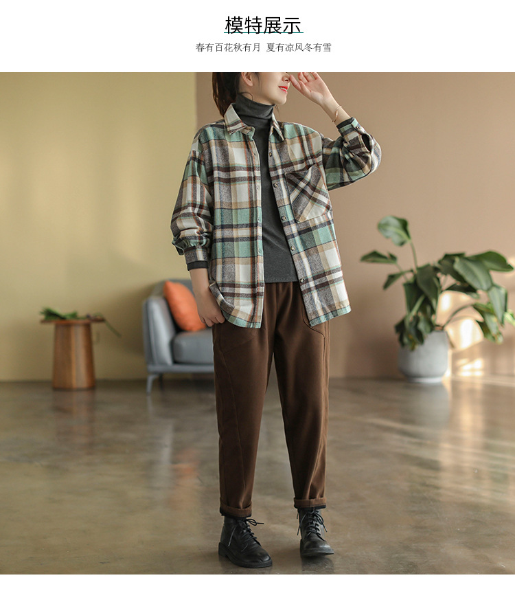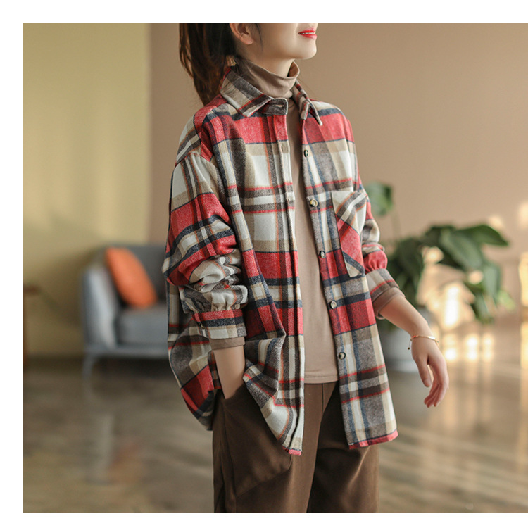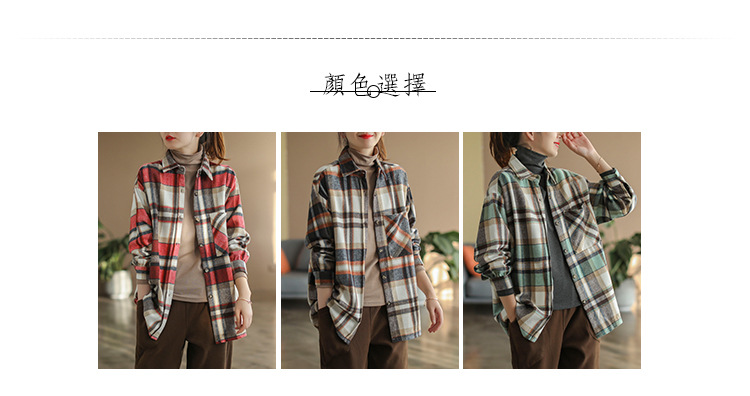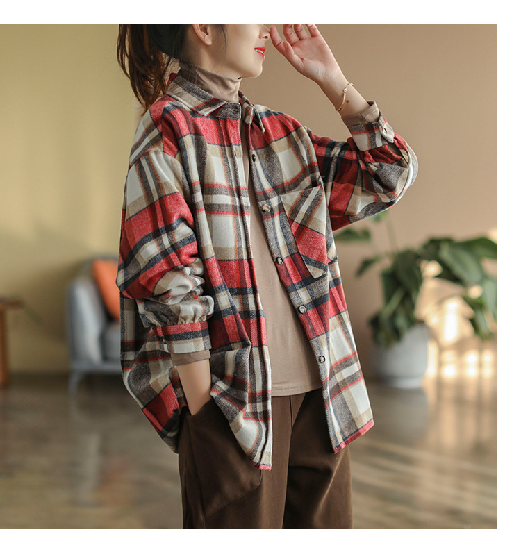 2024 autumn new literary and retro loose polished cotton plaid long-sleeved thin shirt top women's 9260