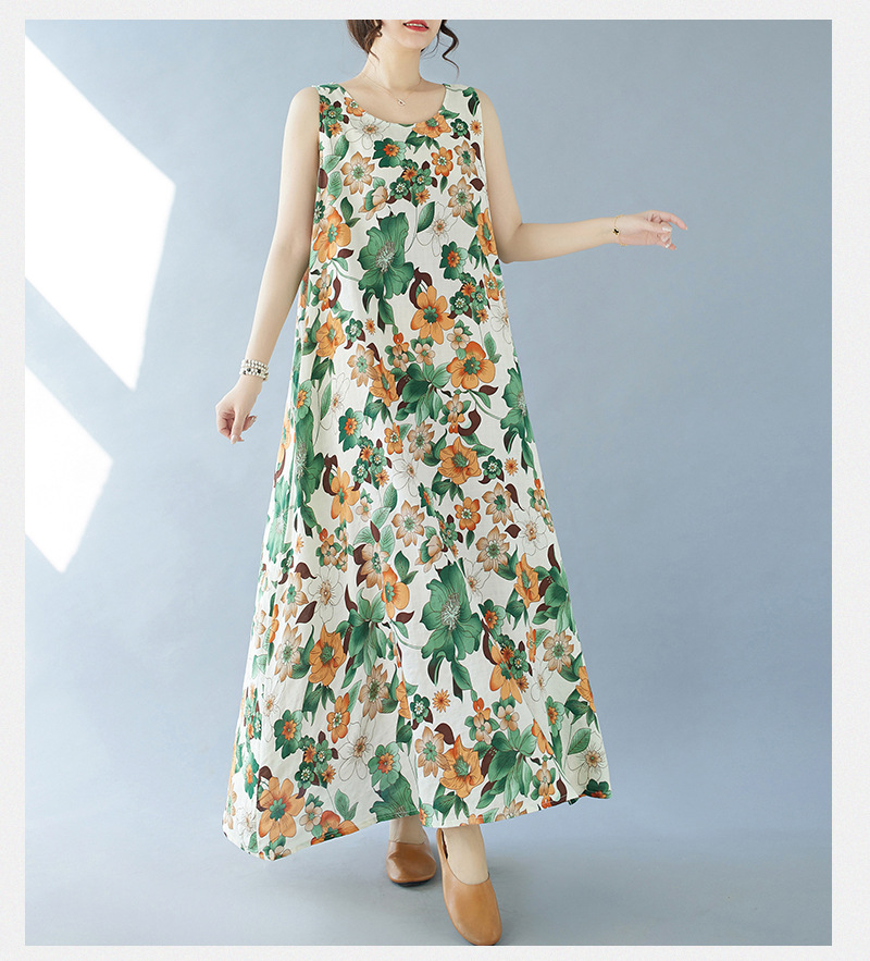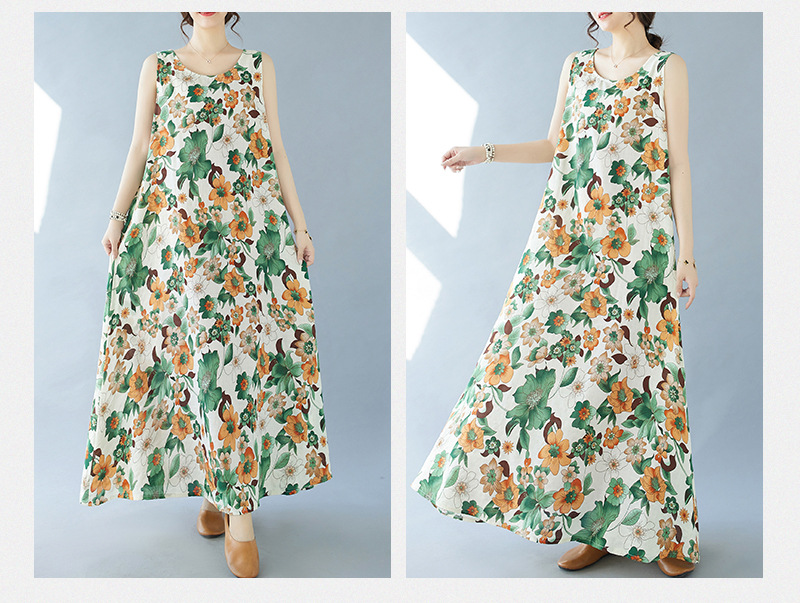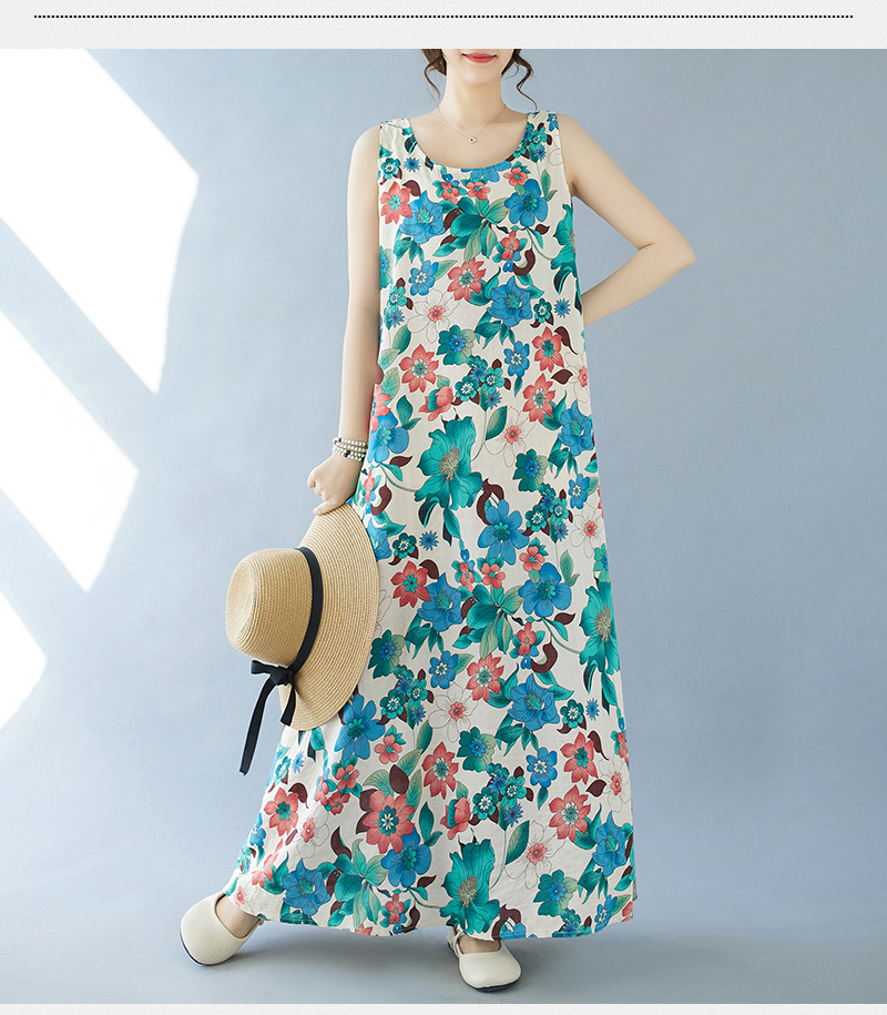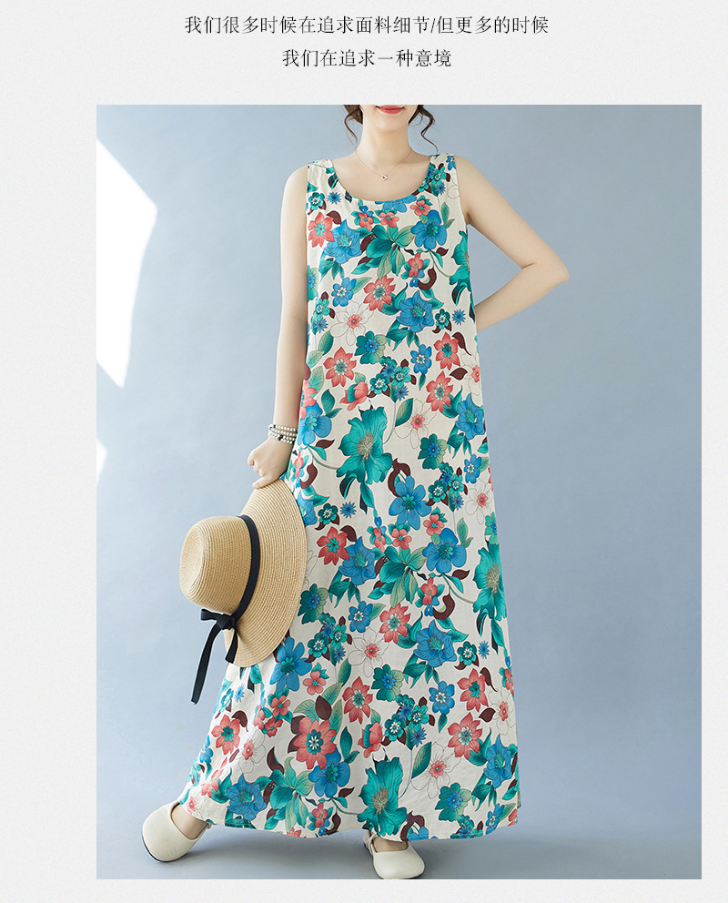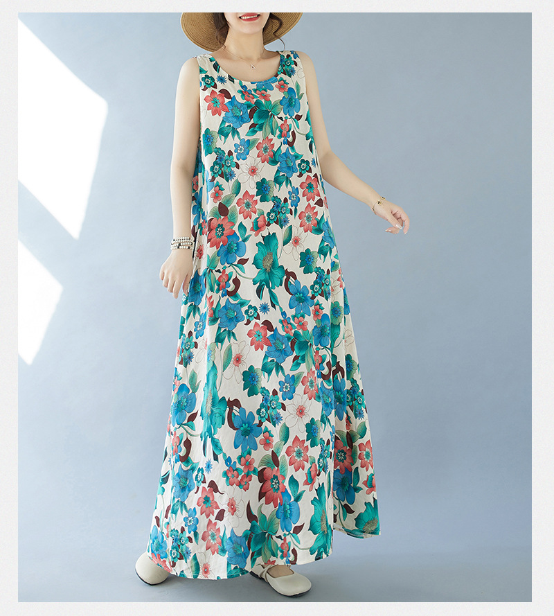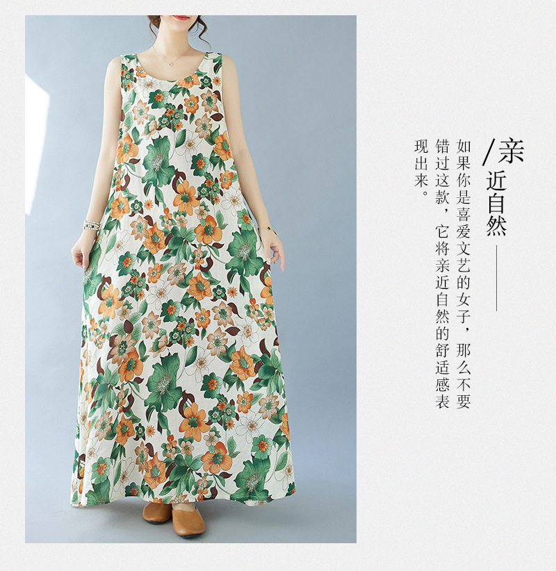 2024 real shot summer new bohemian fattened plus sleeveless crew neck printed medium and long dress women