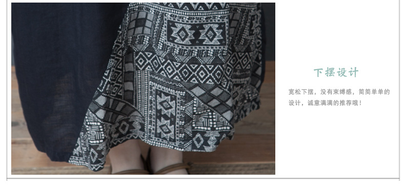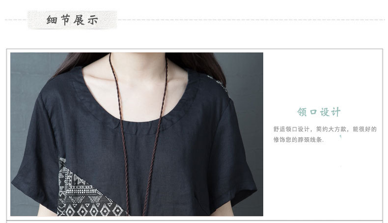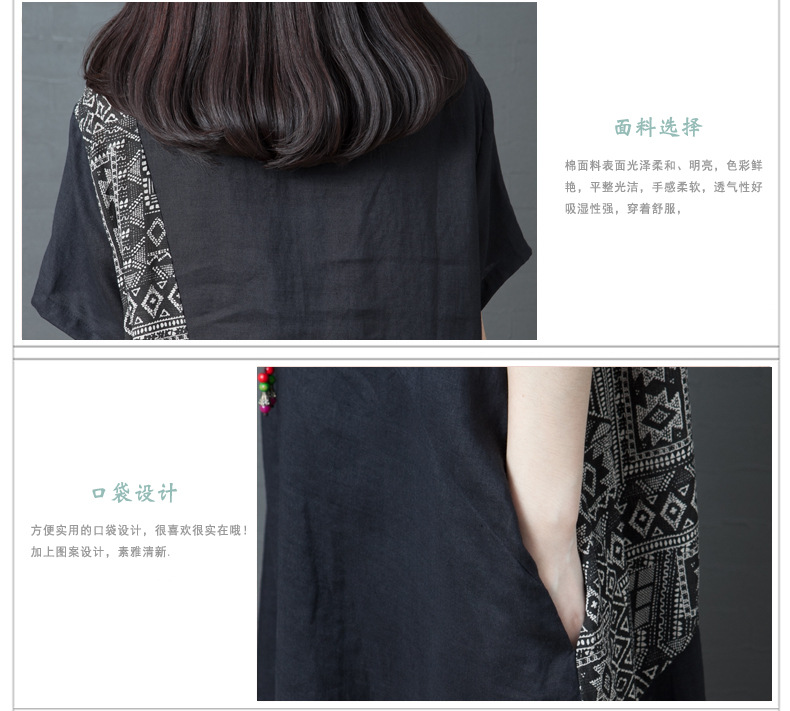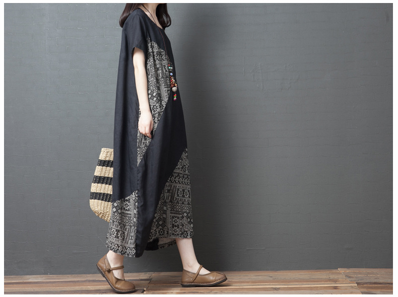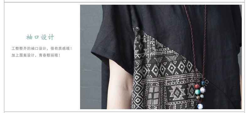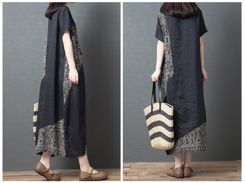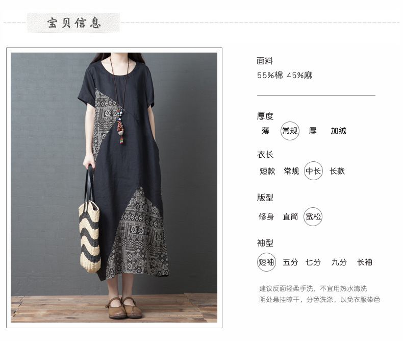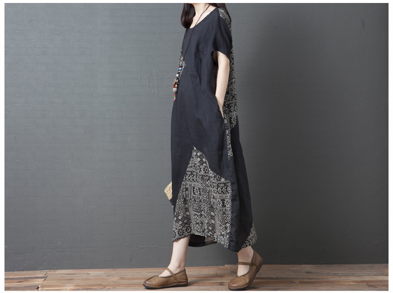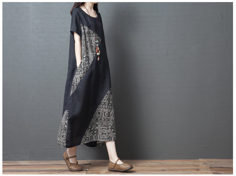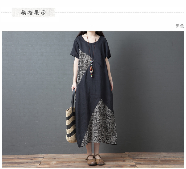 2024 summer new literary loose splicing printing cotton and linen round neck short-sleeved dress women's medium and long #1833 #