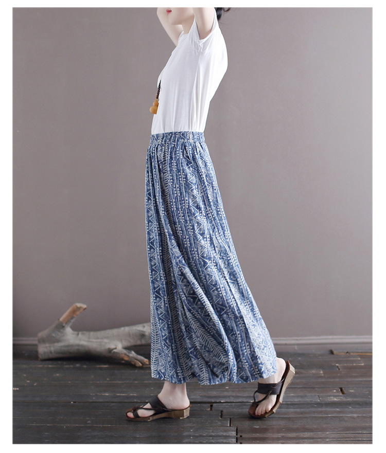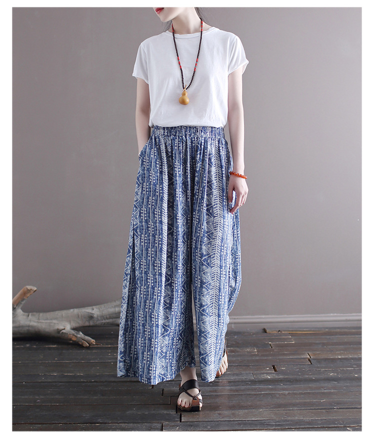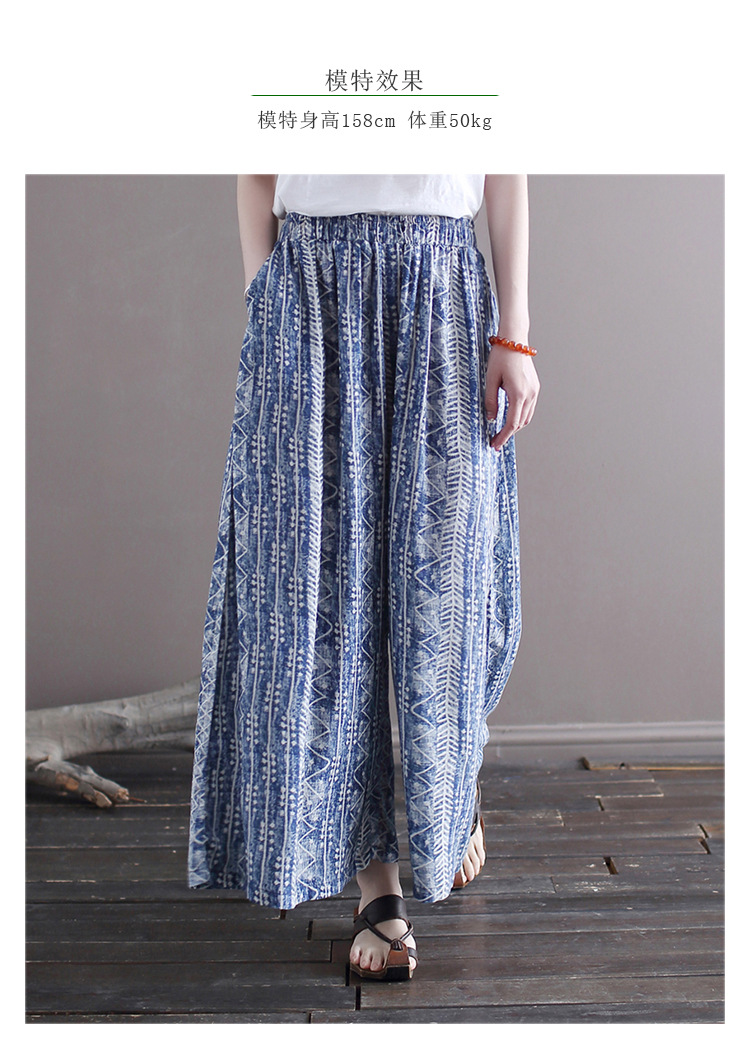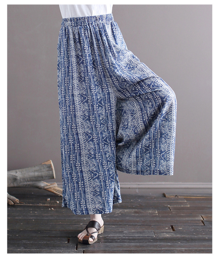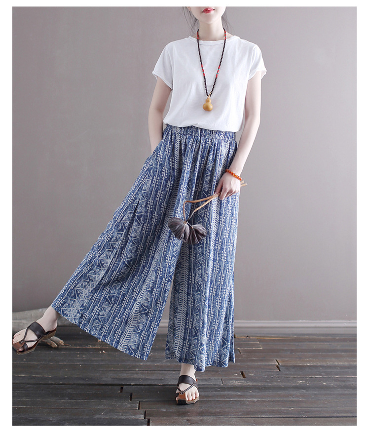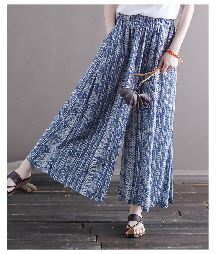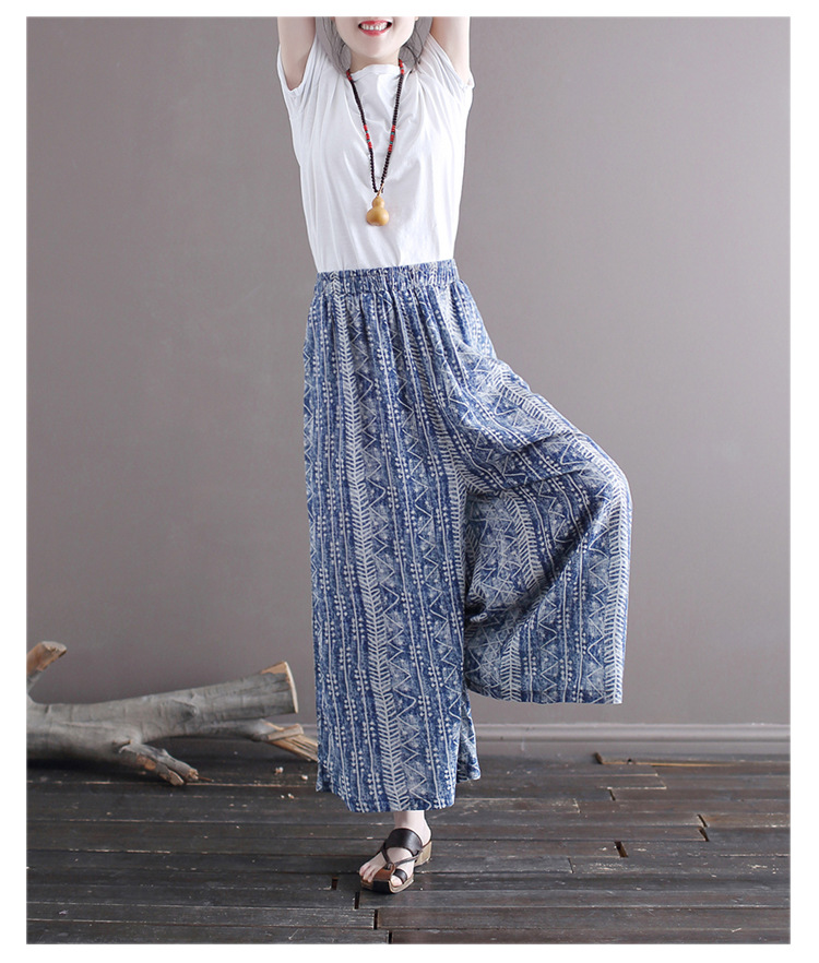 2024 summer thin literary cotton and linen wide-leg floral ethnic style loose batik elastic waist culottes straight-leg pants women