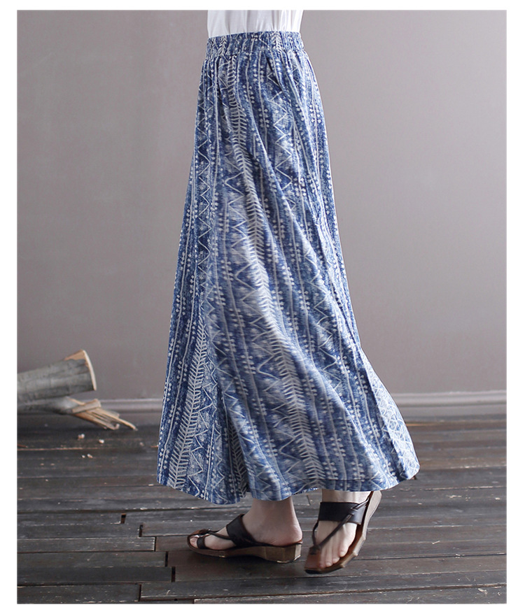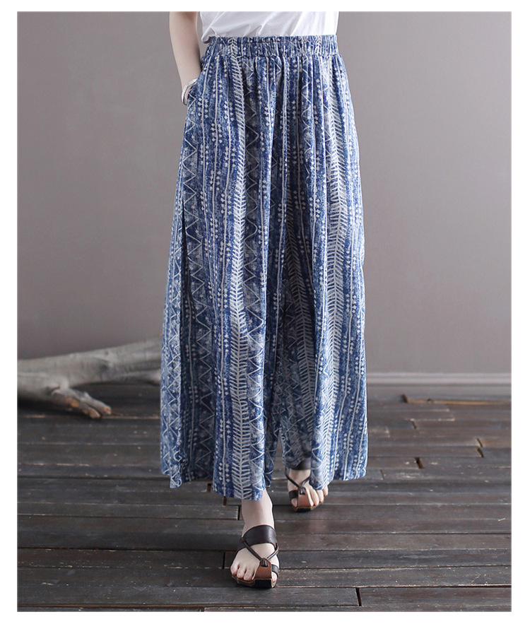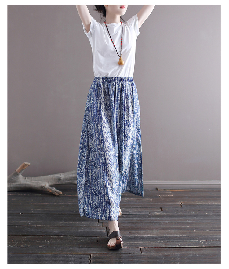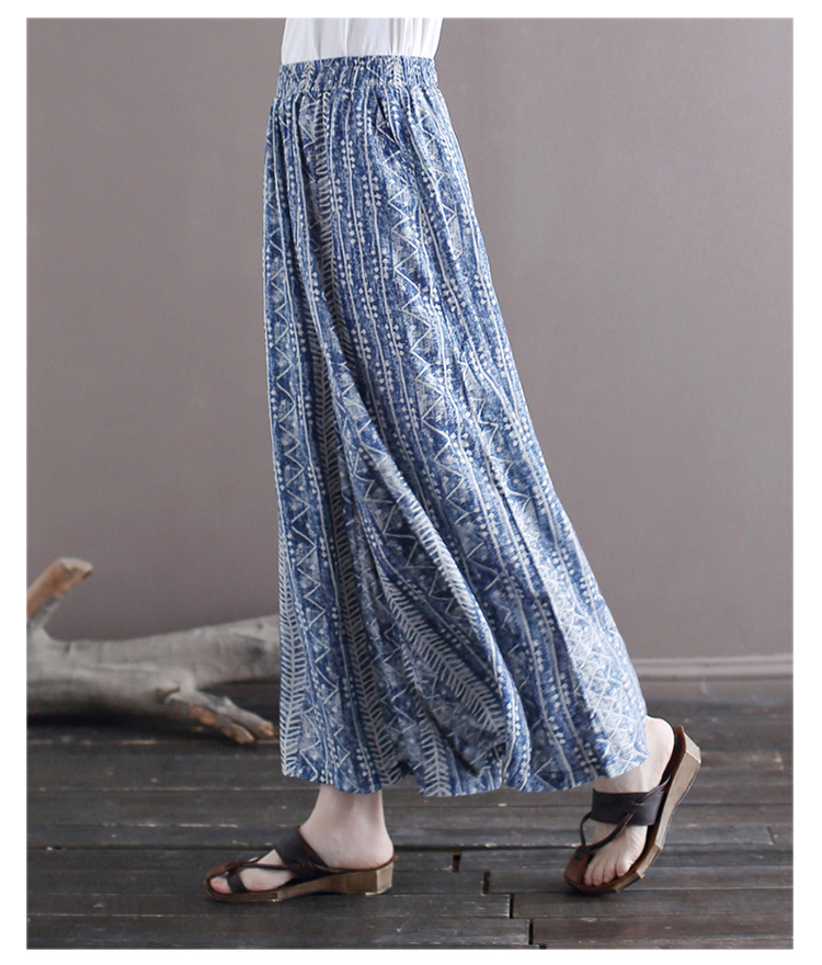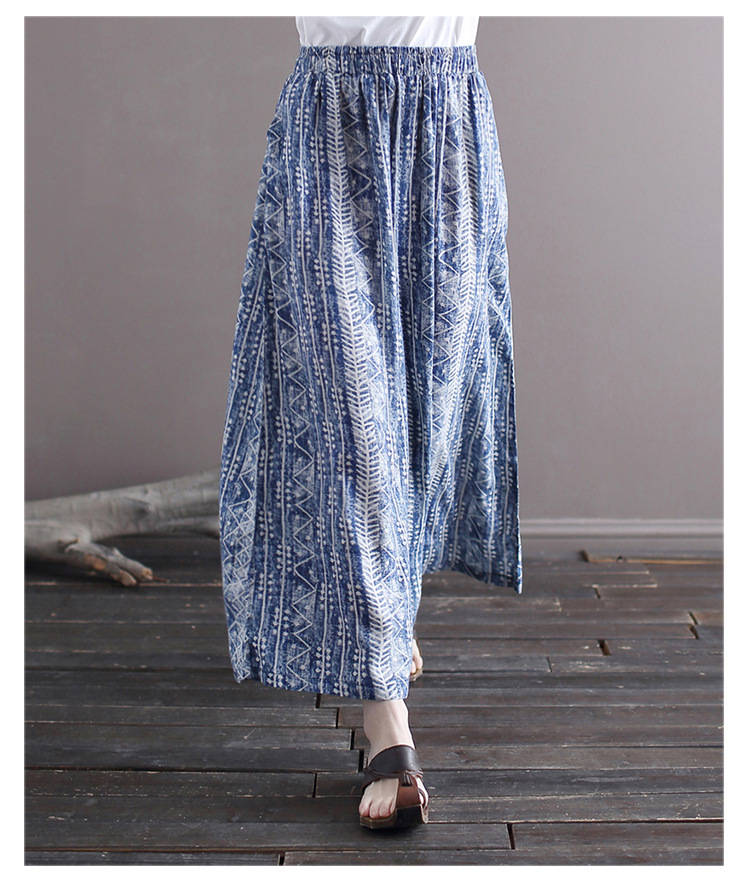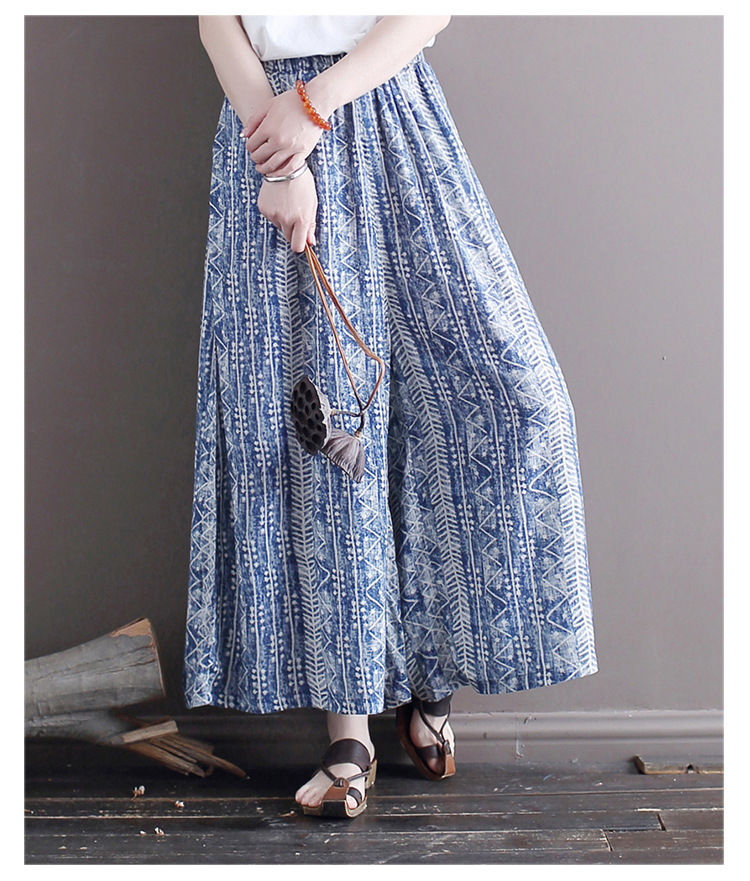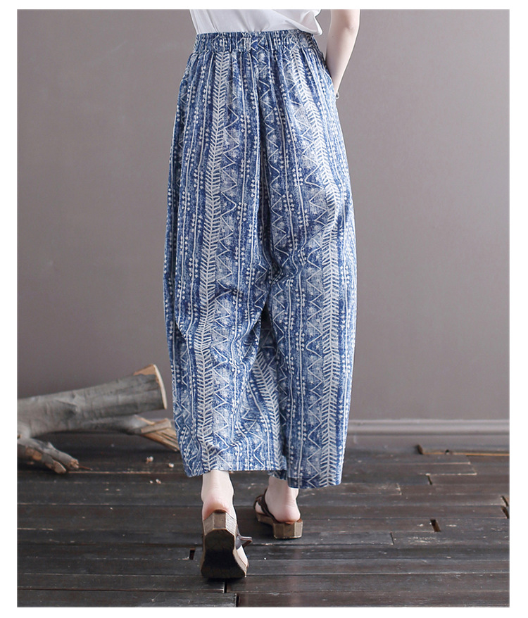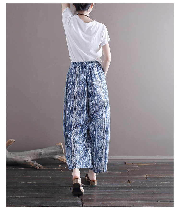 2024 summer thin literary cotton and linen wide-leg floral ethnic style loose batik elastic waist culottes straight-leg pants women