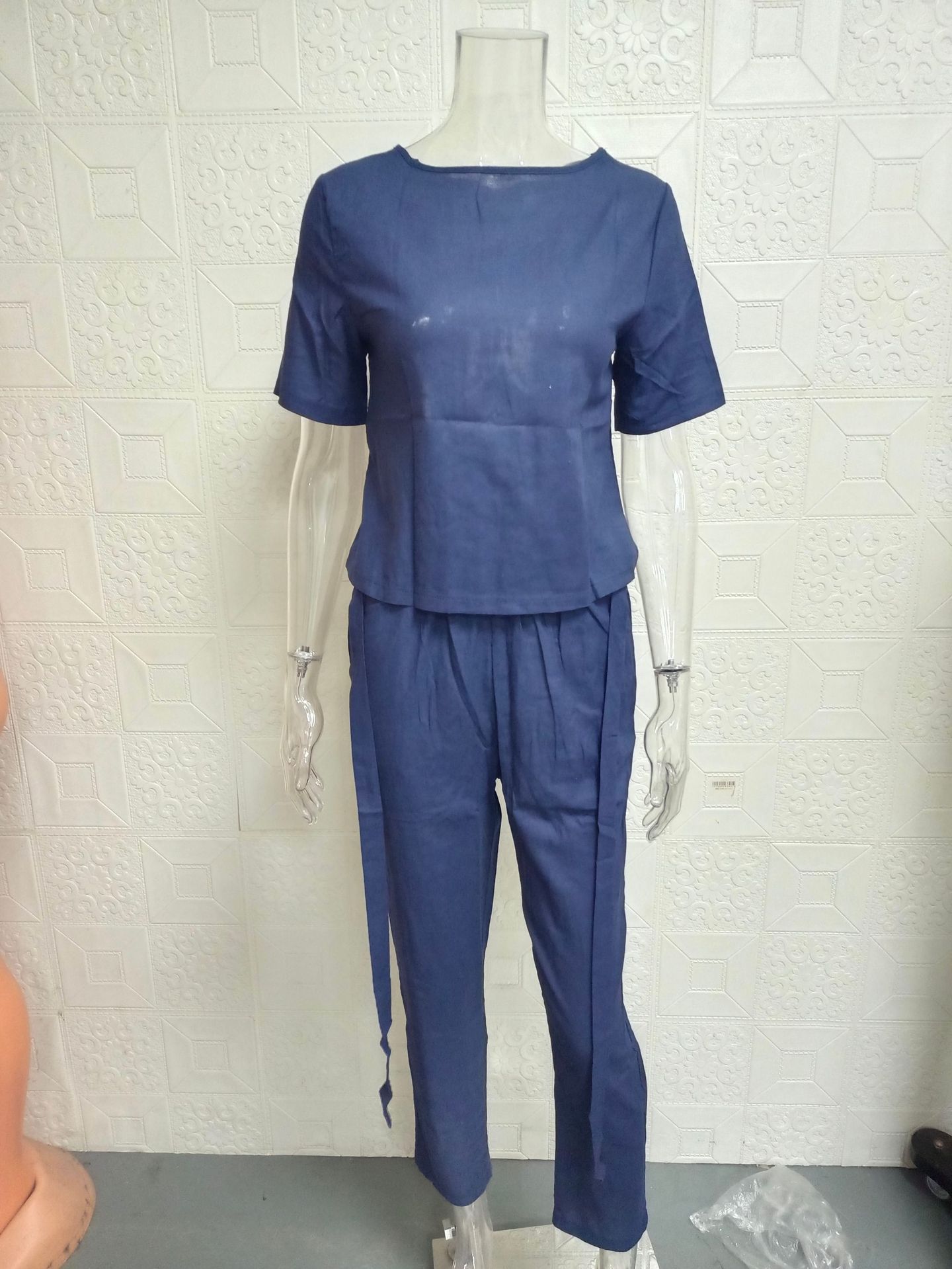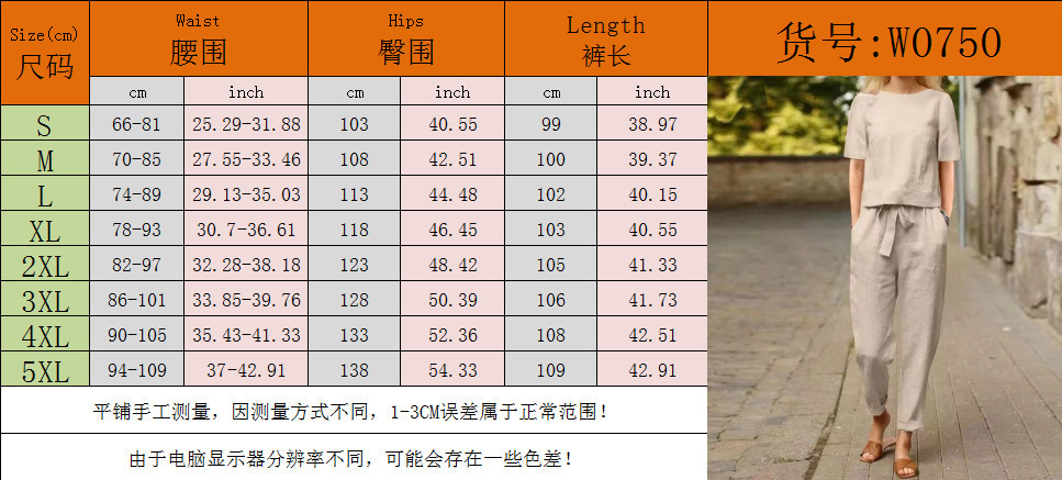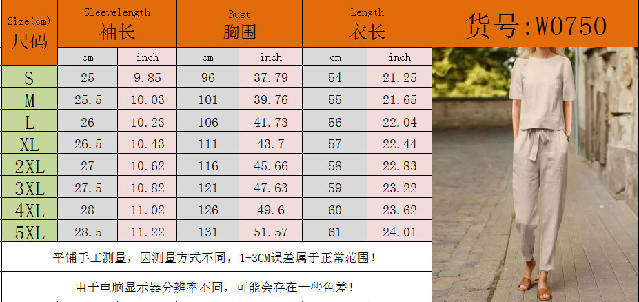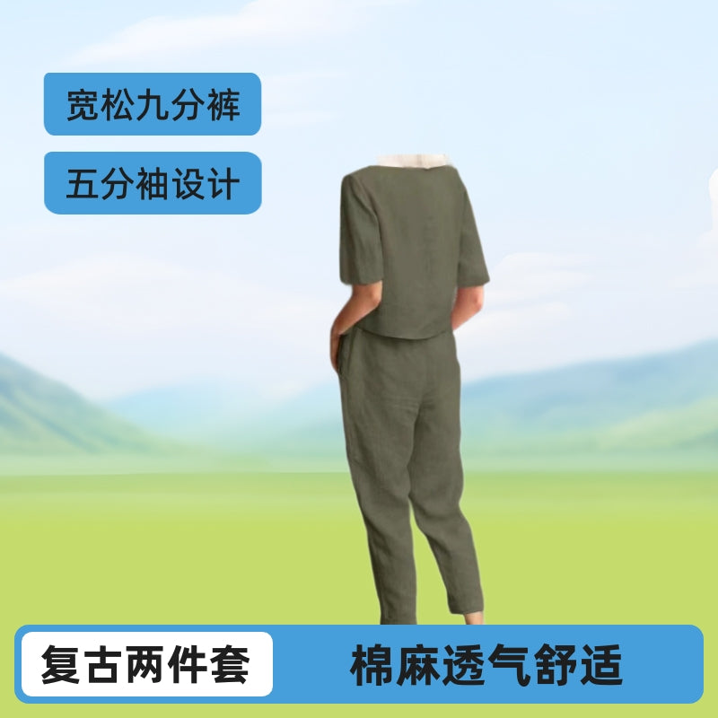 2025 cross-border women's clothing cotton and linen summer commuting matching set half-sleeved O-neck oversized blouse retro two-piece set