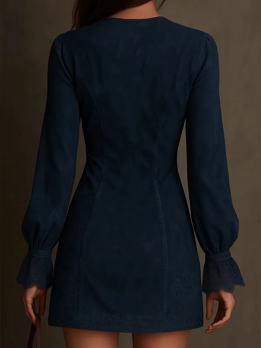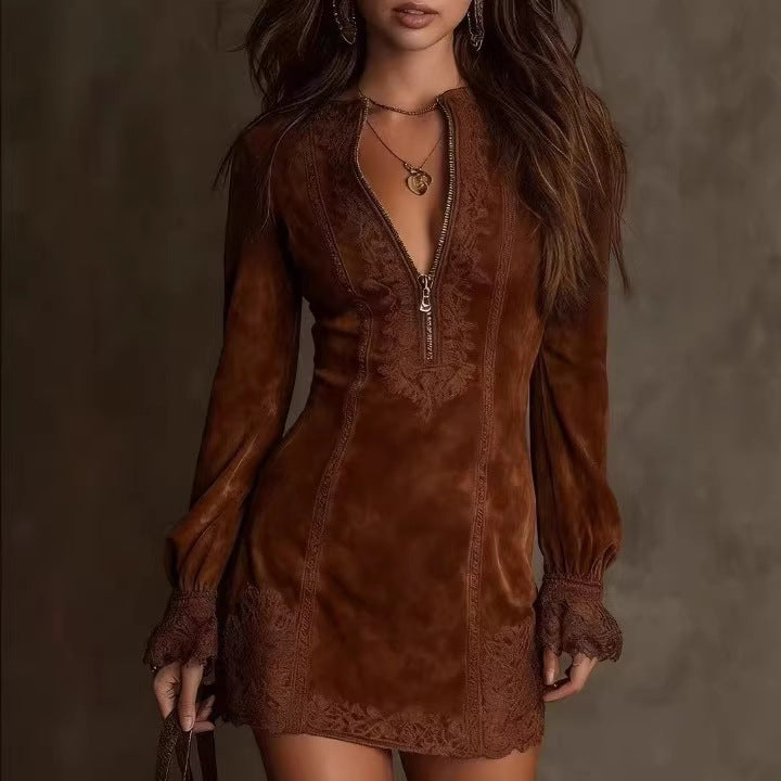 2025 European and American women's clothing, Amazon independent station zipper lace splicing V-neck long sleeves, loose embroidery, dress