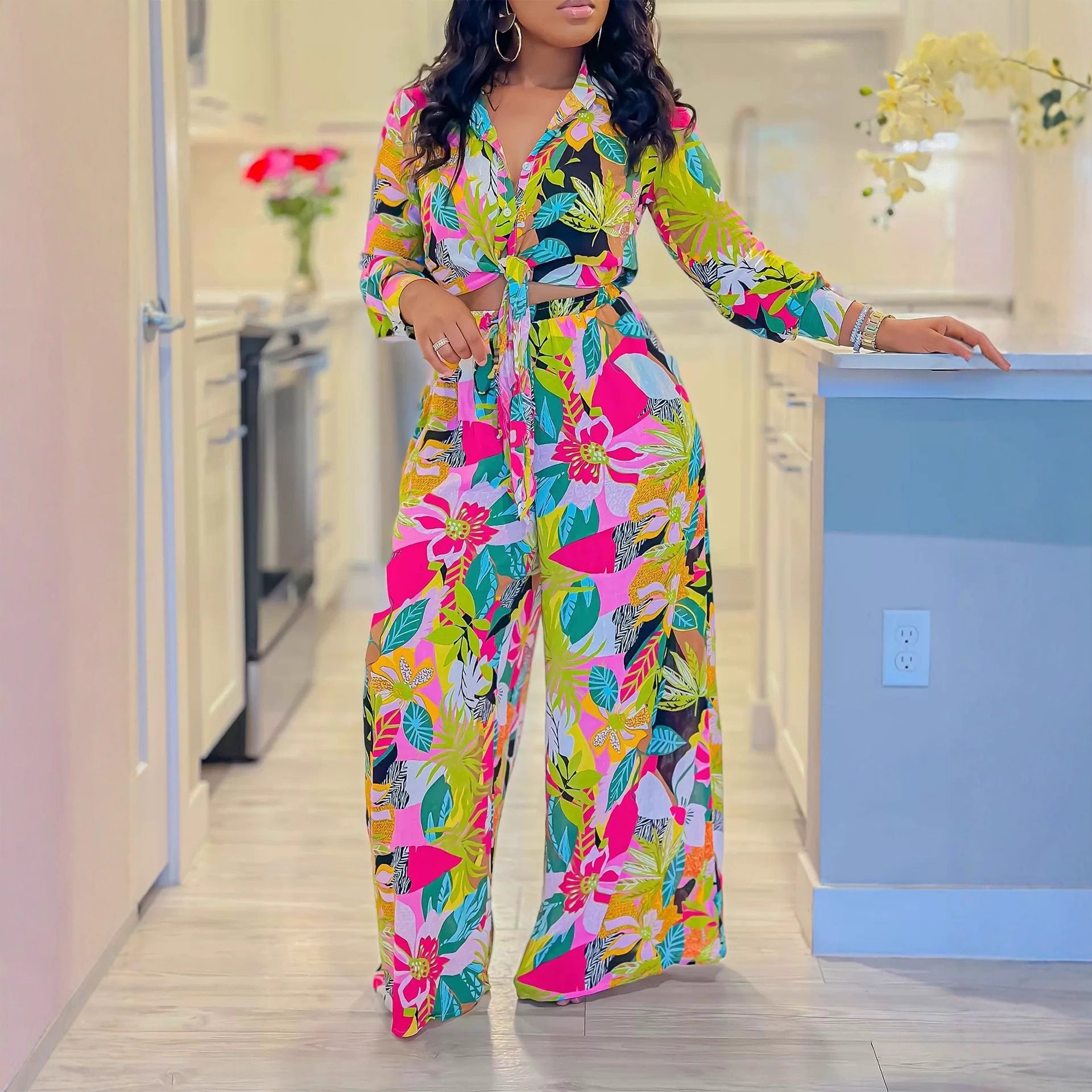 2025 foreign trade women's clothing Amazon's new fashion printing two-piece set lapel strap shirt wide-leg pants set