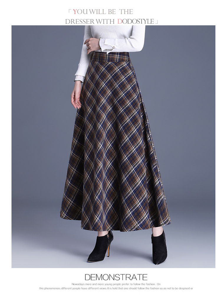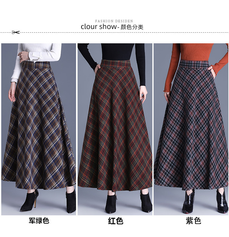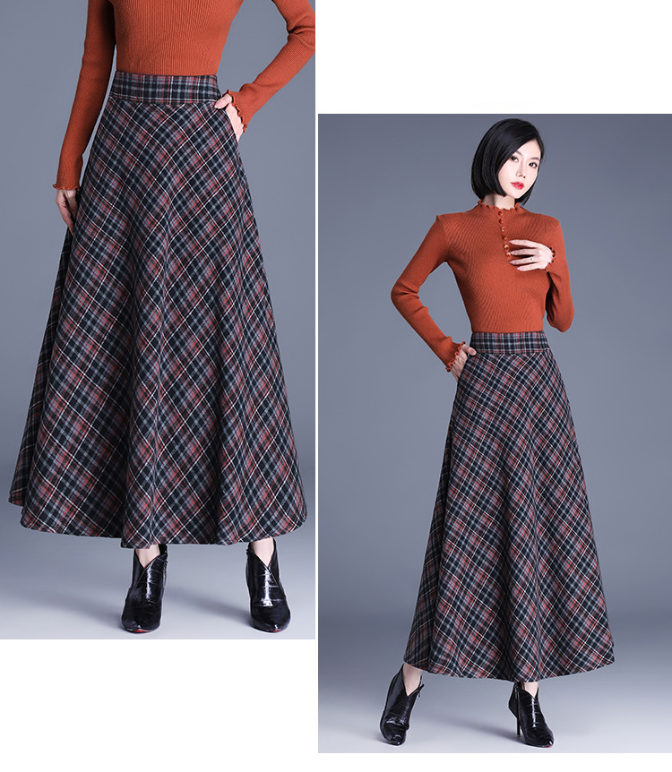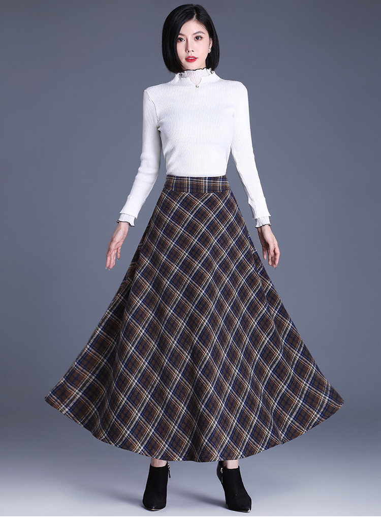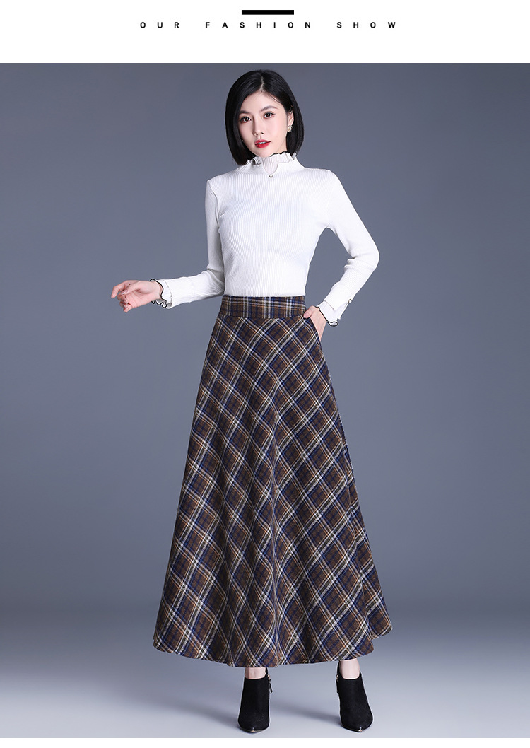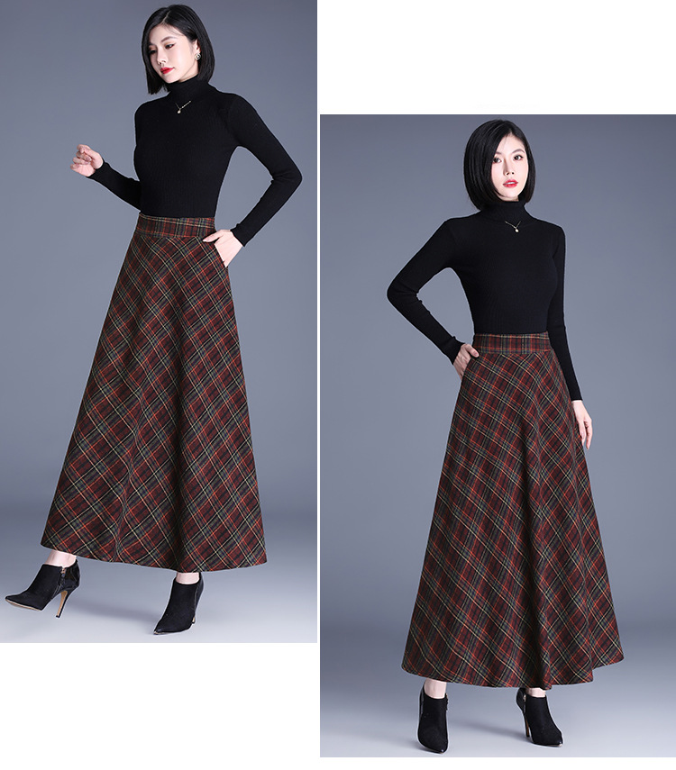 2025 medium and long woolen plaid skirt autumn and winter Korean version thin pleated skirt thickened woolen swinging A-shaped skirt