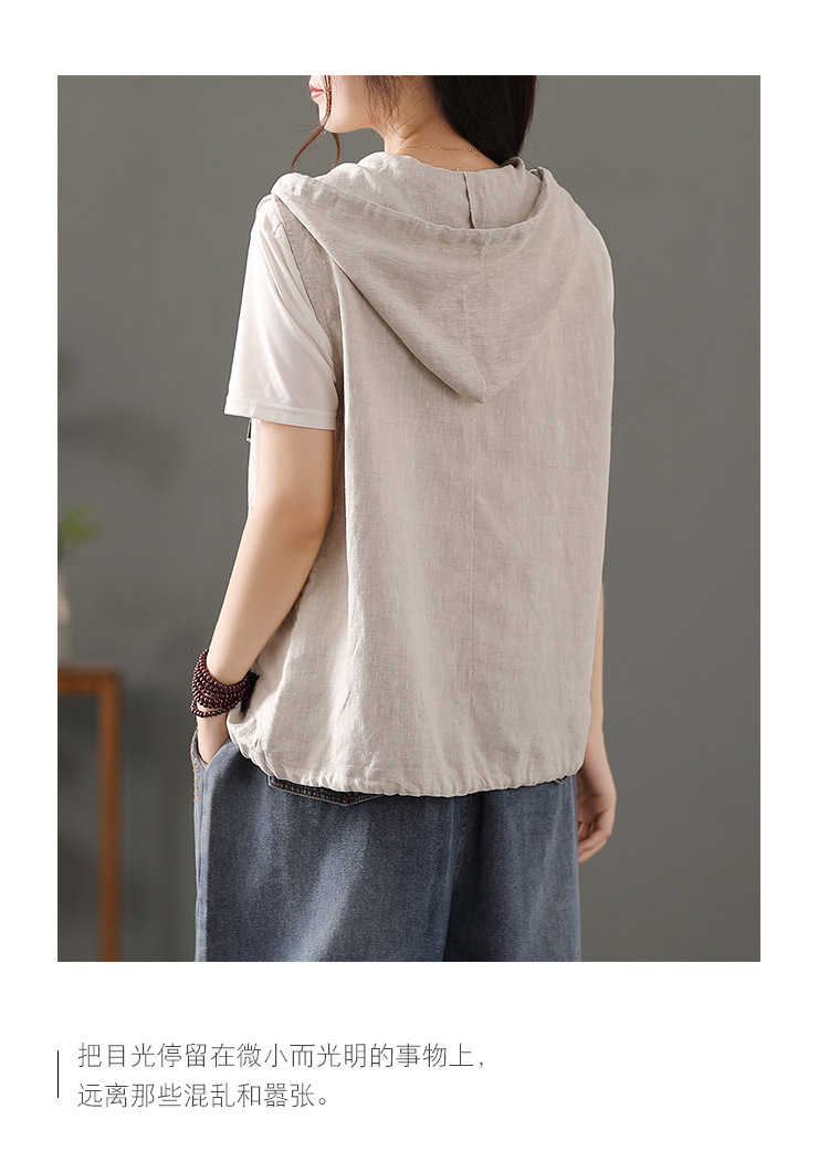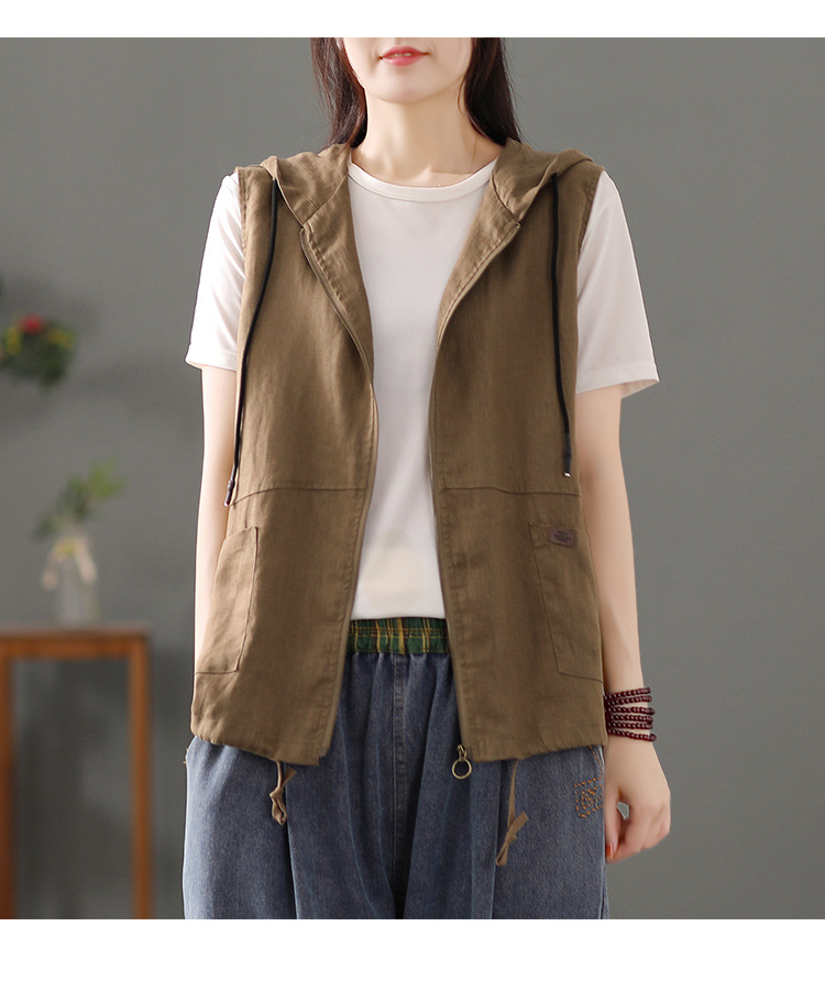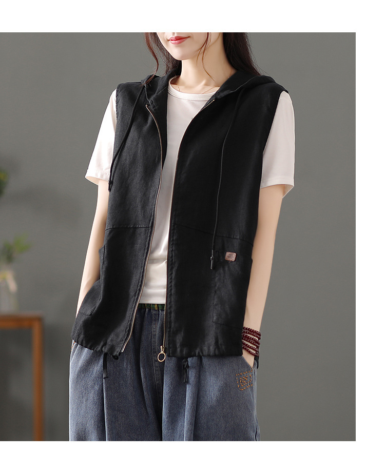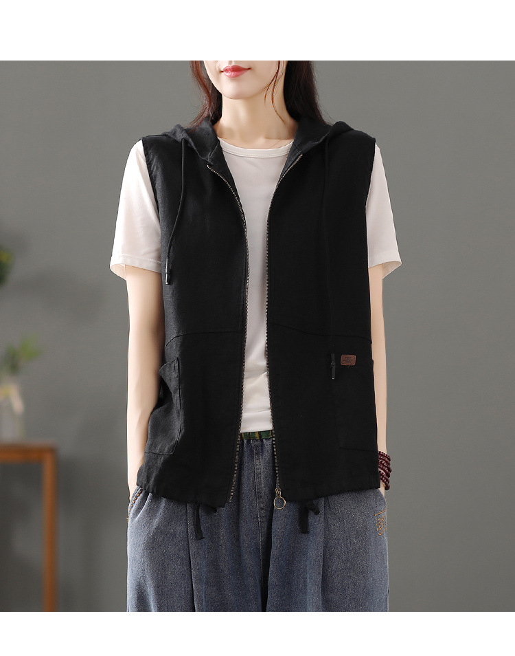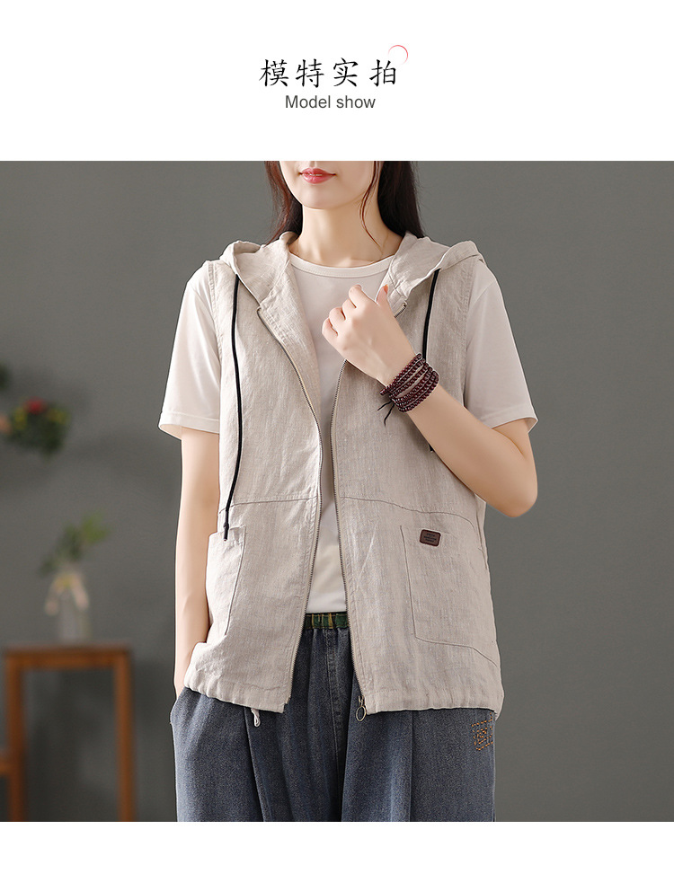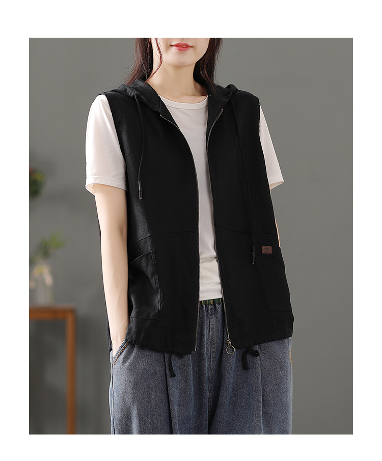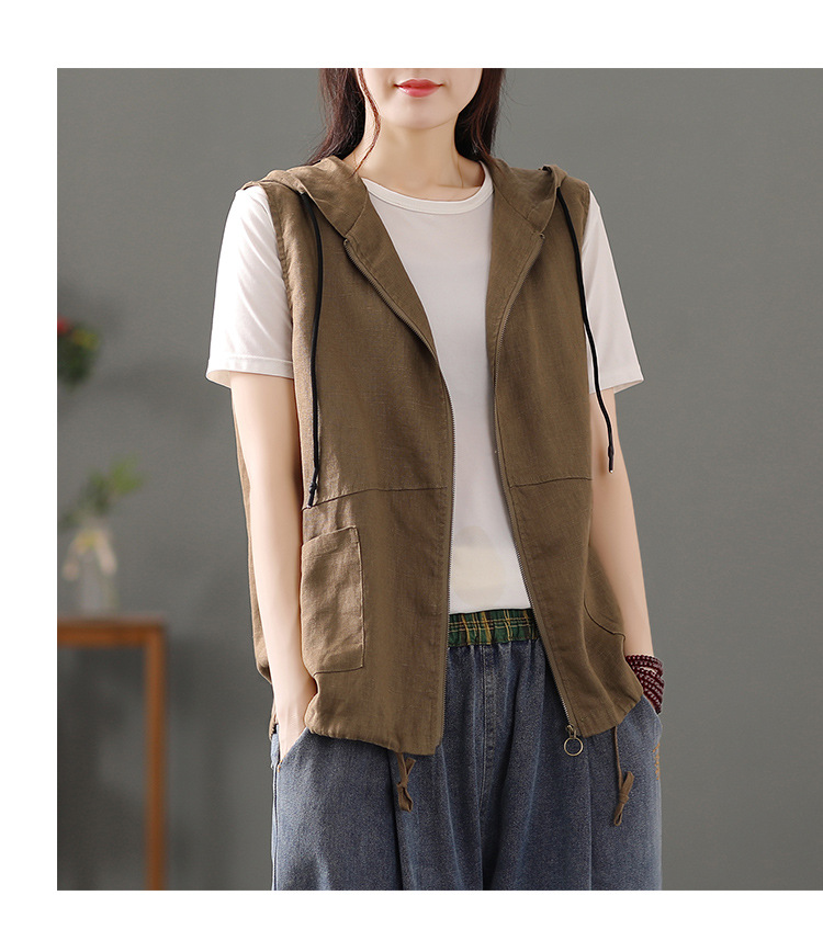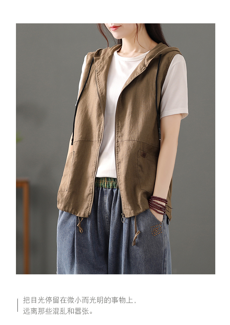 2025 spring new literary and retro loose solid color hooded cardigan vest casual sleeveless vest short coat women