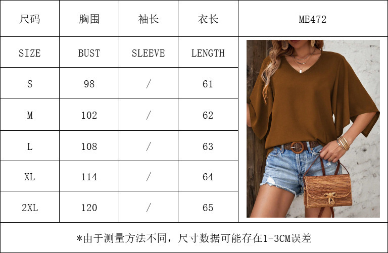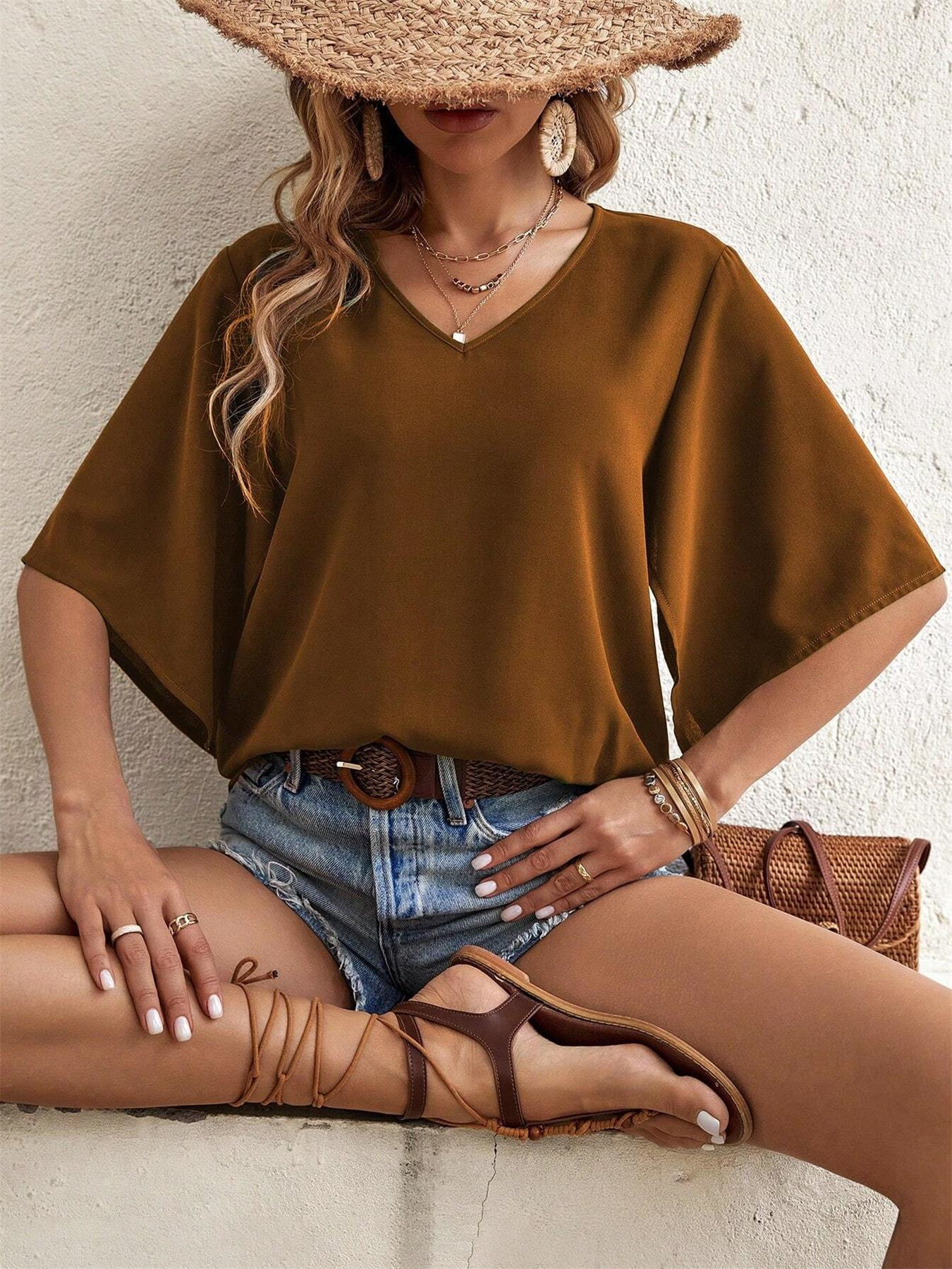 2025 summer European and American cross-border women's clothing Amazon independent station new fashion solid color V-neck bat sleeve top women