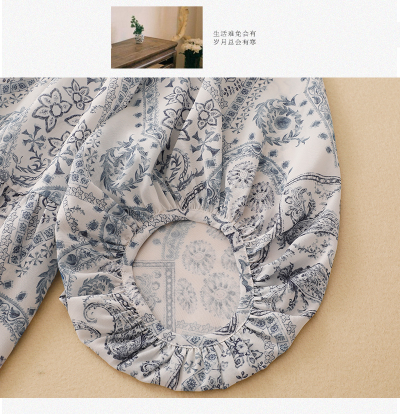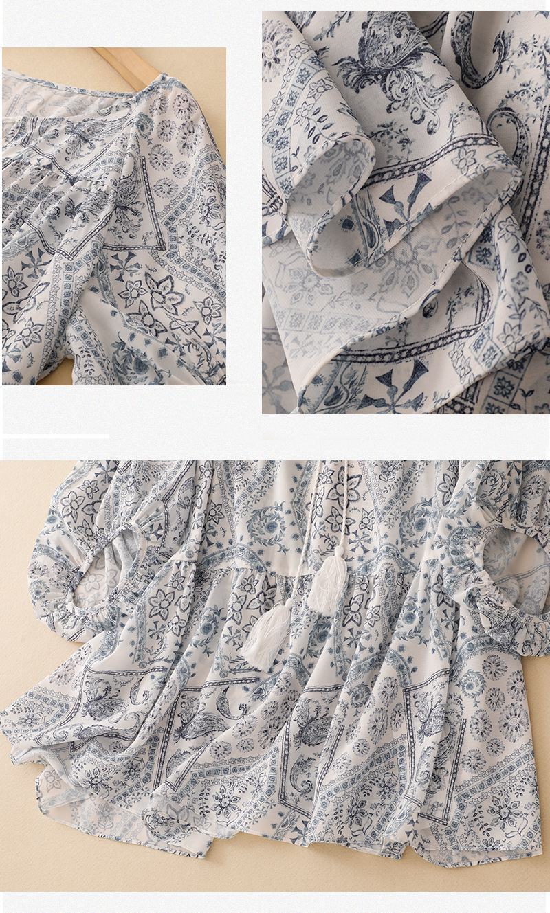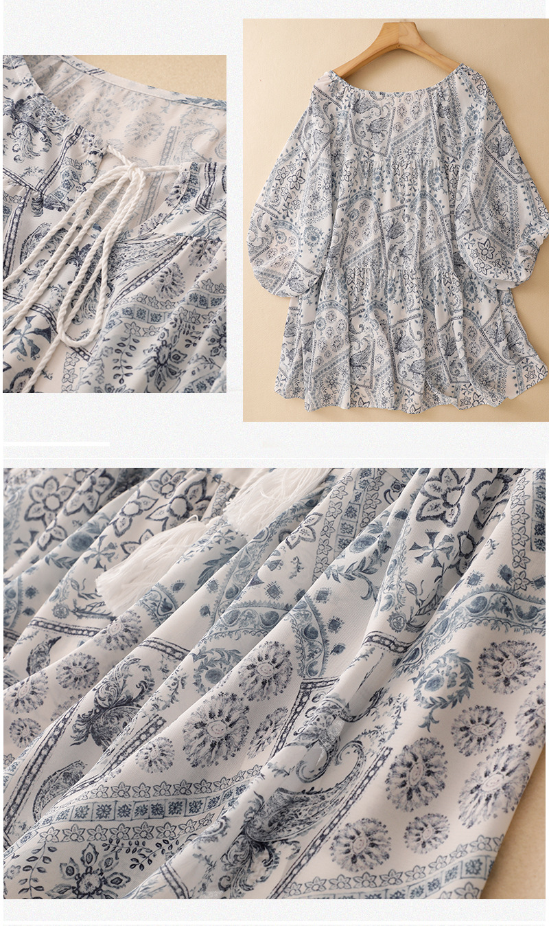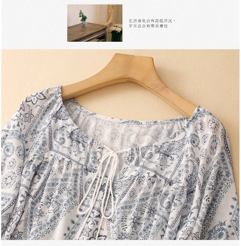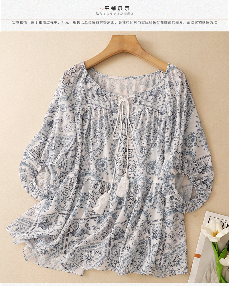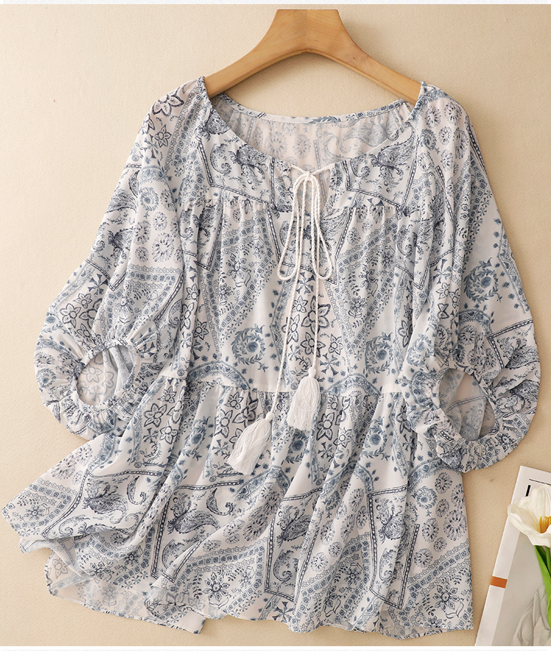 2025 summer new blue island print loose ethnic retro color short-sleeved shirt top women