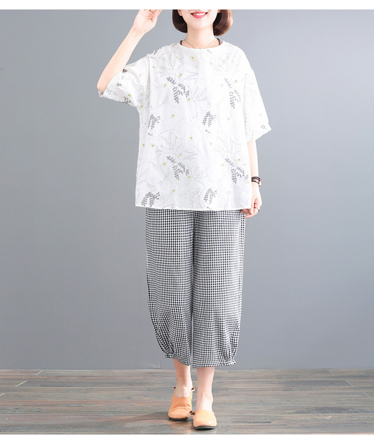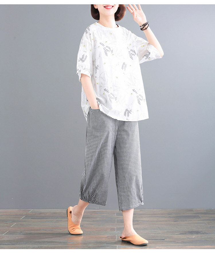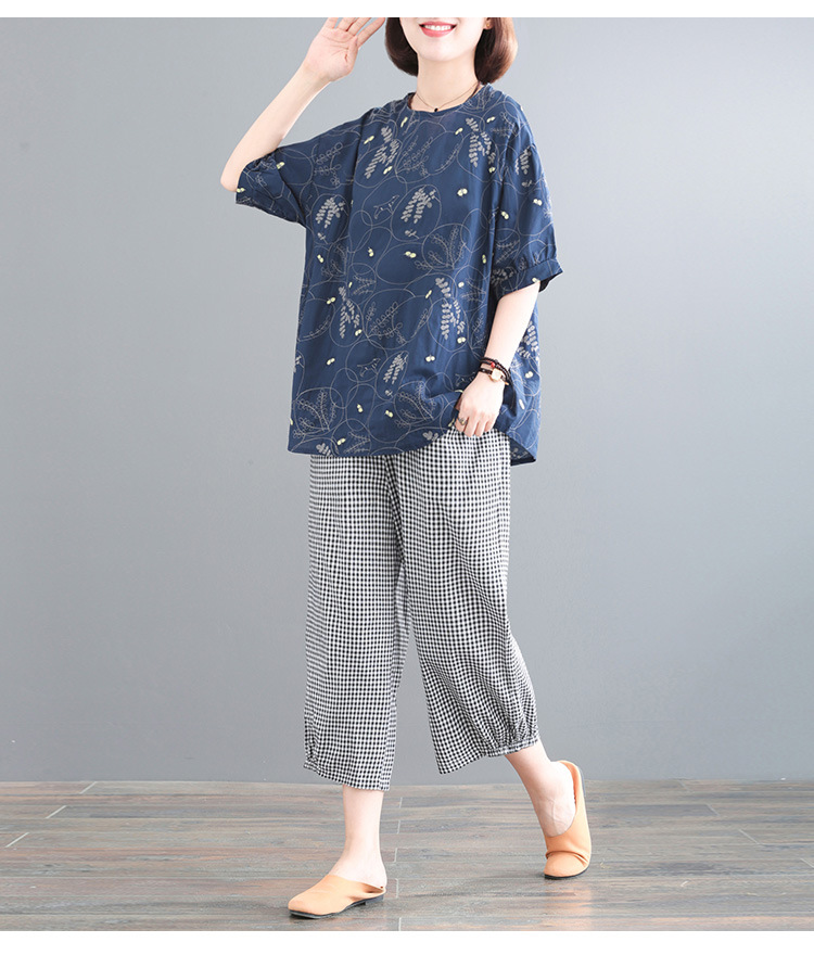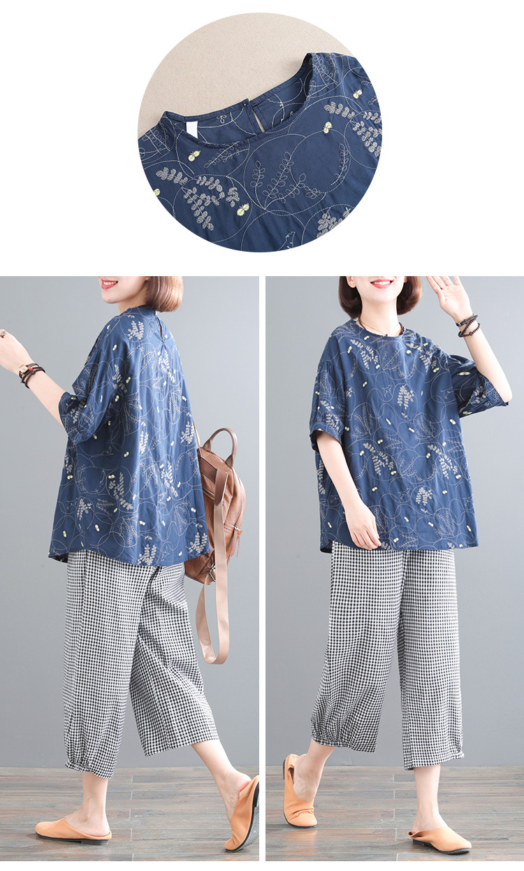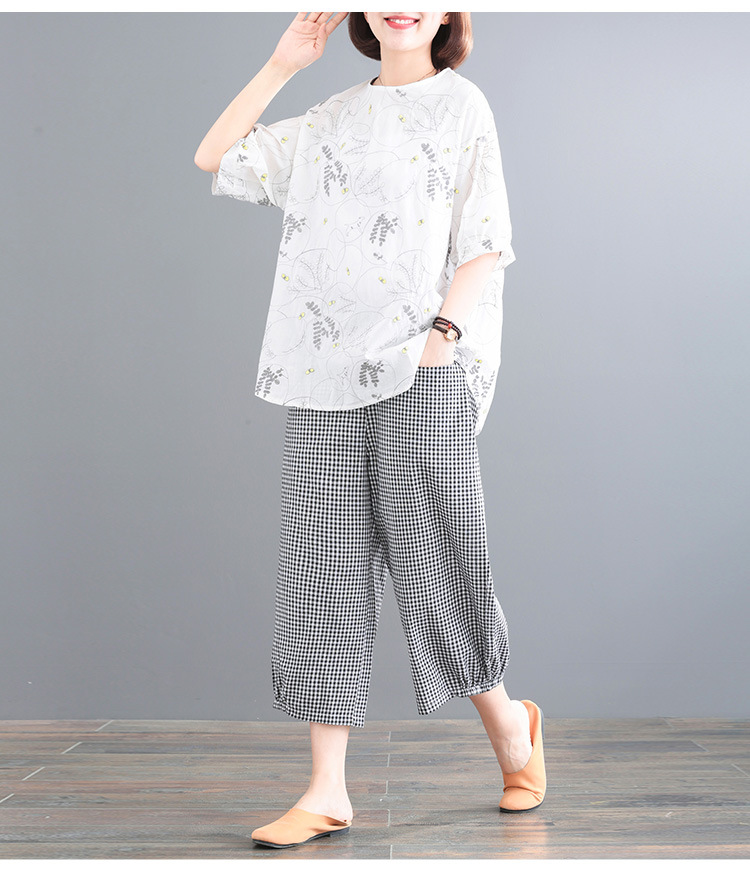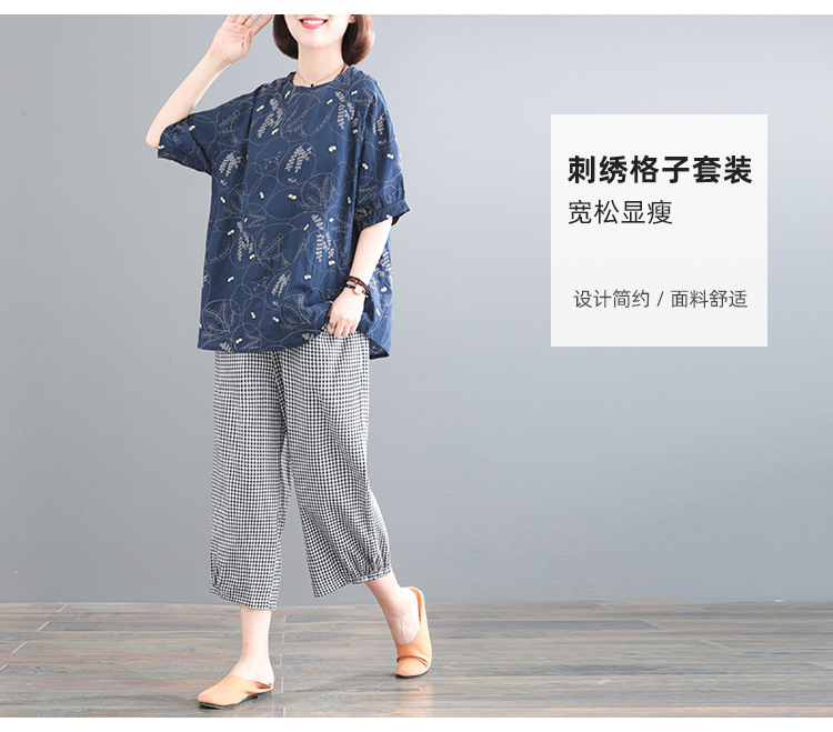 2025 summer new cotton and linen large size literary and retro loose embroidered top + plaid pants set #5541