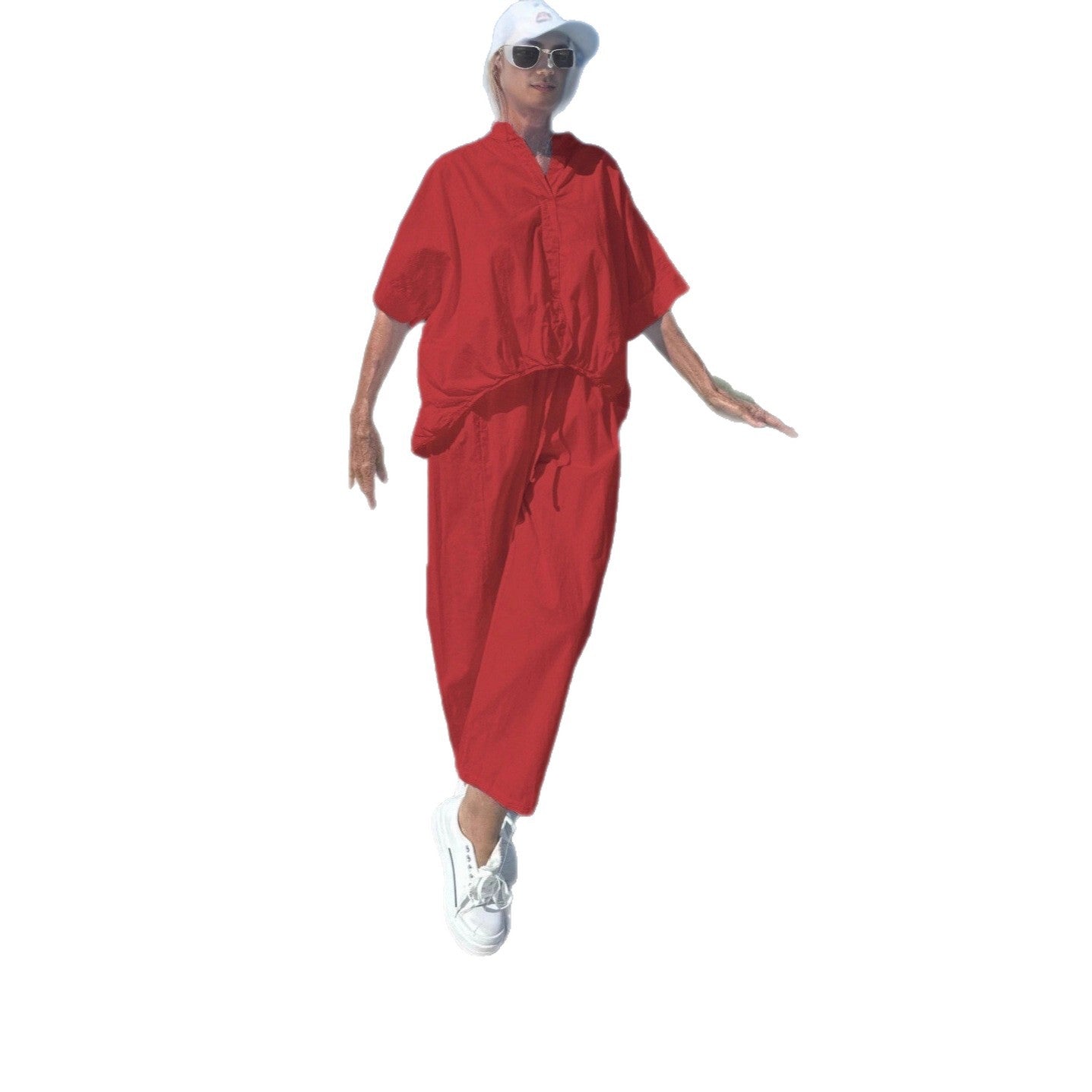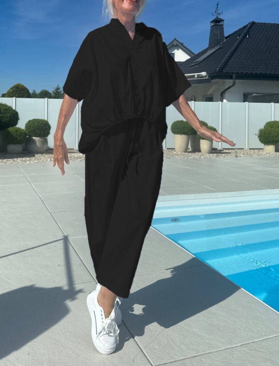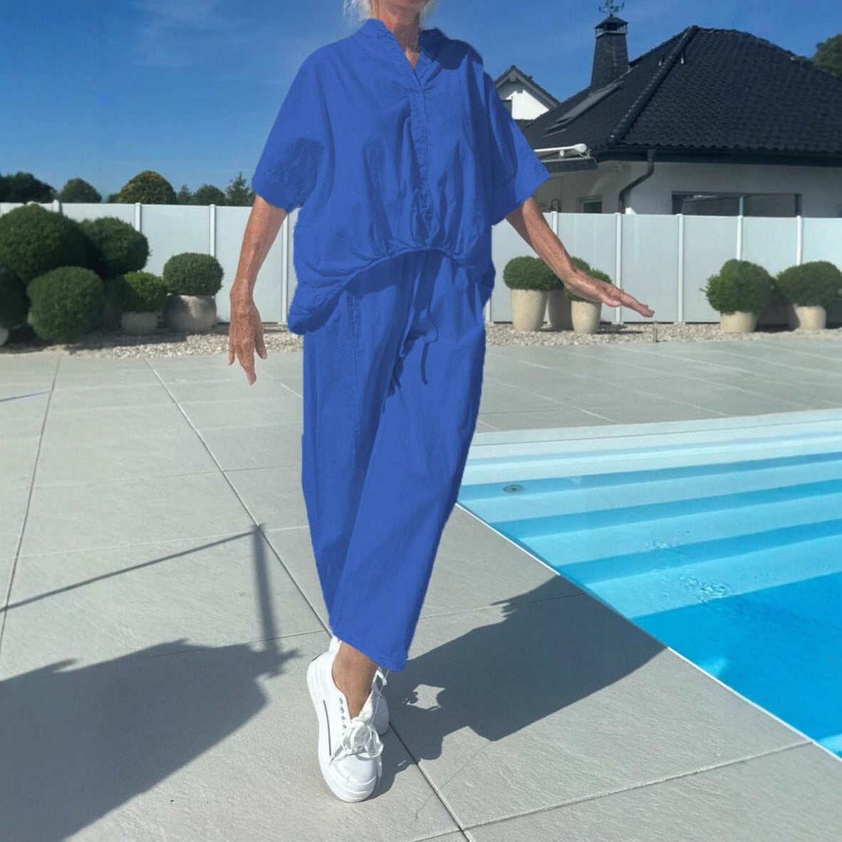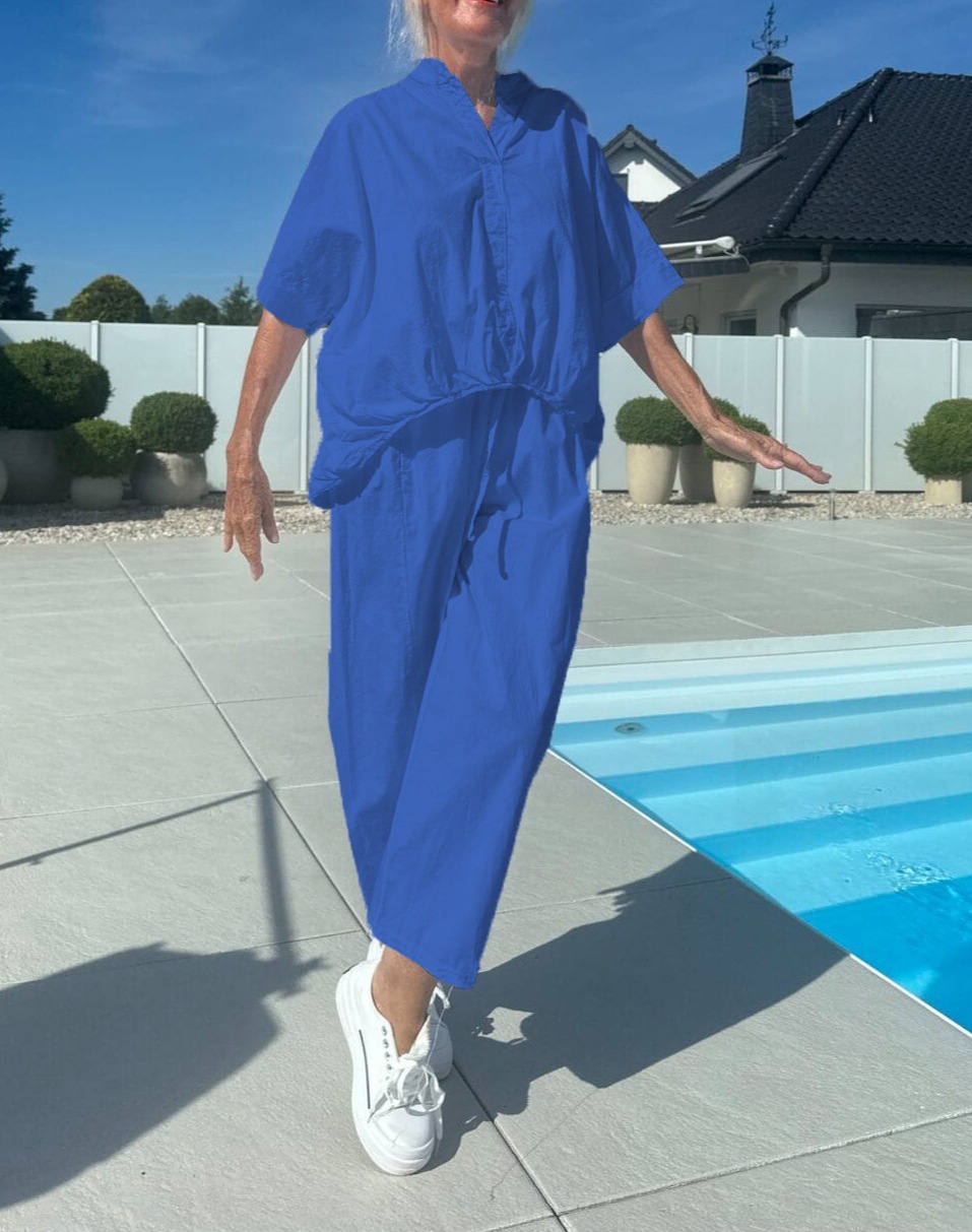 2025 summer new European and American cross-border Amazon simple solid color lapel short-sleeved fashion casual shirt set