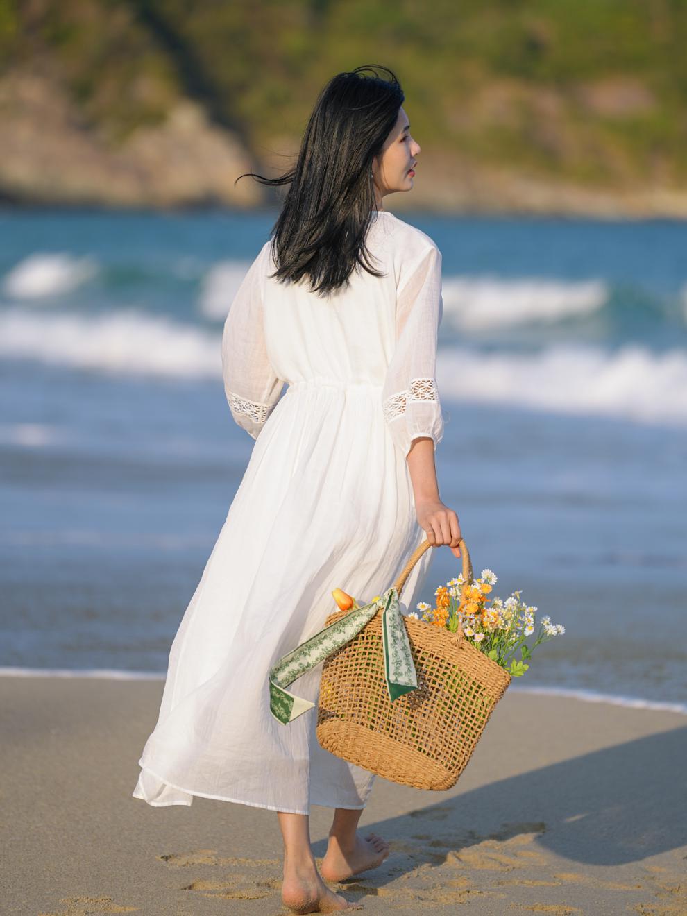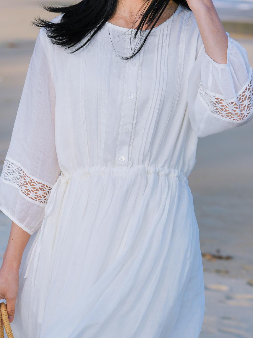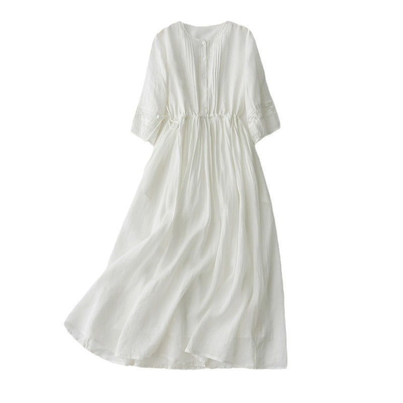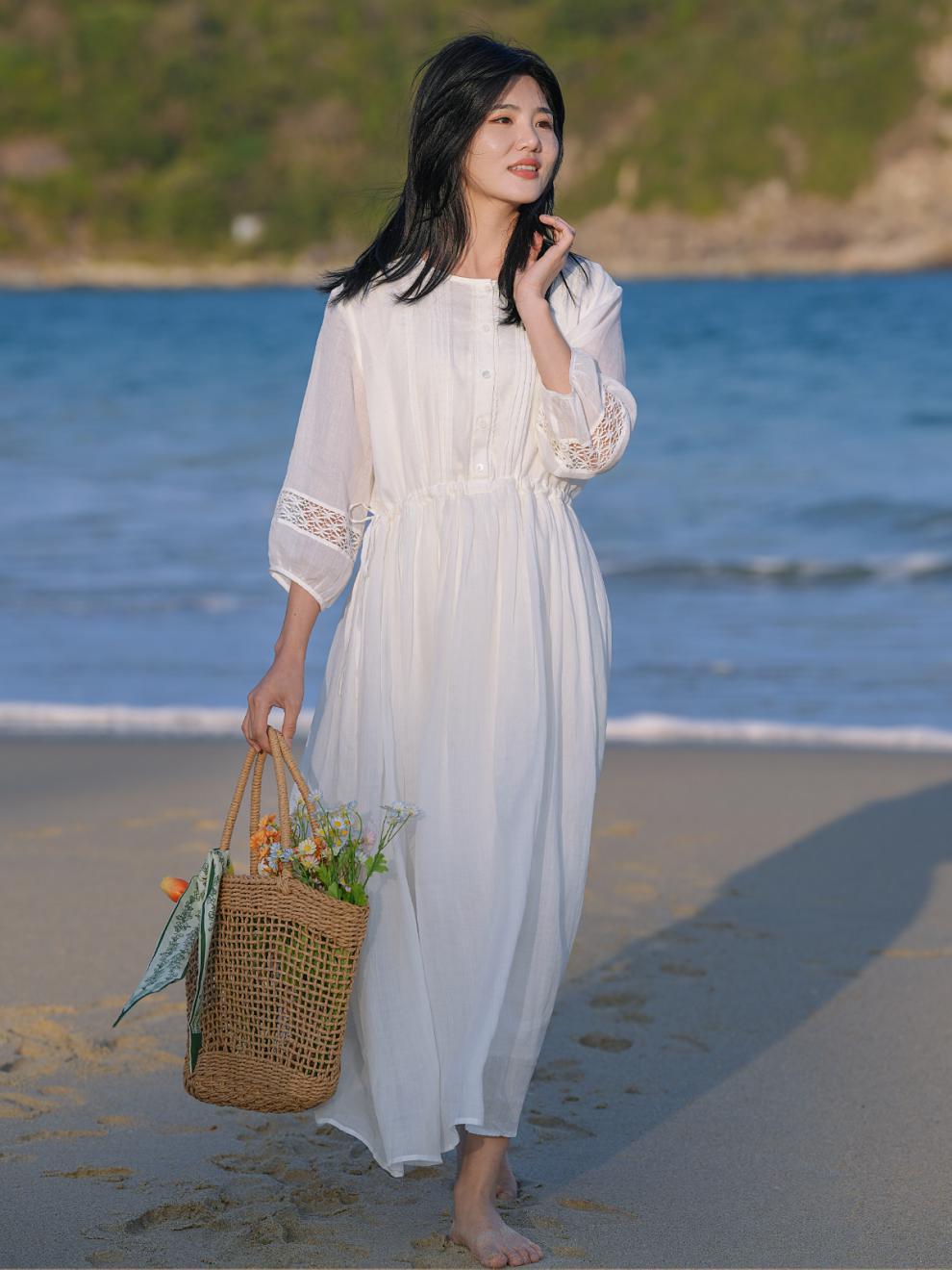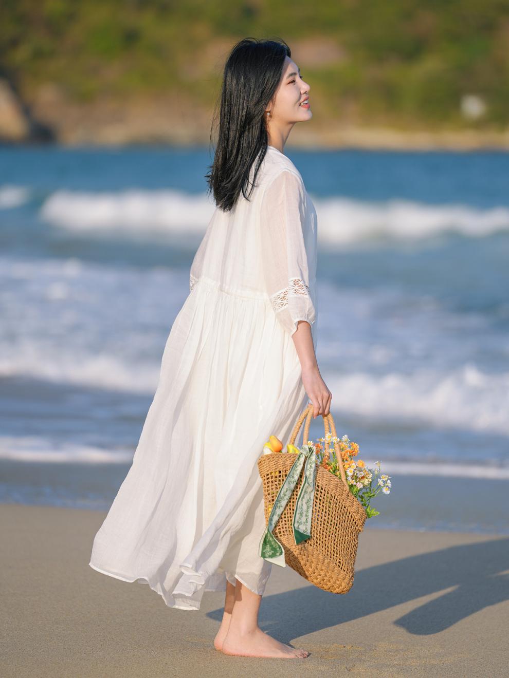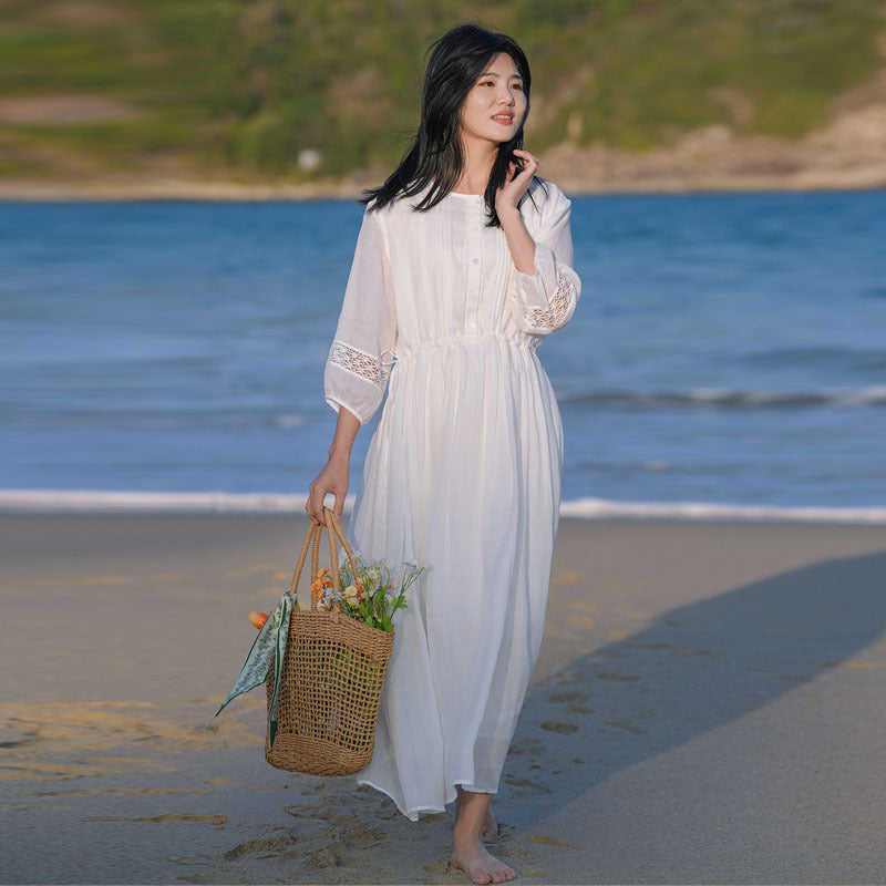 2025 summer new literary loose large size elegant pendulum solid color seven-quarter sleeve dress women's beach dress #701