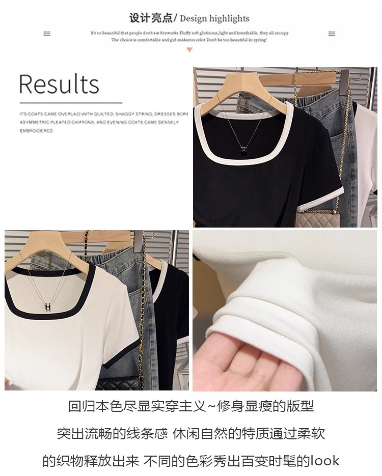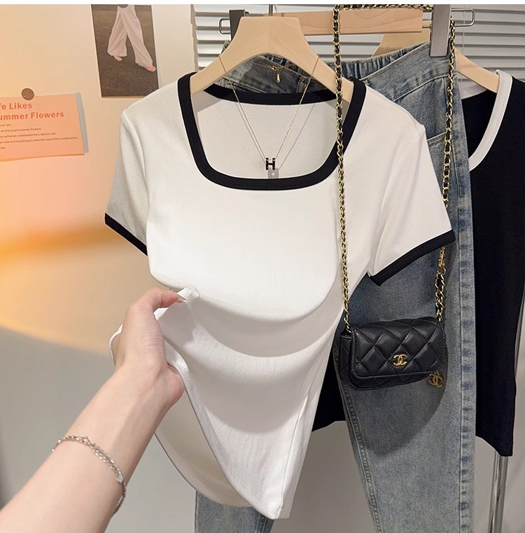 2025 Summer White Threaded Square Neck Large Neckline Contrasting Short Sleeve T-Shirt Women's Trend Slim Top Bottom Shirt