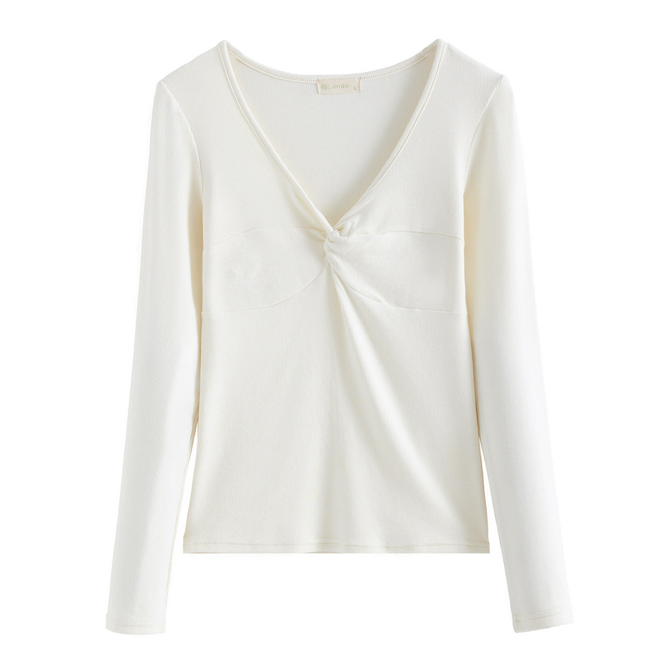 260g优可丝气质深V领扭结长袖T恤女秋装新款美式辣妹纯欲红色上衣