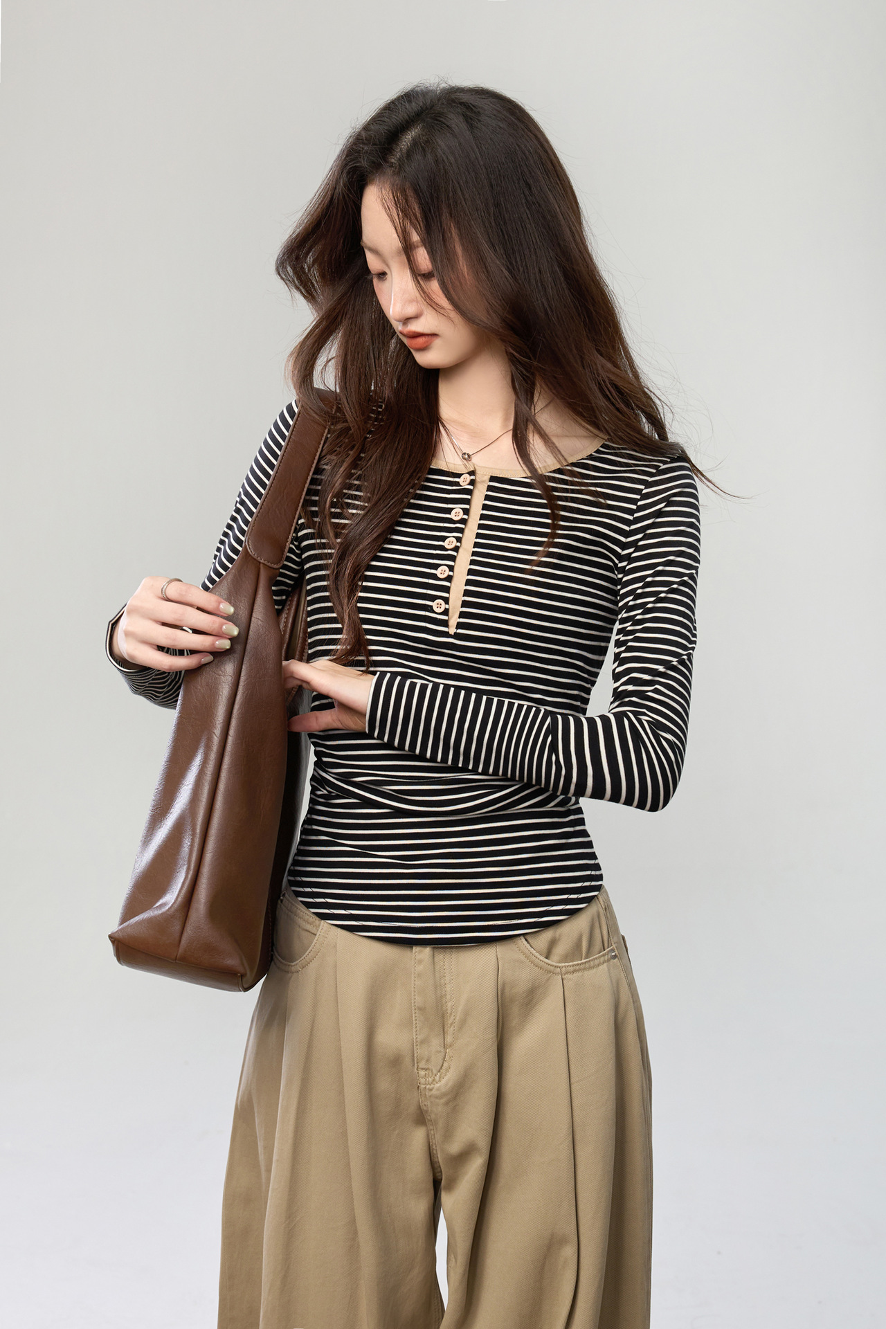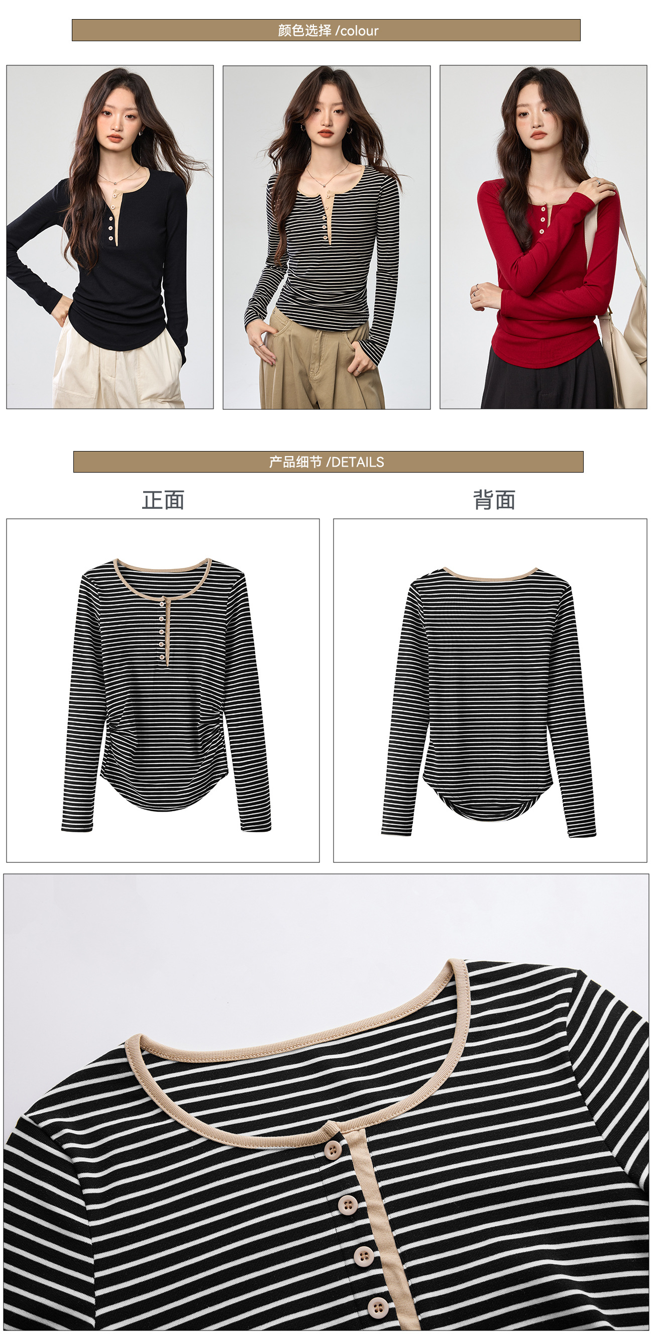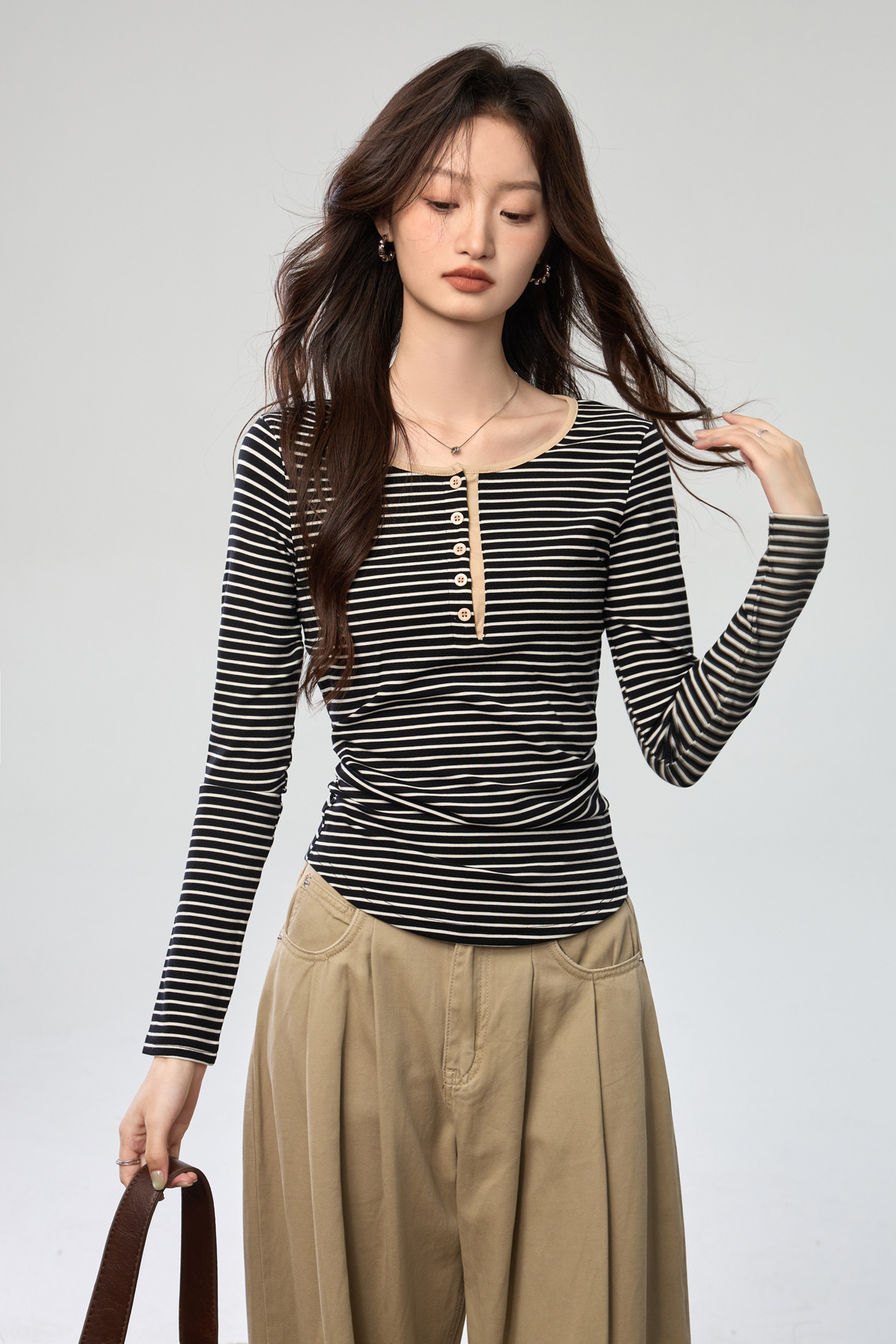260G Tencel Lyocell, Design Sense Striped Bottom Shirt Women's Long Sleeve Pleated Waist Button Contrast T-Shirt Top