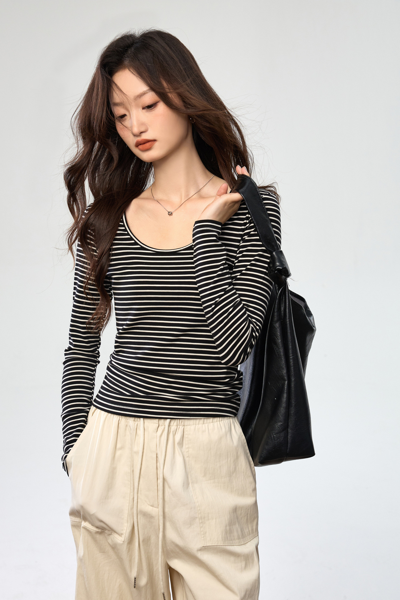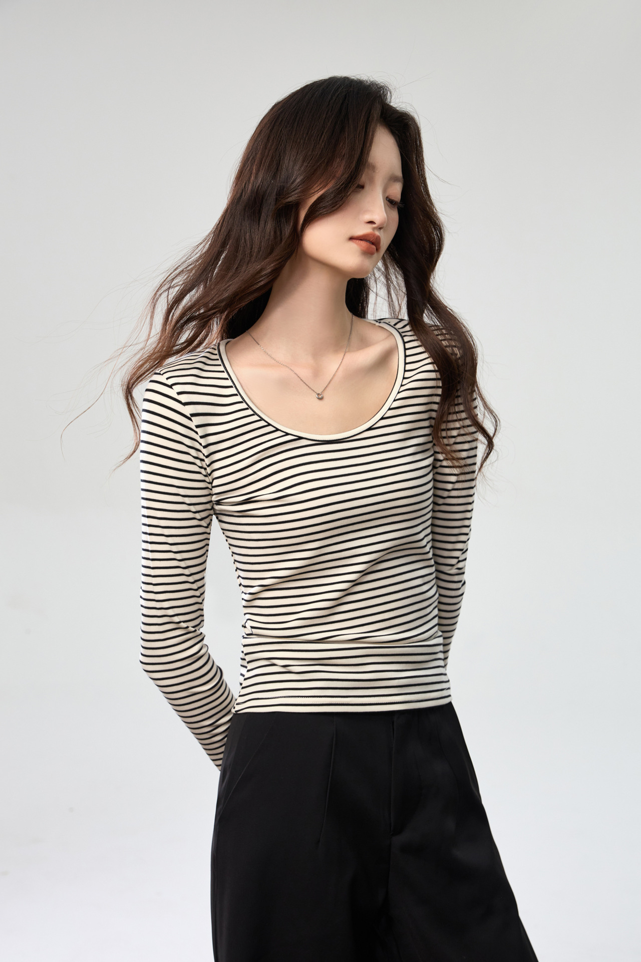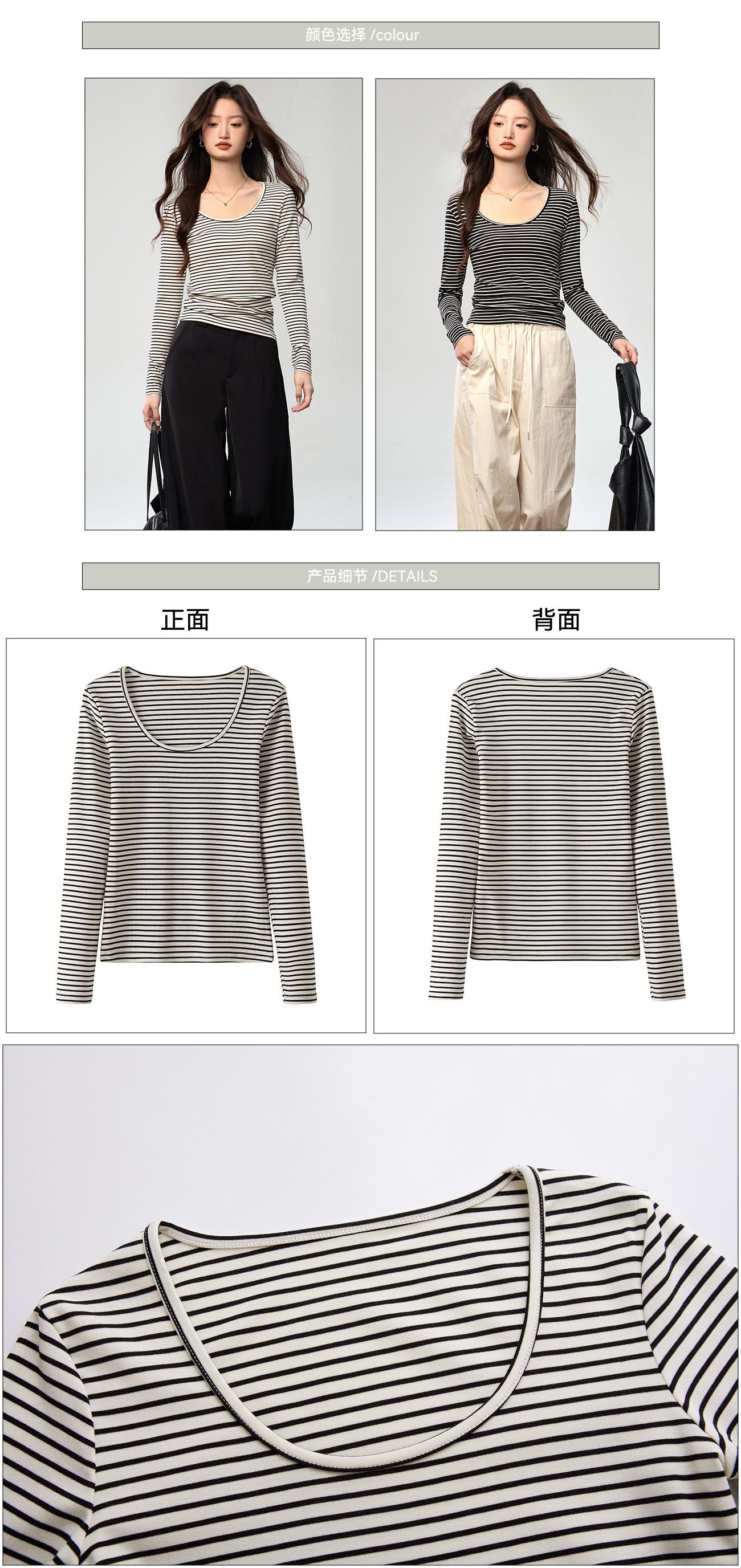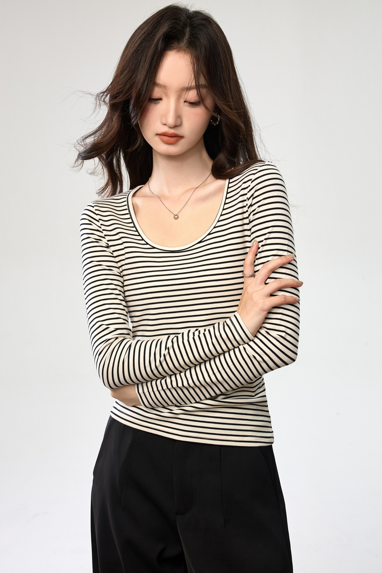 260G Tencel Lyocell Striped Bottom Shirt Women's Long Sleeve T-Shirt 2026 Autumn New Big U-Neck Versatile Shoulder Top