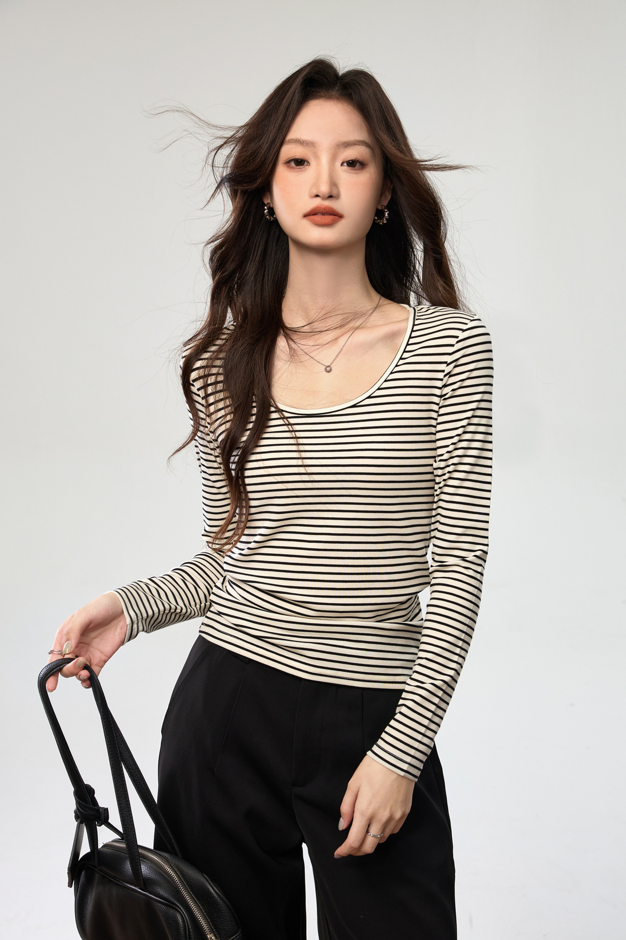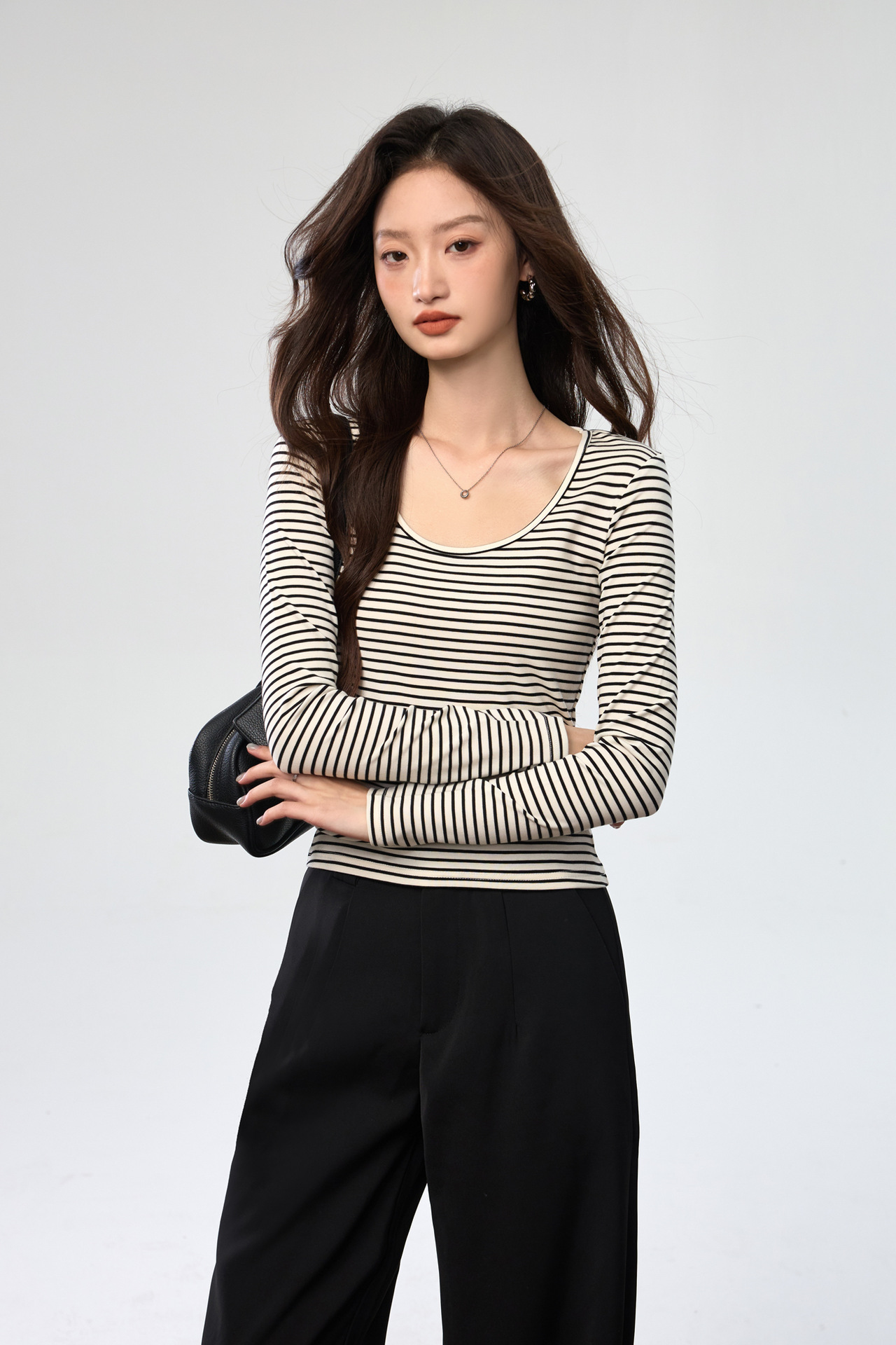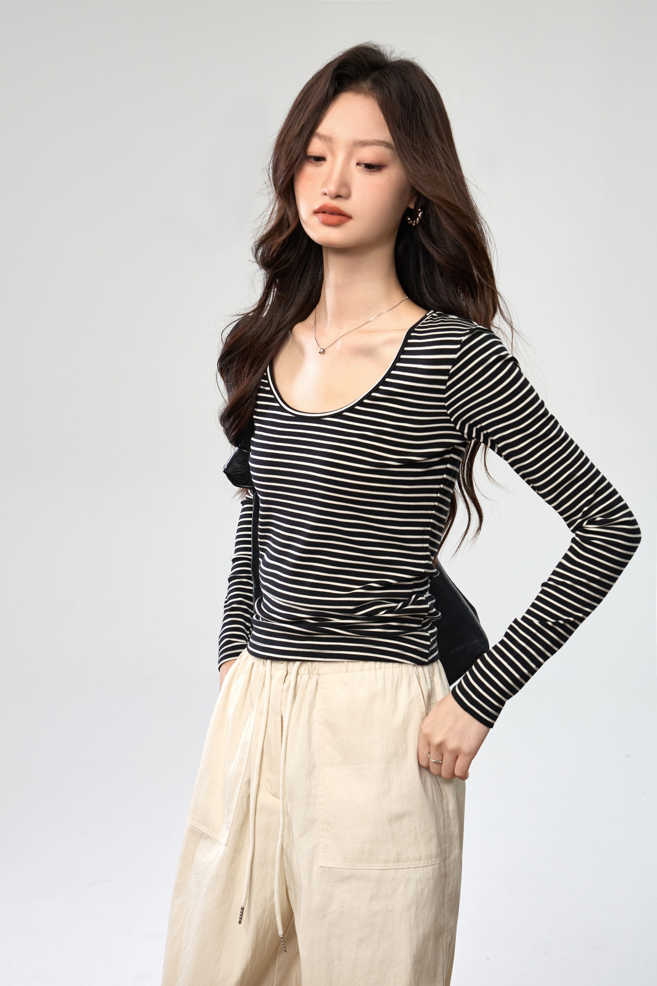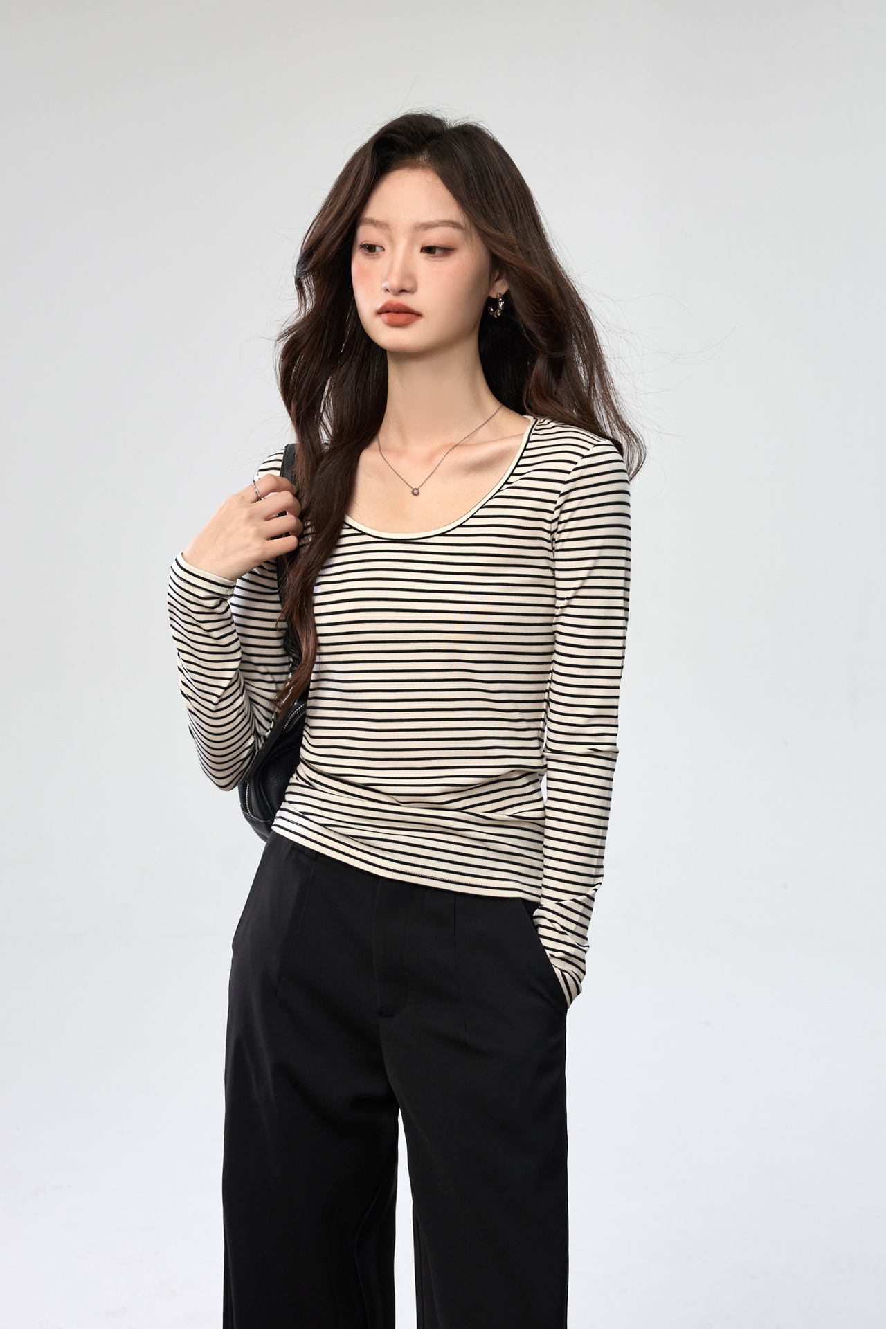 260G Tencel Lyocell Striped Bottom Shirt Women's Long Sleeve T-Shirt 2026 Autumn New Big U-Neck Versatile Shoulder Top