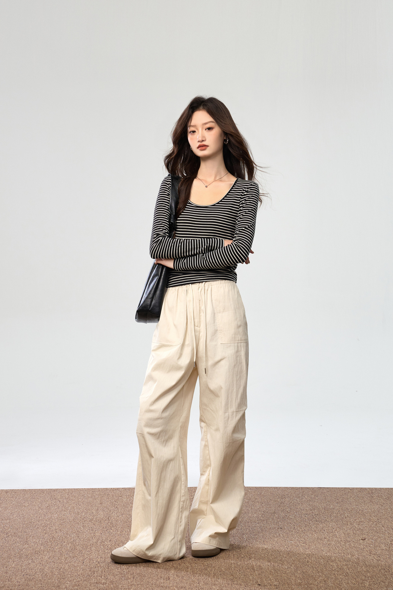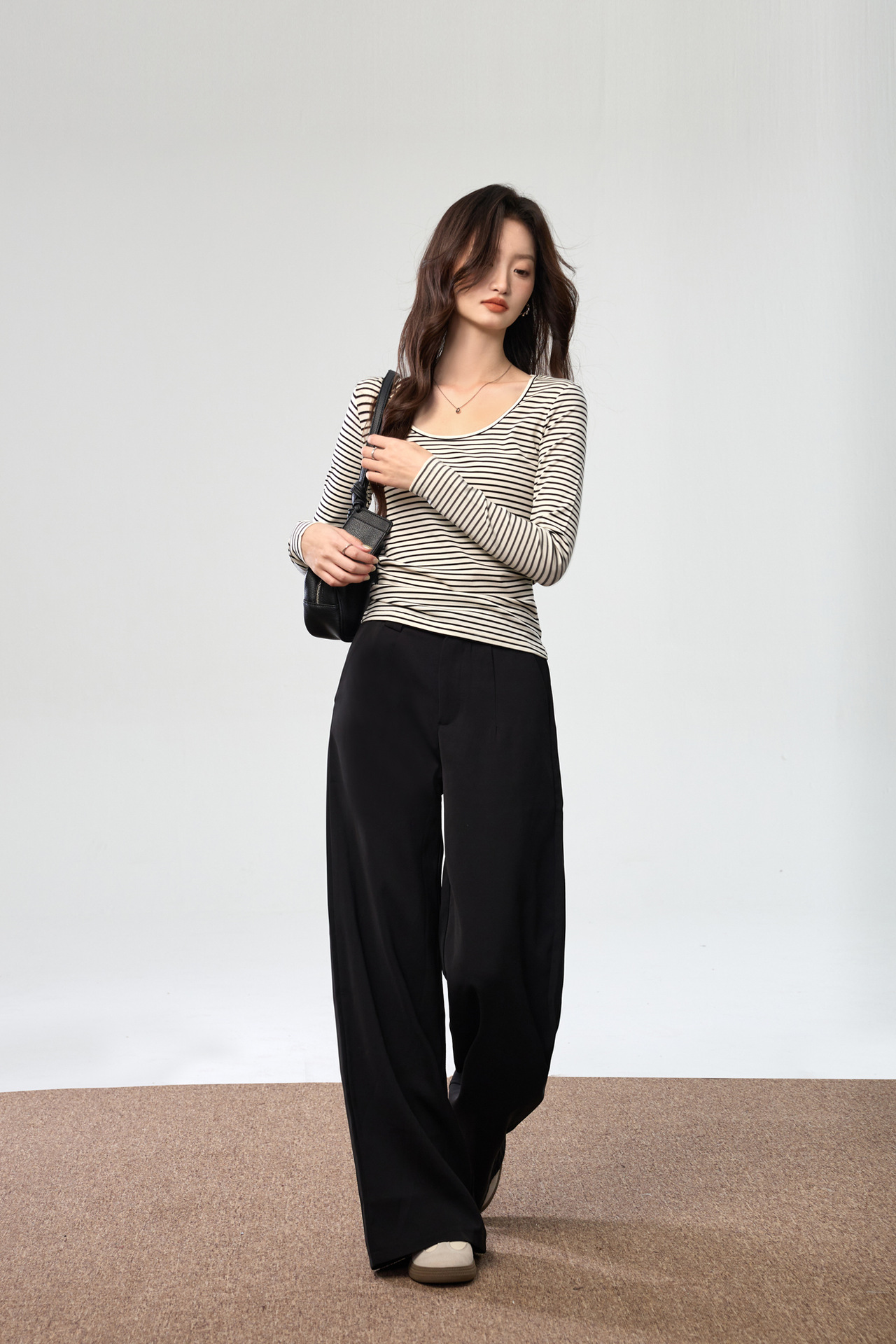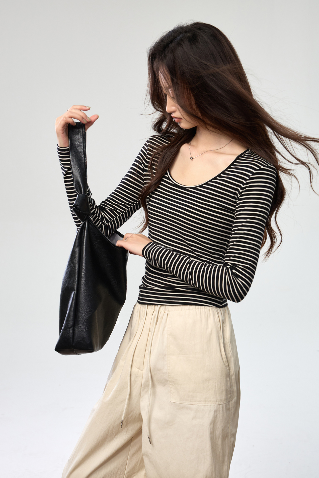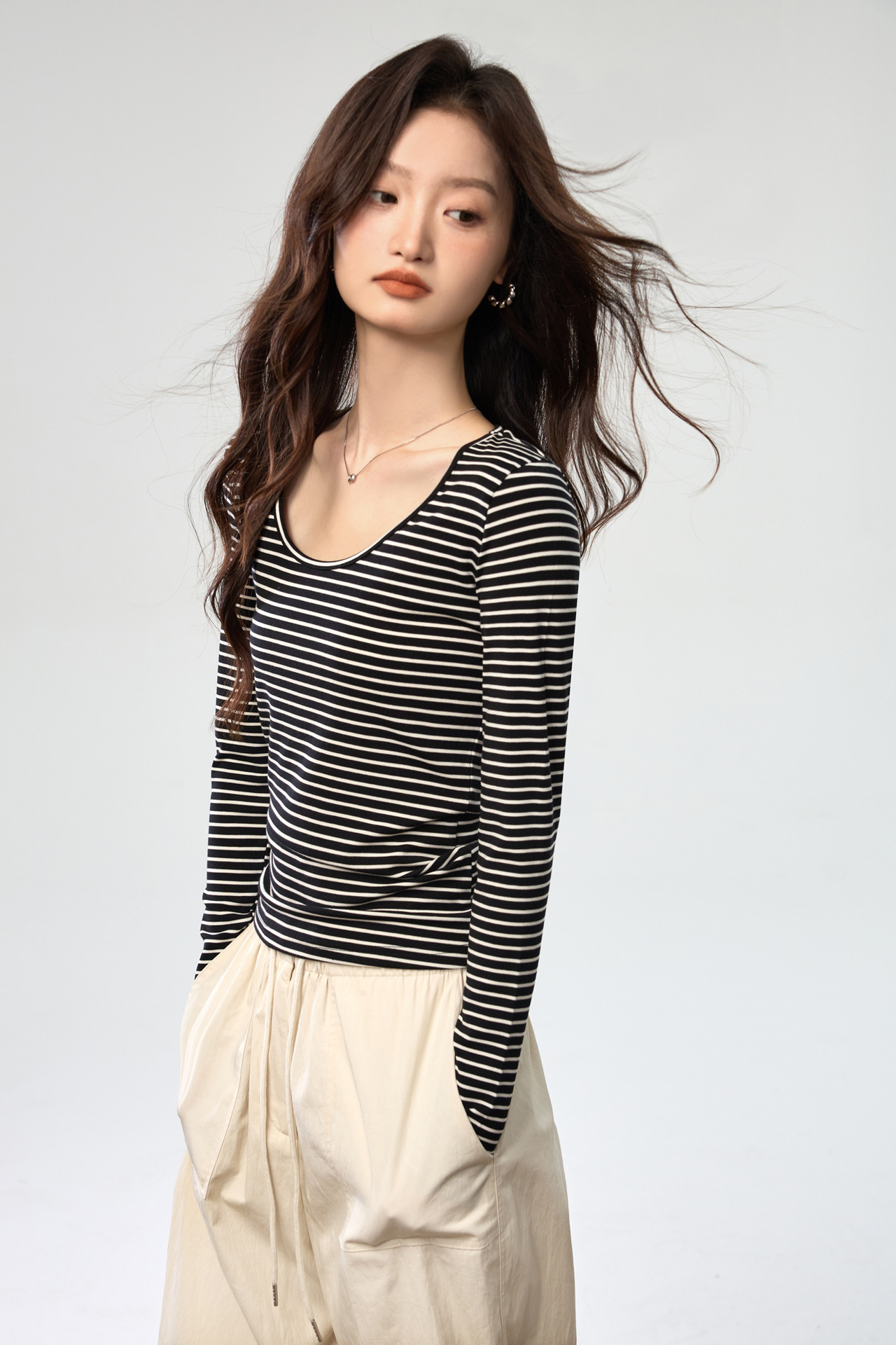 260G Tencel Lyocell Striped Bottom Shirt Women's Long Sleeve T-Shirt 2026 Autumn New Big U-Neck Versatile Shoulder Top