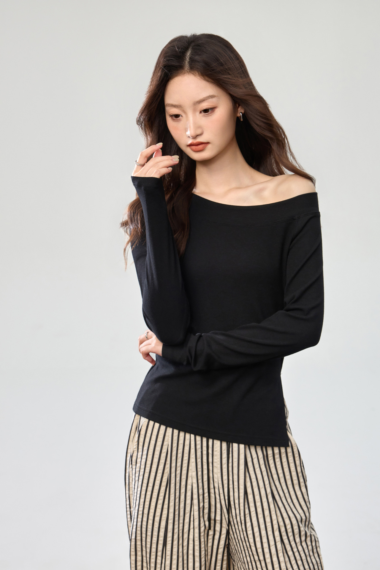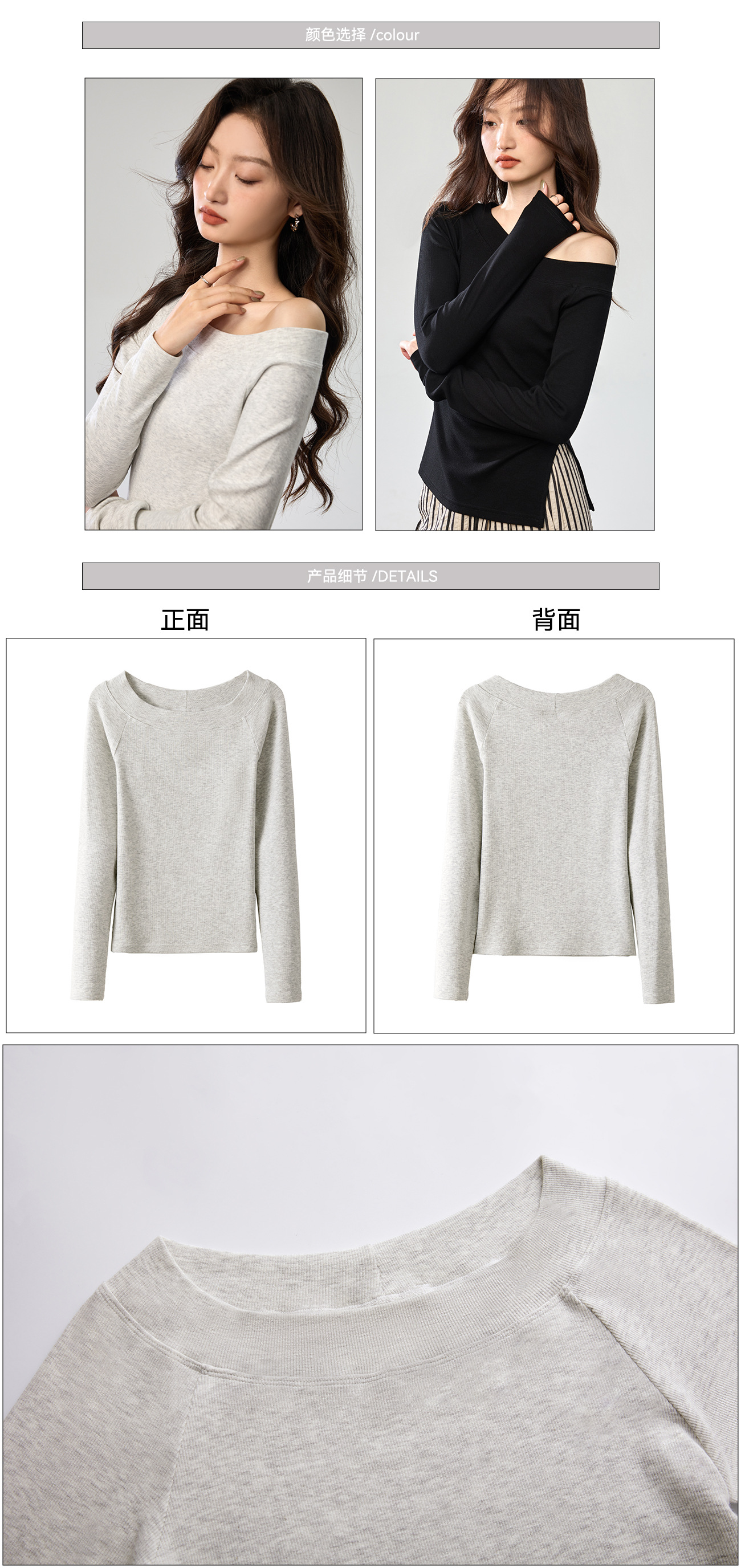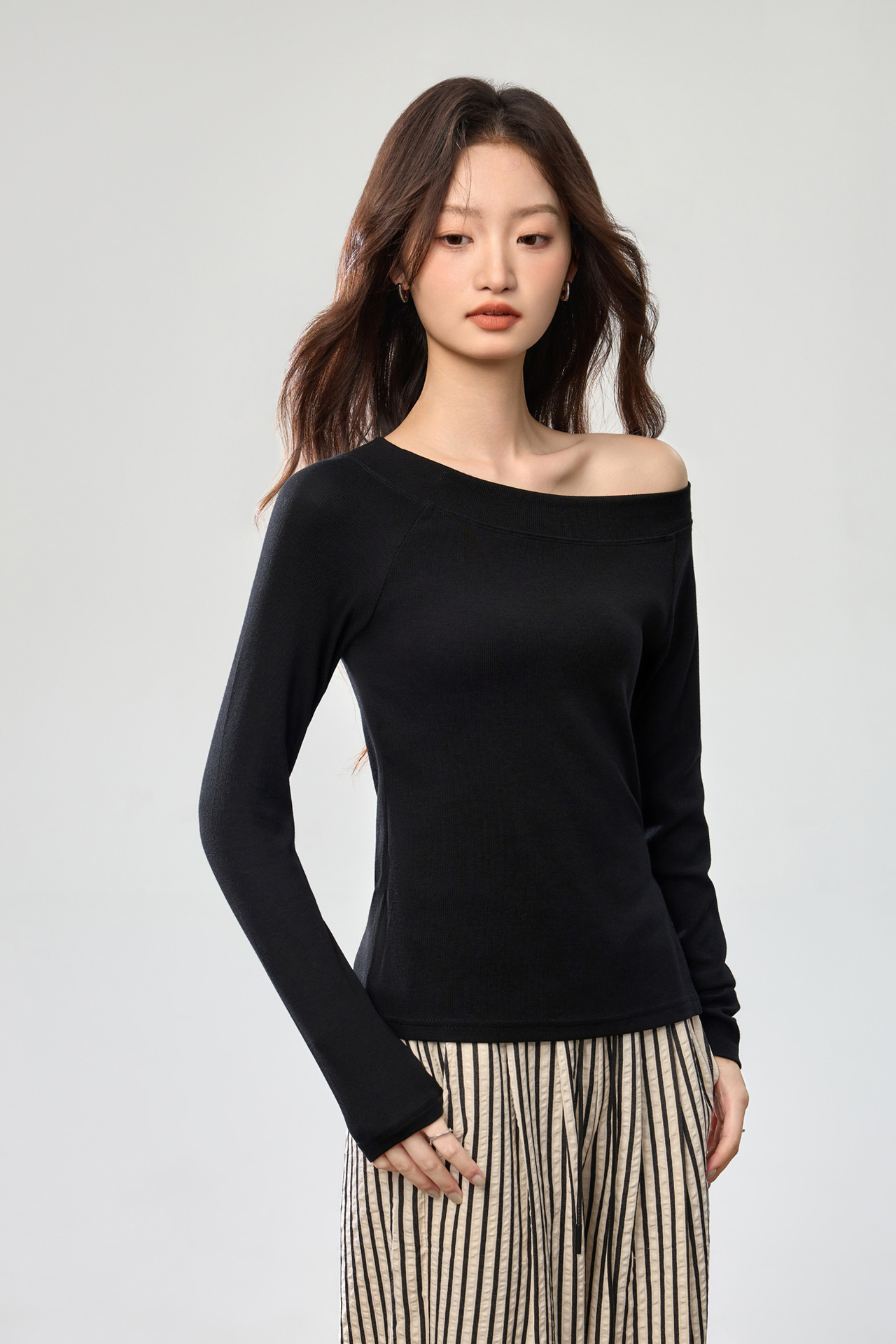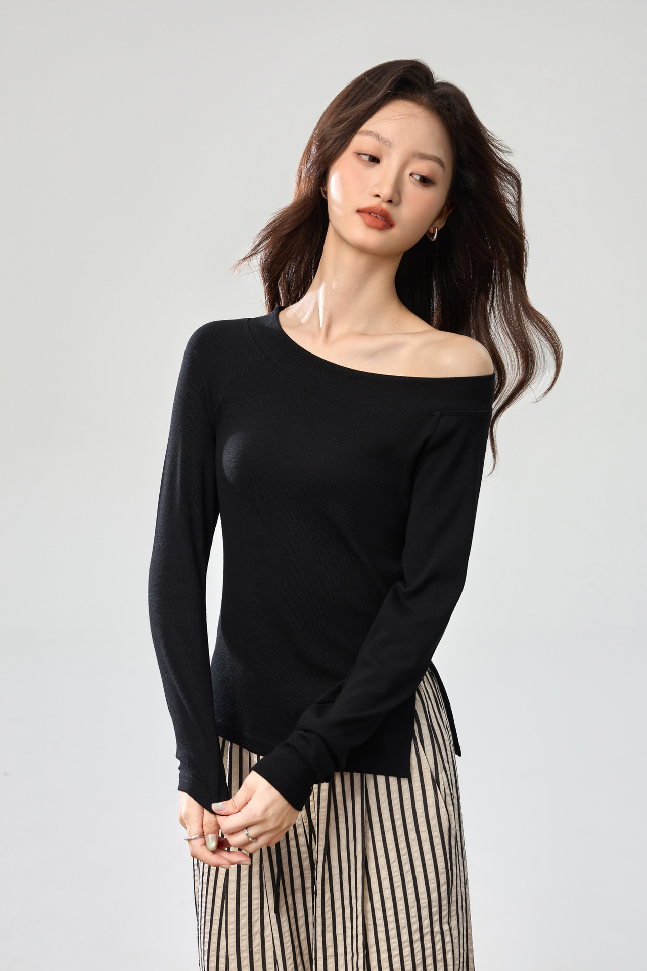 260G Youke silk, two wear one-word collar slanted shoulder temperament fashionable wear with split-ended long-sleeved T-shirt women's autumn bottoming top