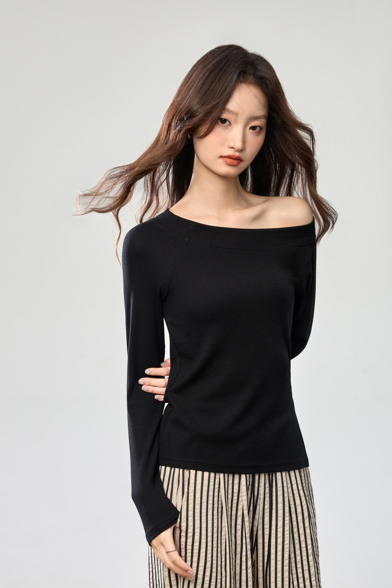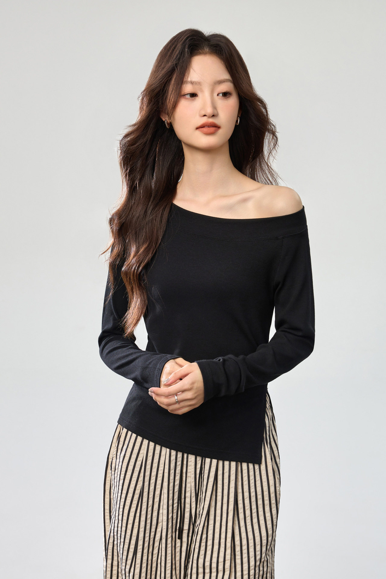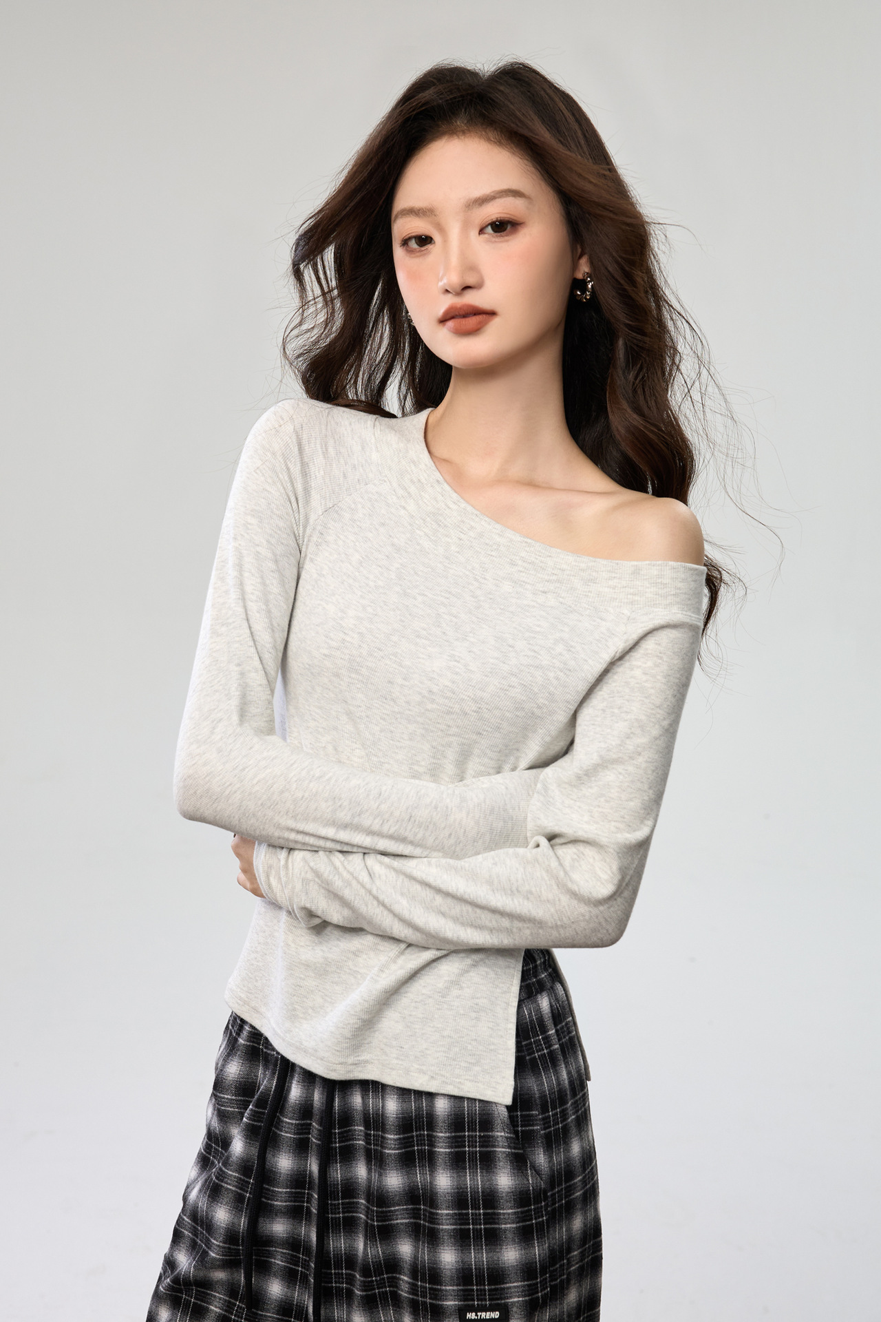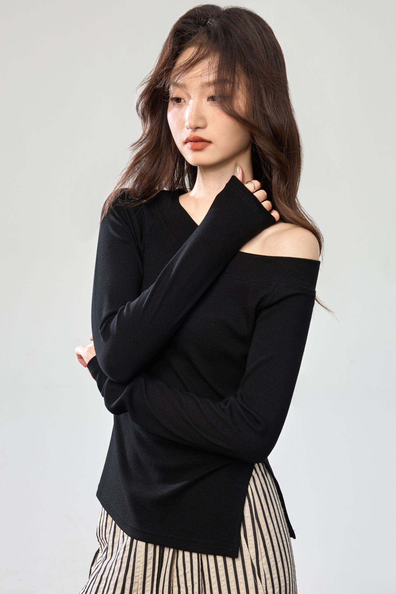 260G Youke silk, two wear one-word collar slanted shoulder temperament fashionable wear with split-ended long-sleeved T-shirt women's autumn bottoming top