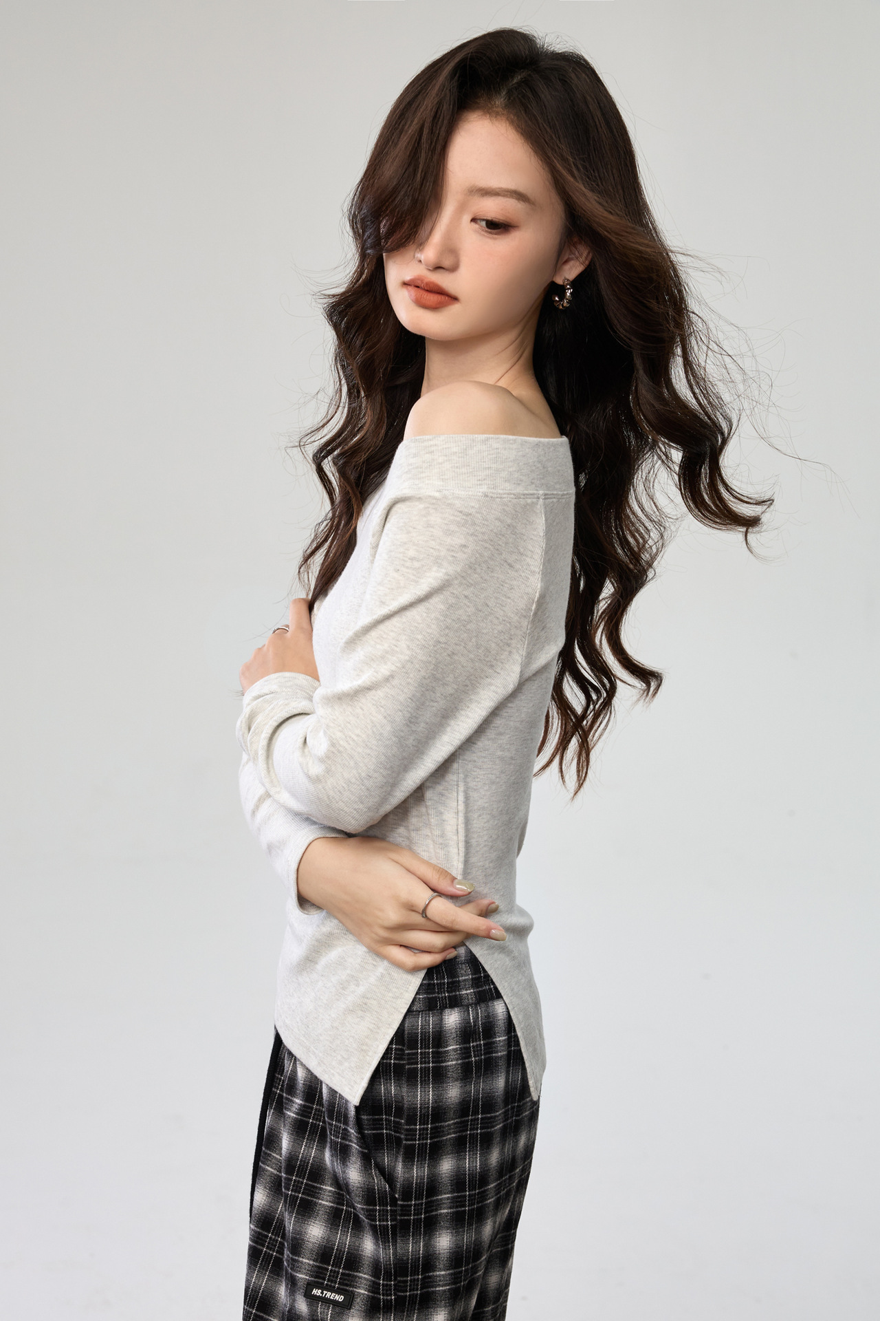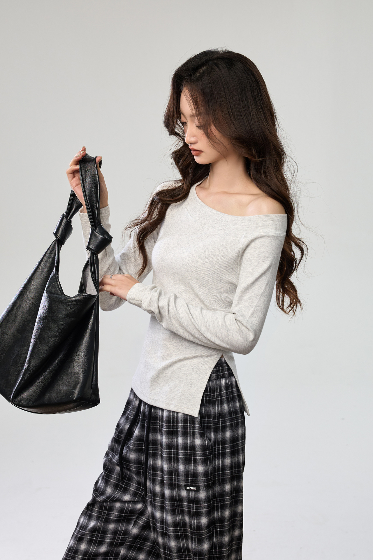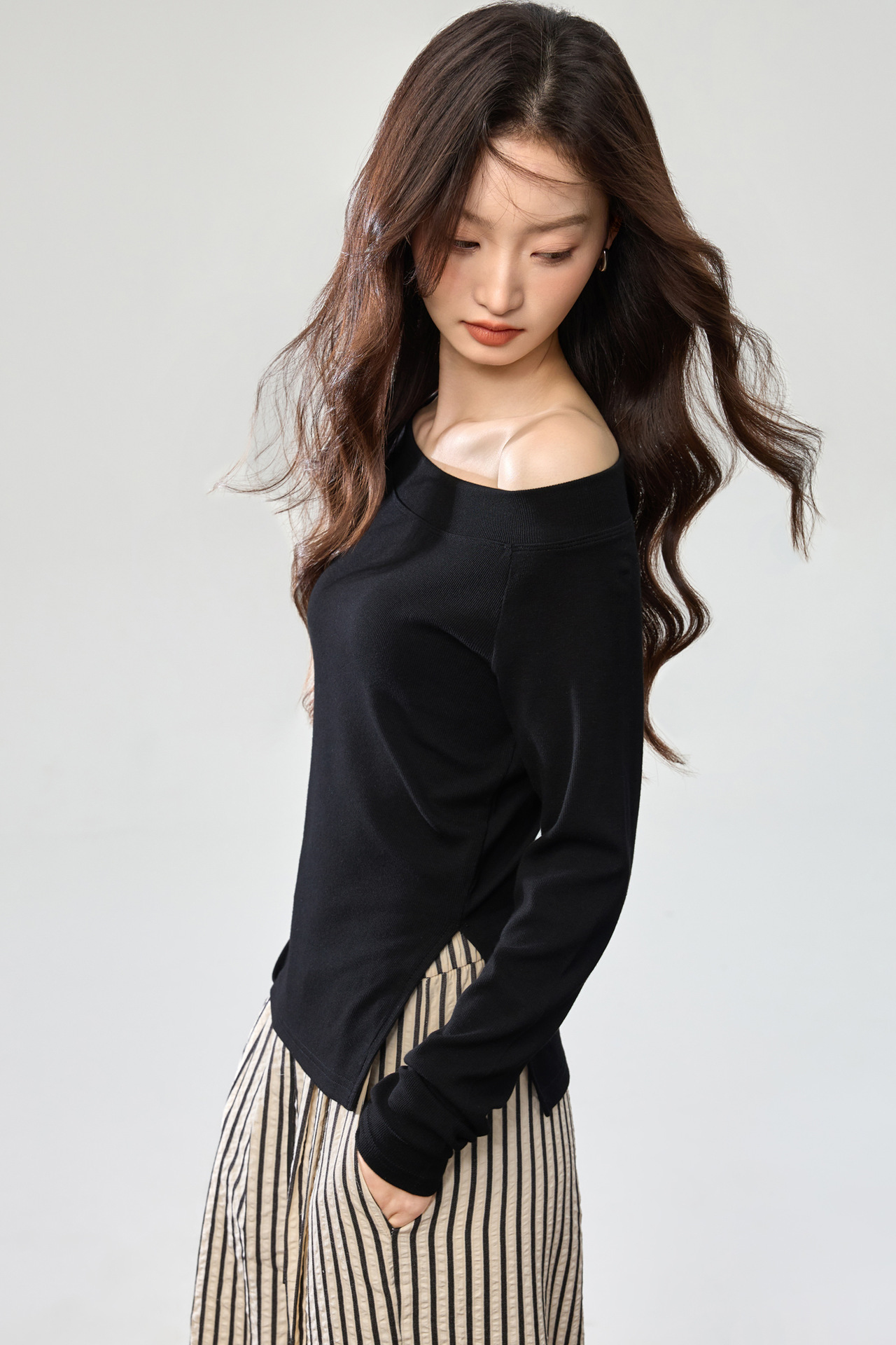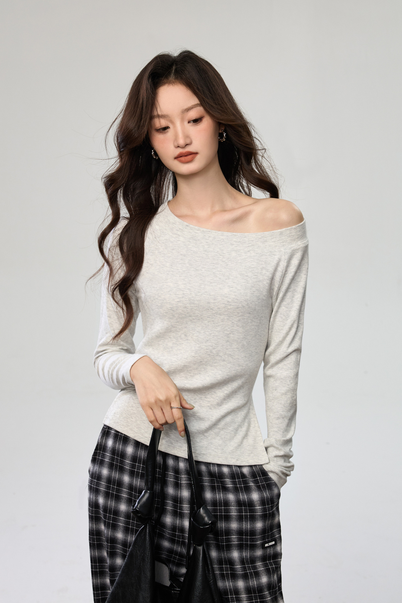 260G Youke silk, two wear one-word collar slanted shoulder temperament fashionable wear with split-ended long-sleeved T-shirt women's autumn bottoming top