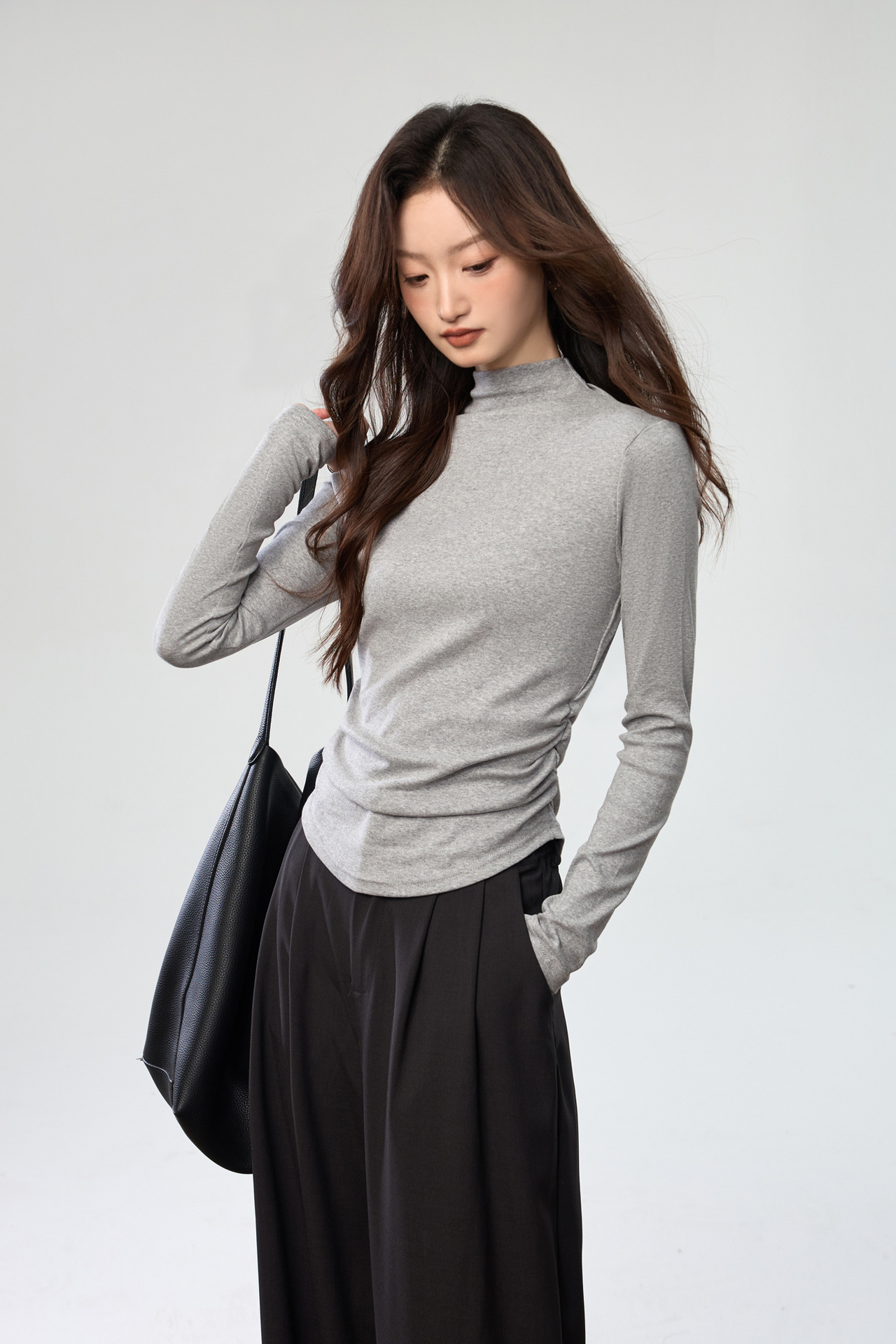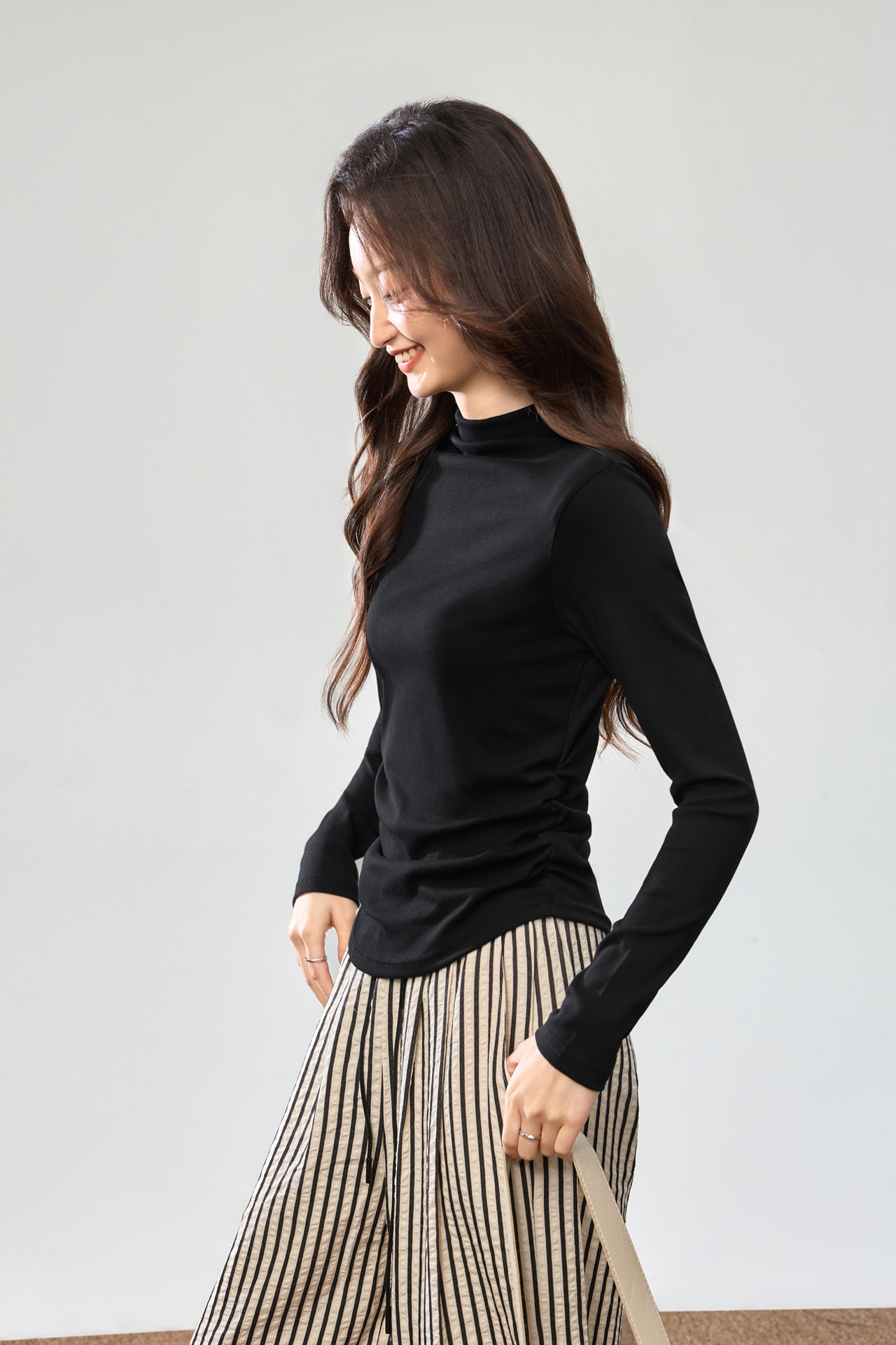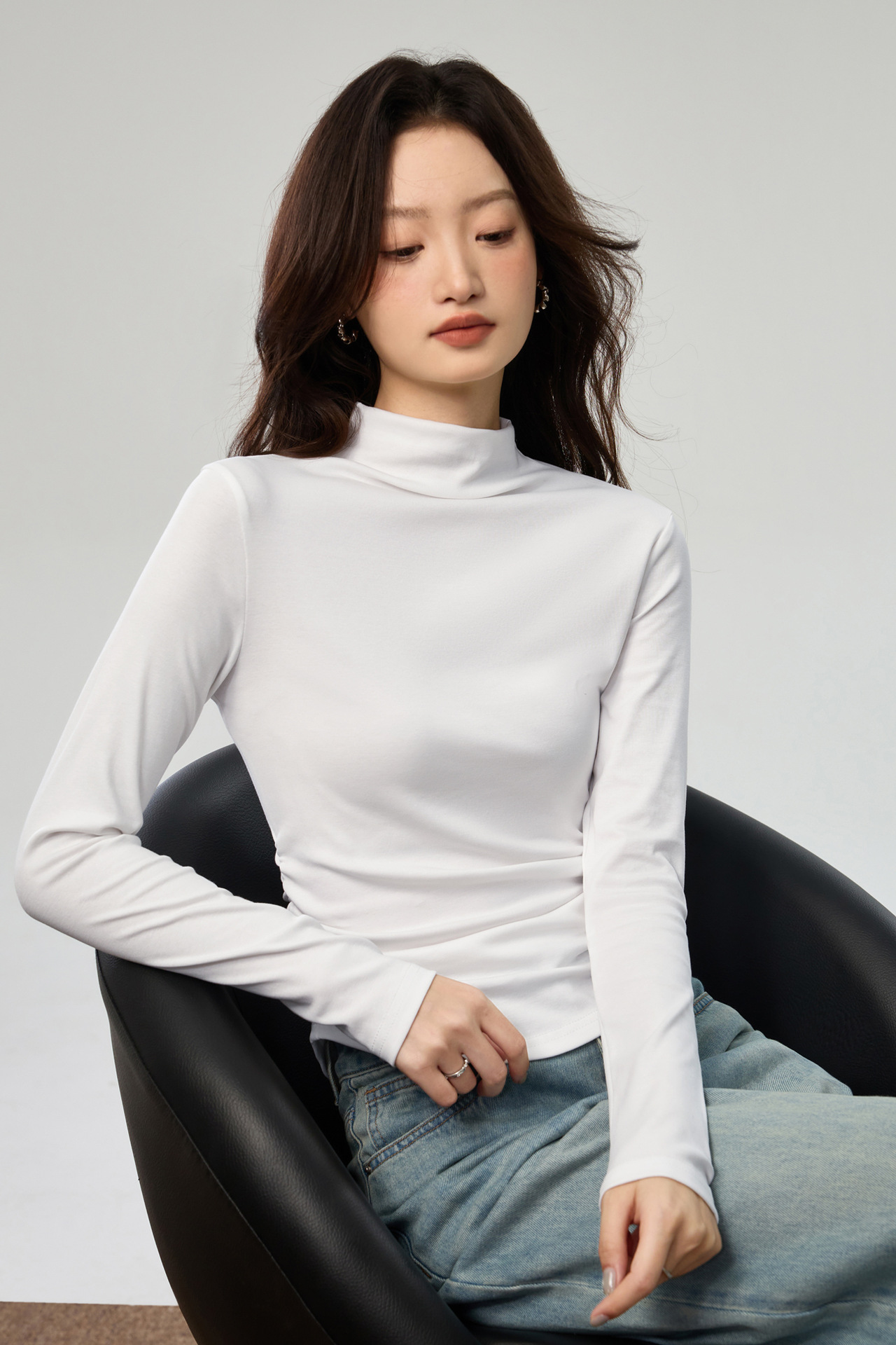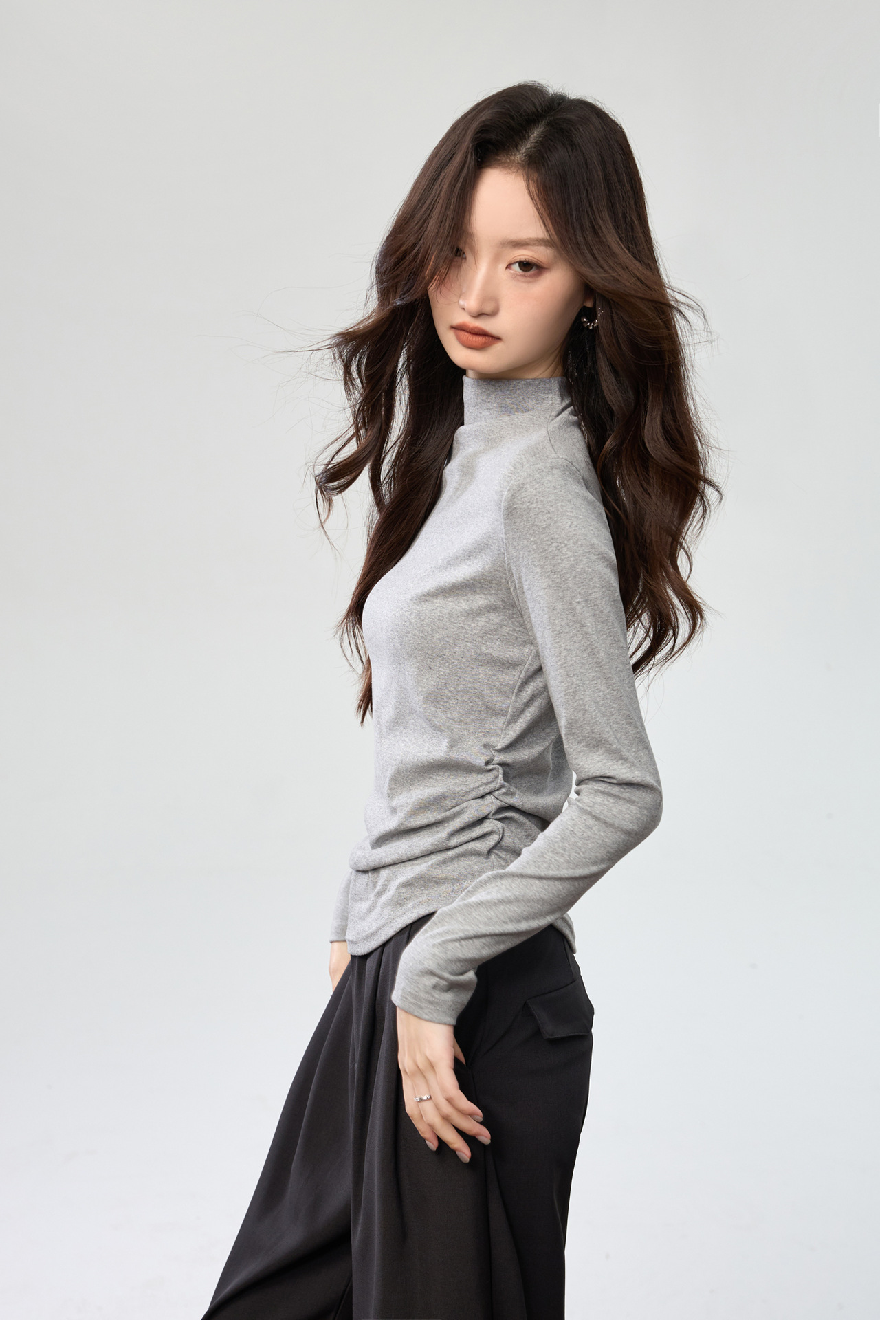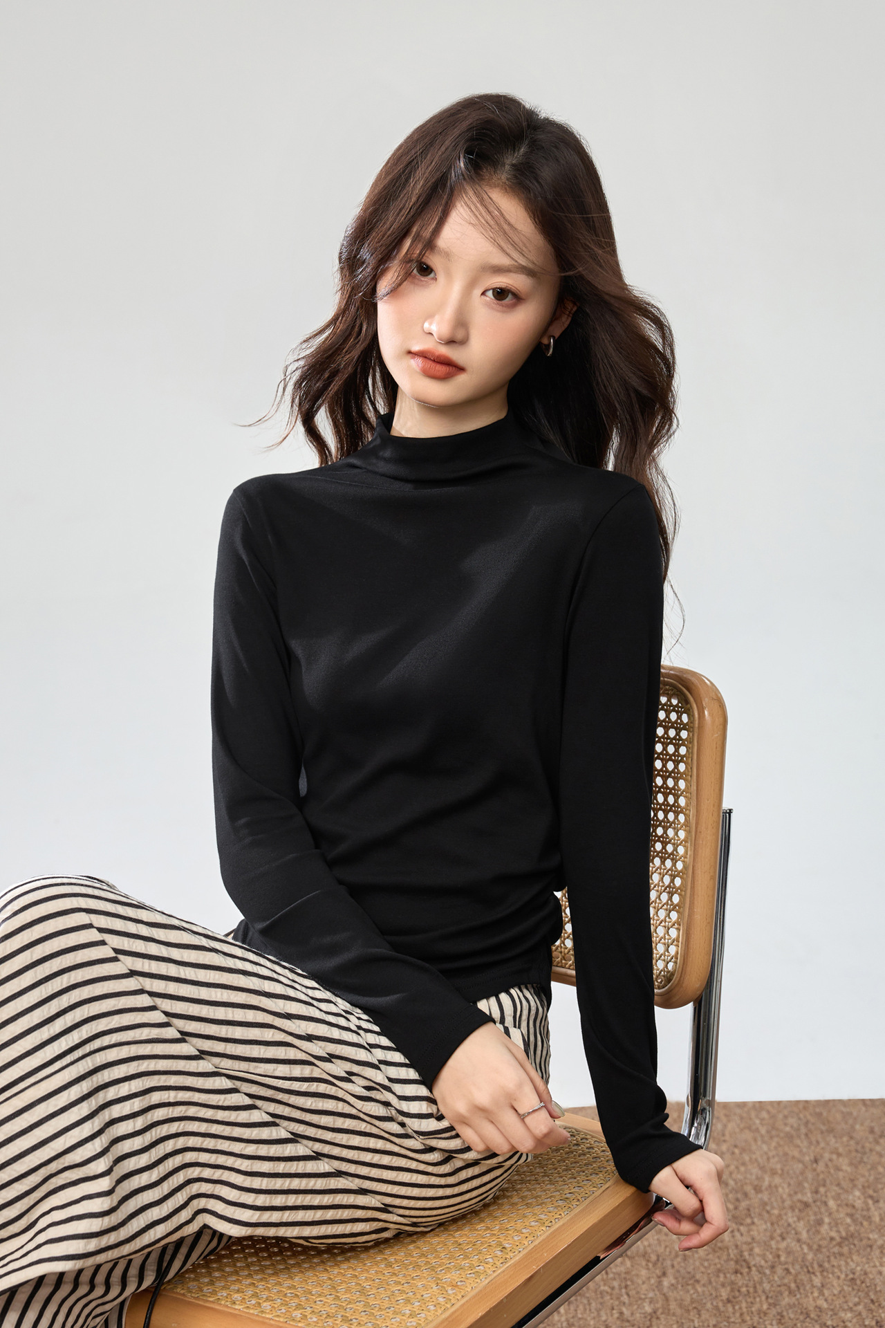 40 combed cotton, protein skin-friendly semi-turtleneck bottoming shirt, women's autumn long-sleeved T-shirt, thin waist pleated top