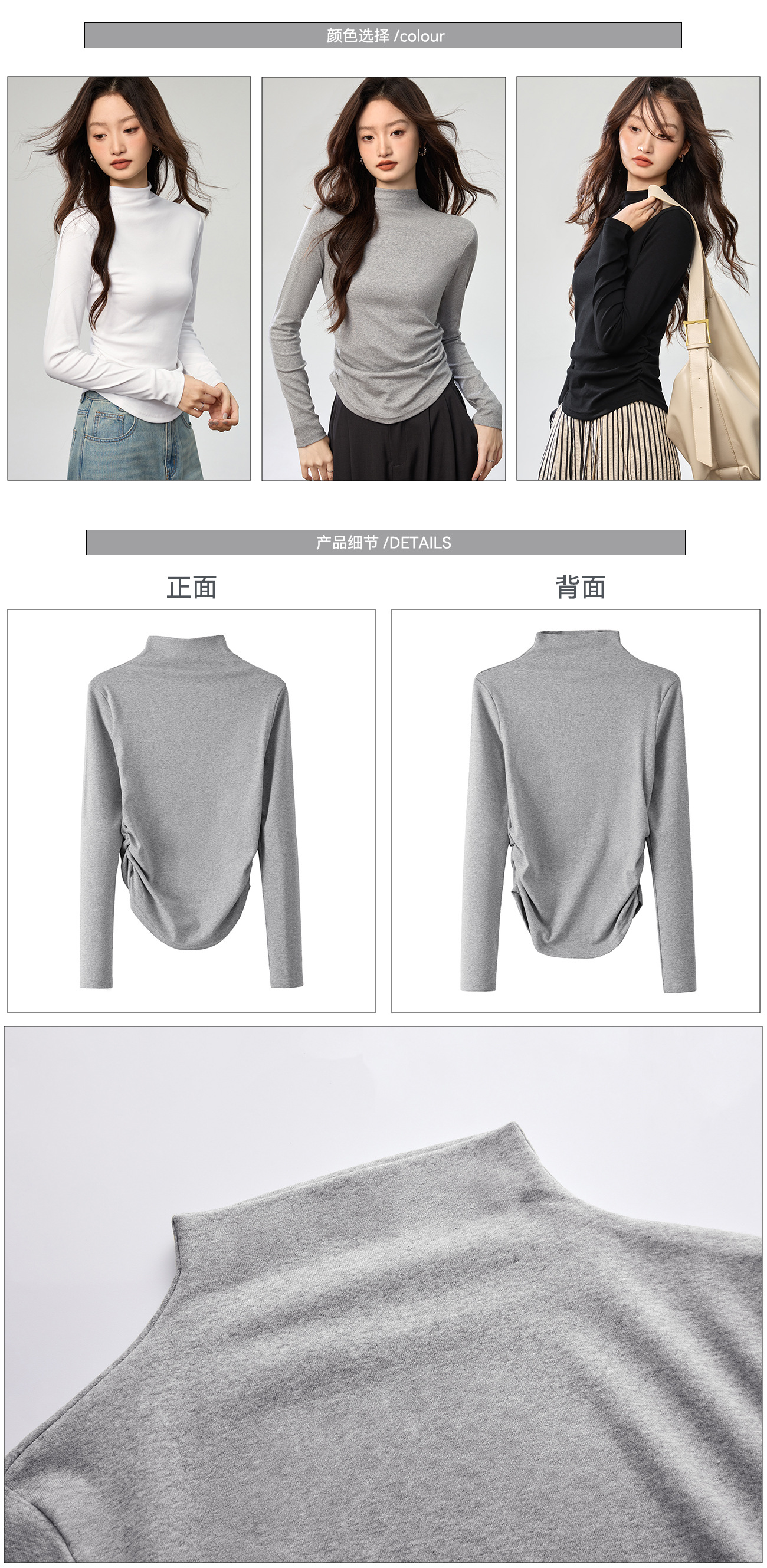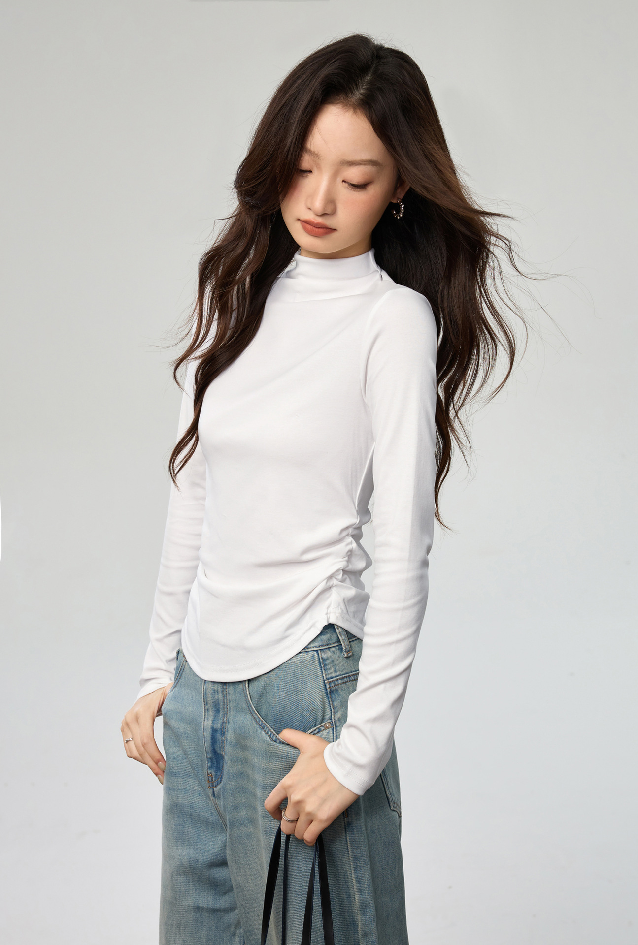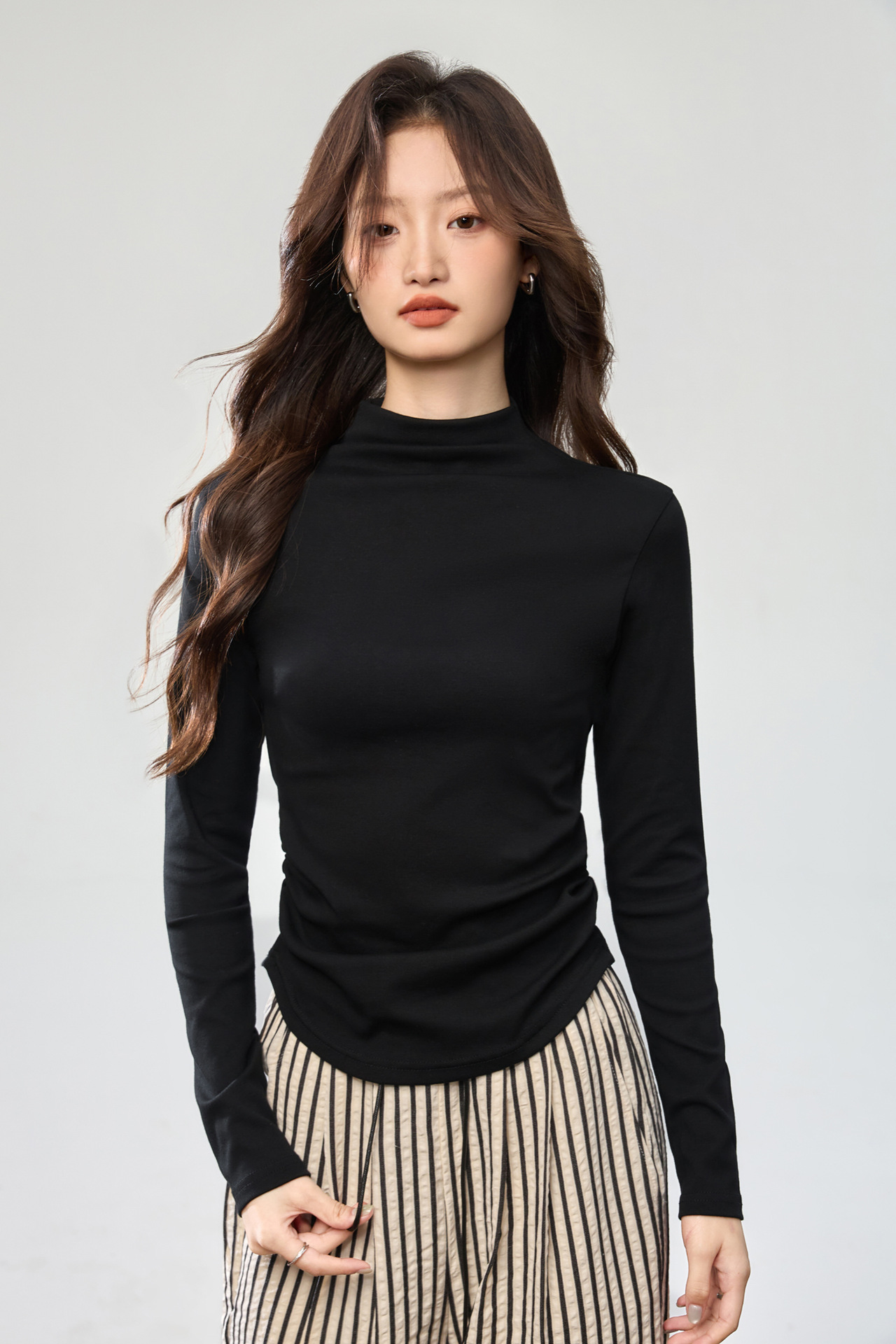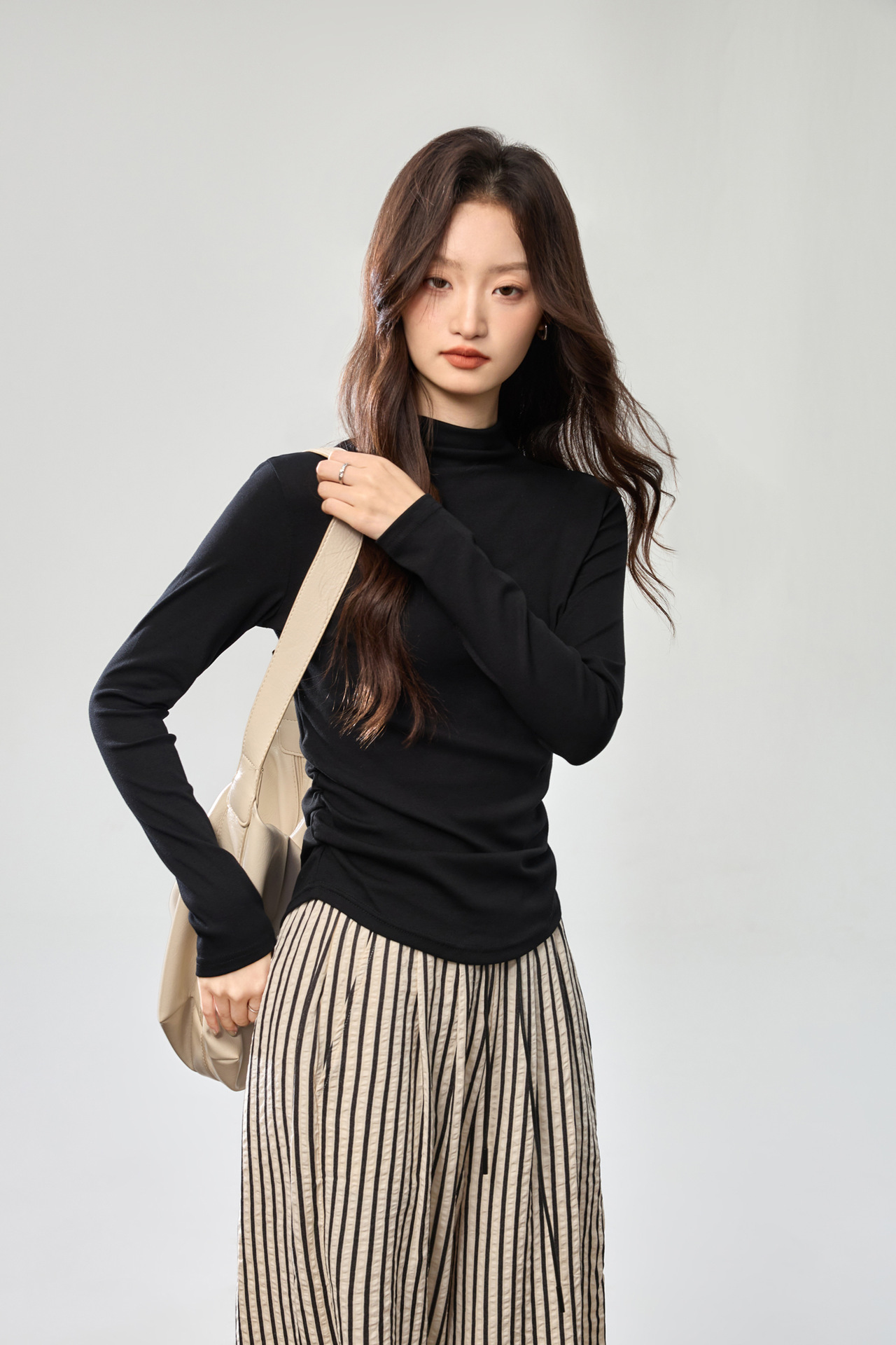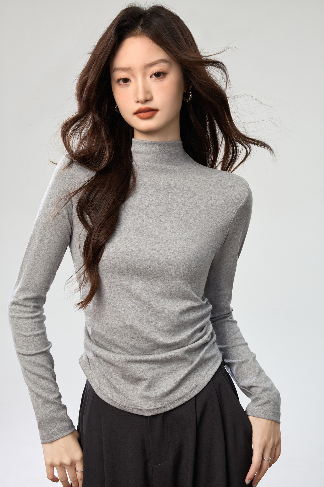 40 combed cotton, protein skin-friendly semi-turtleneck bottoming shirt, women's autumn long-sleeved T-shirt, thin waist pleated top