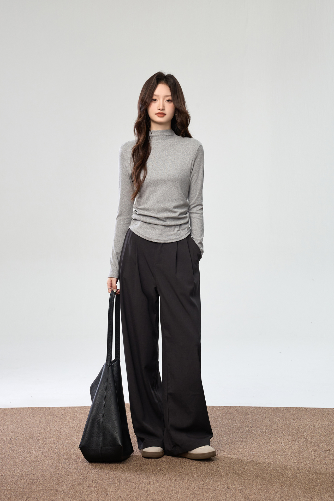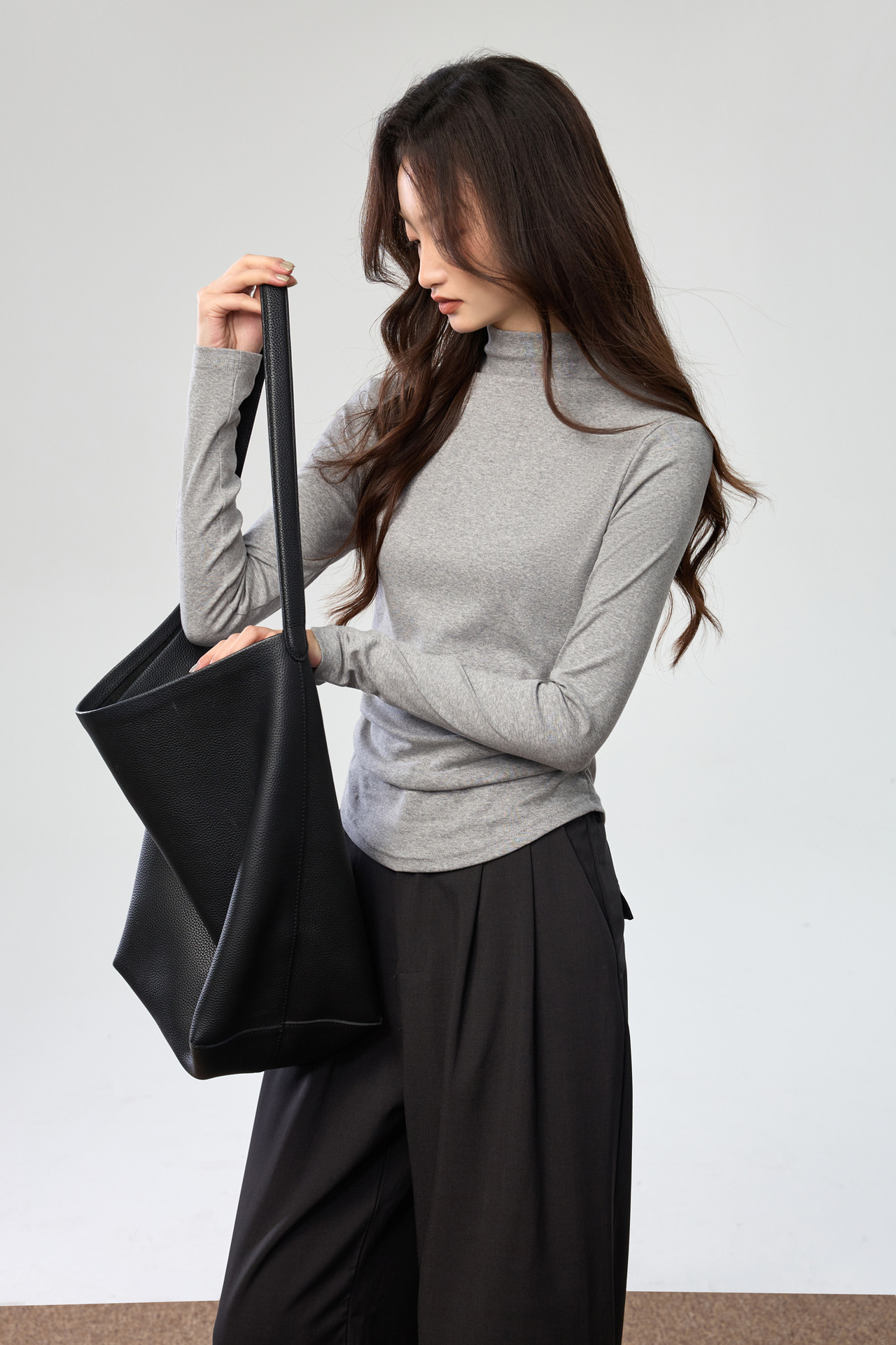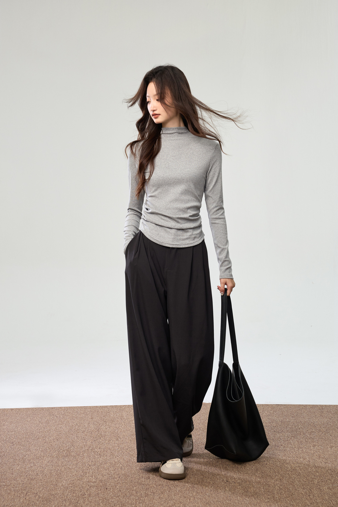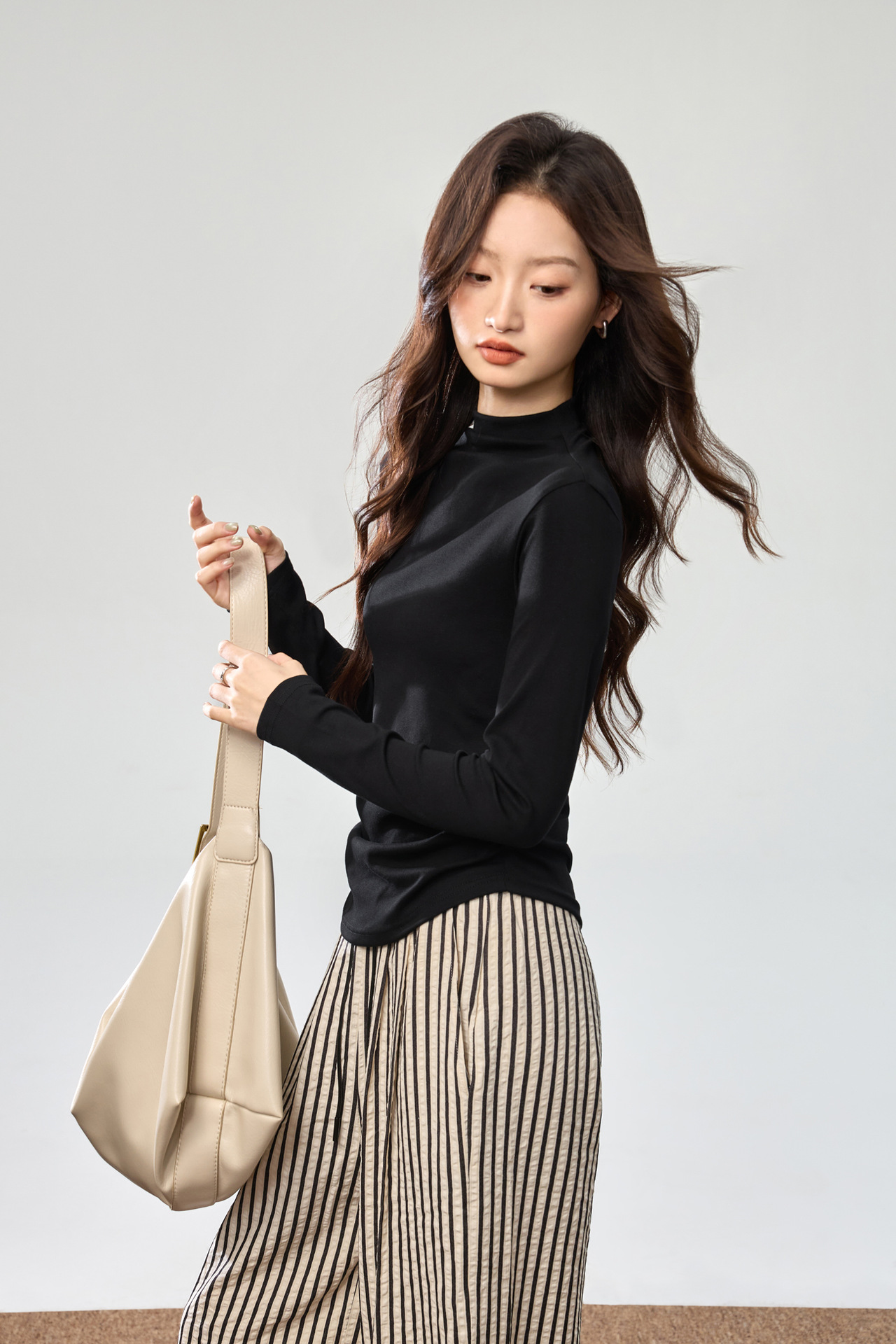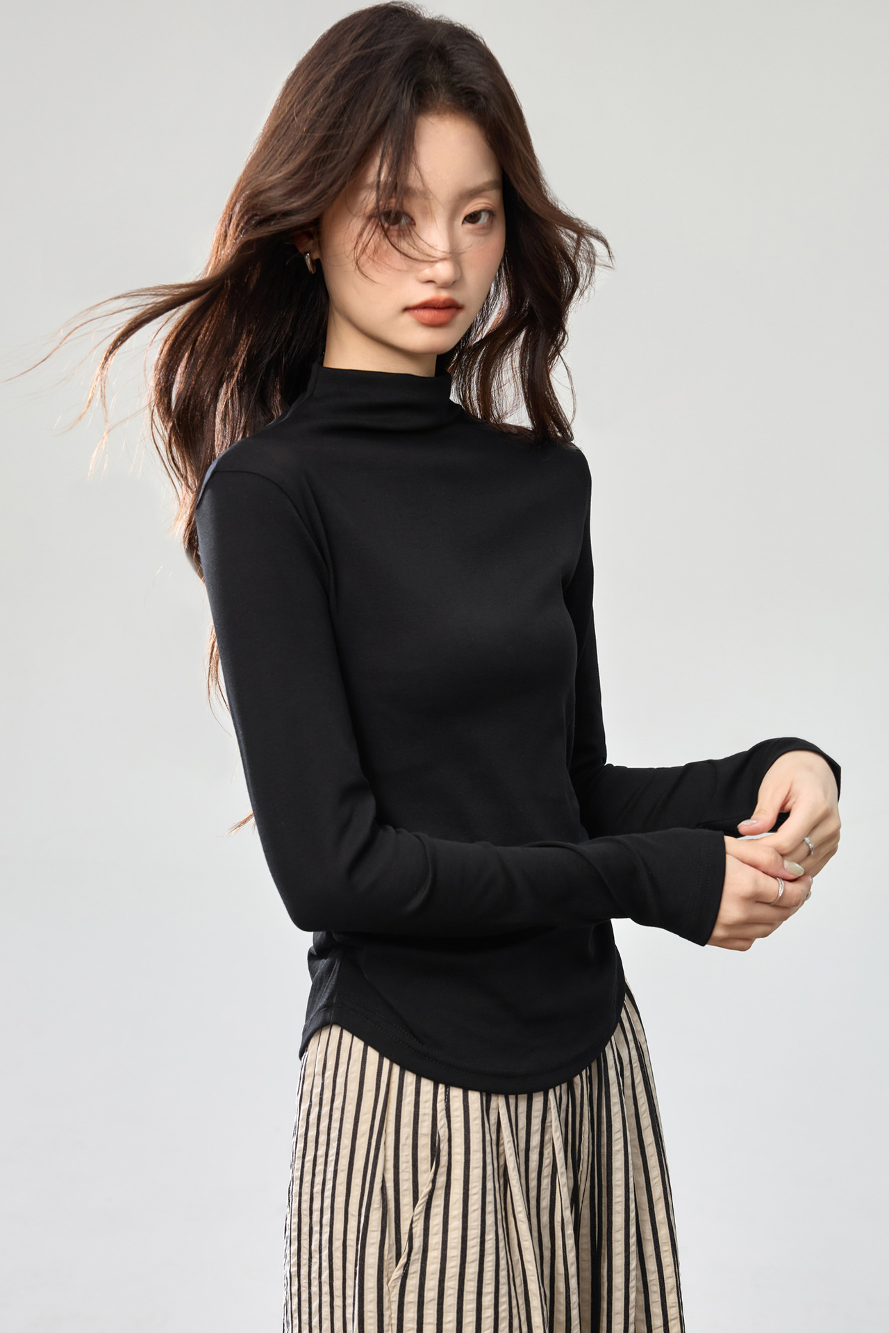 40 combed cotton, protein skin-friendly semi-turtleneck bottoming shirt, women's autumn long-sleeved T-shirt, thin waist pleated top