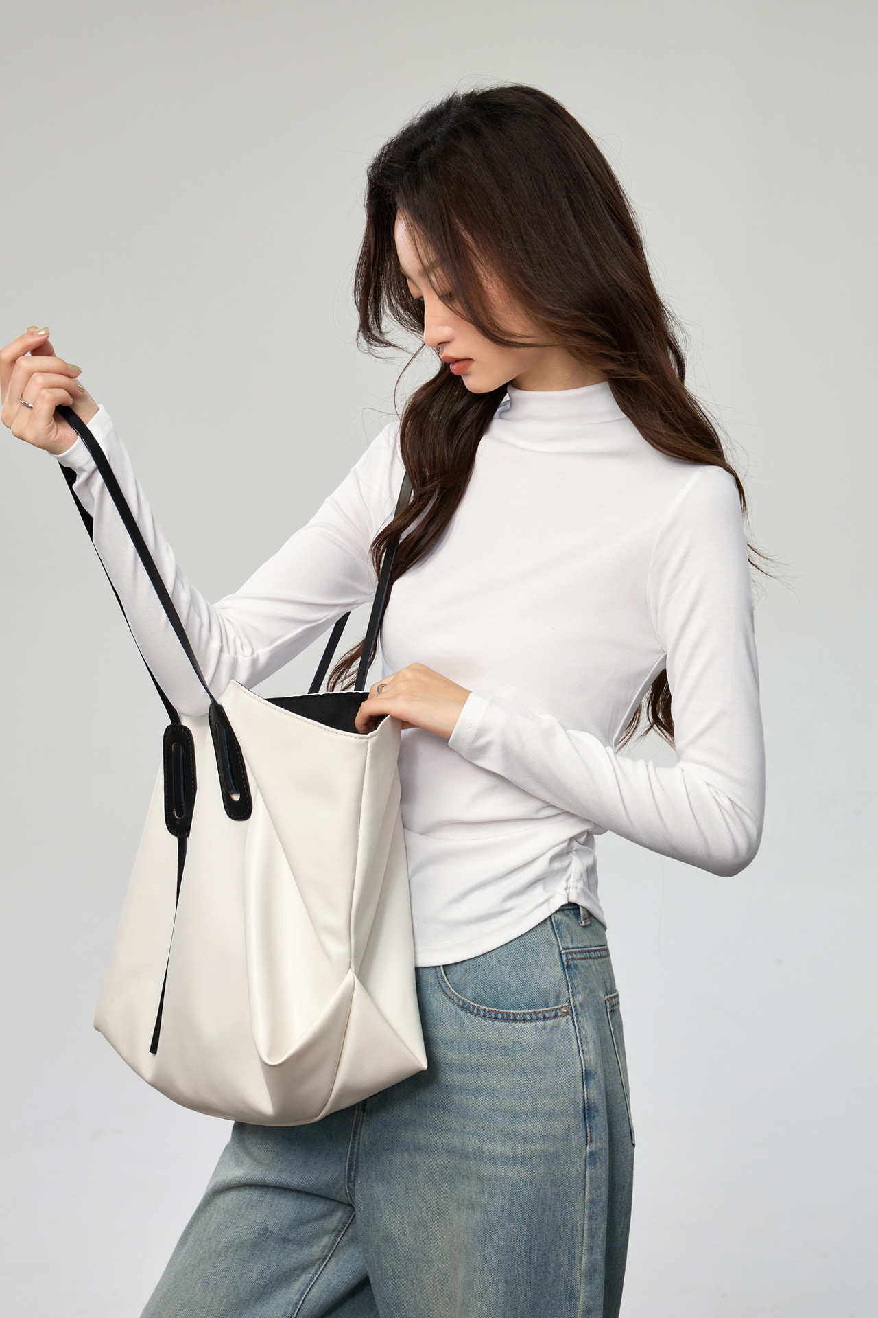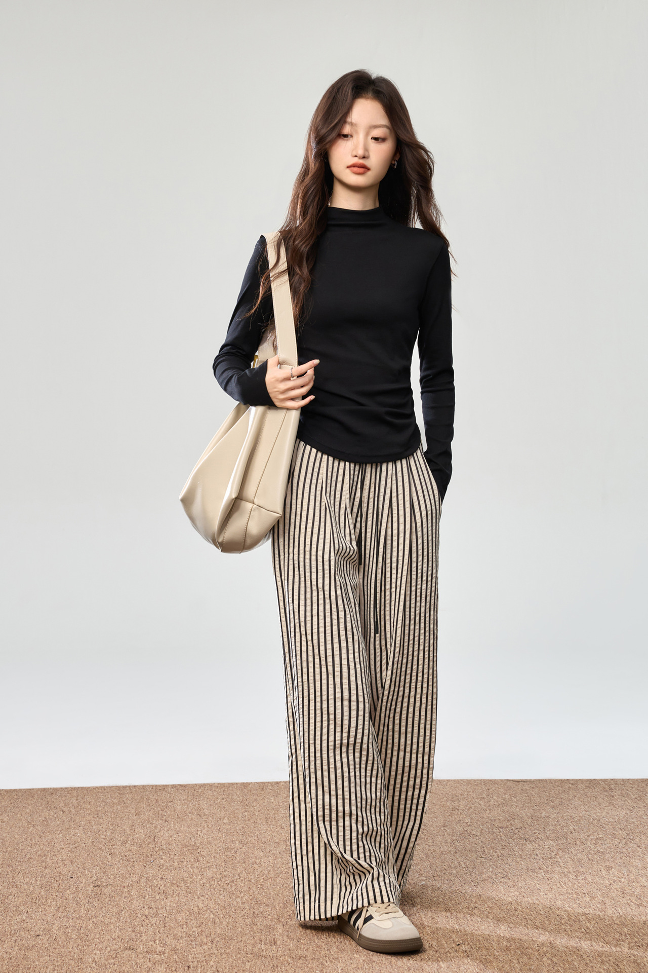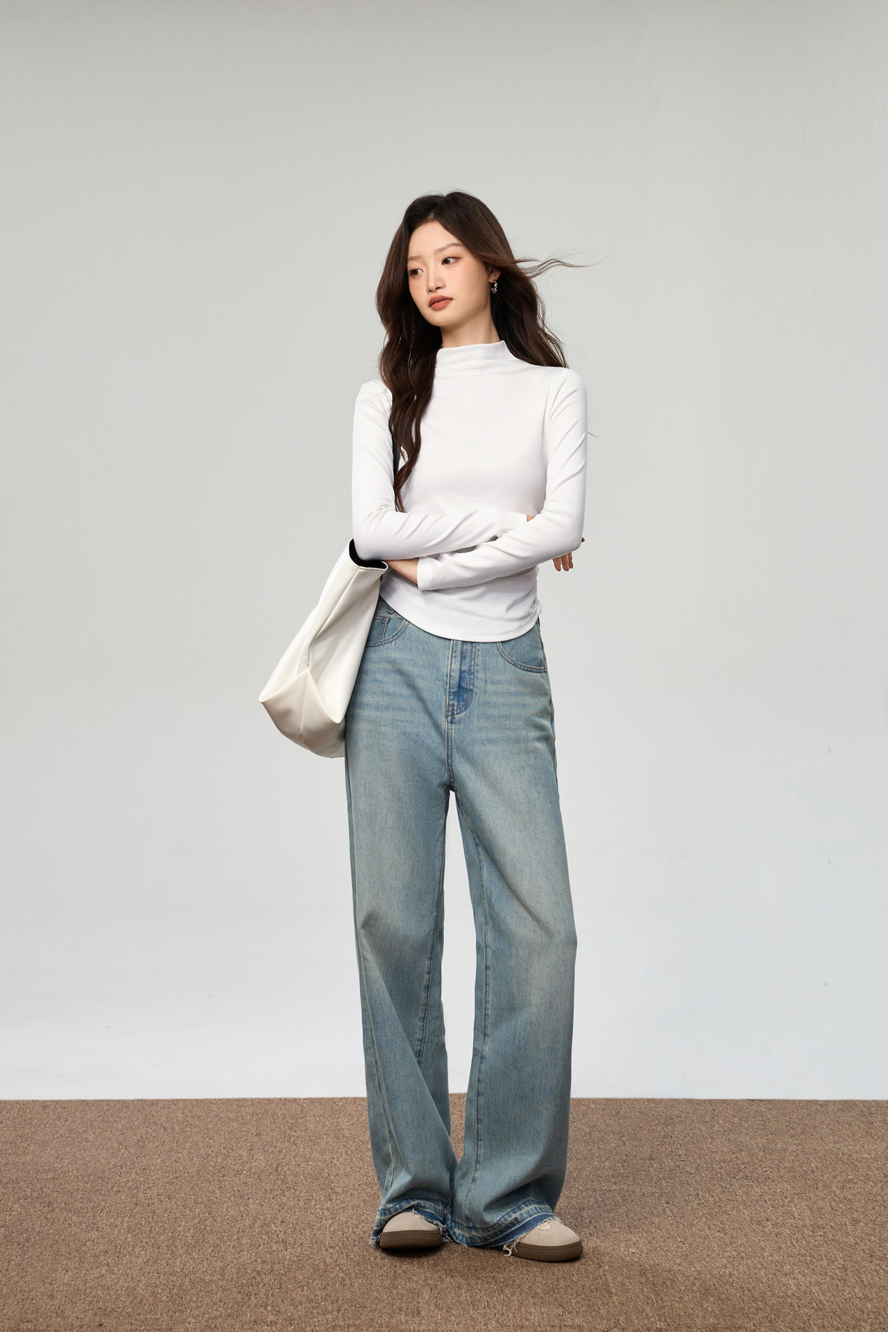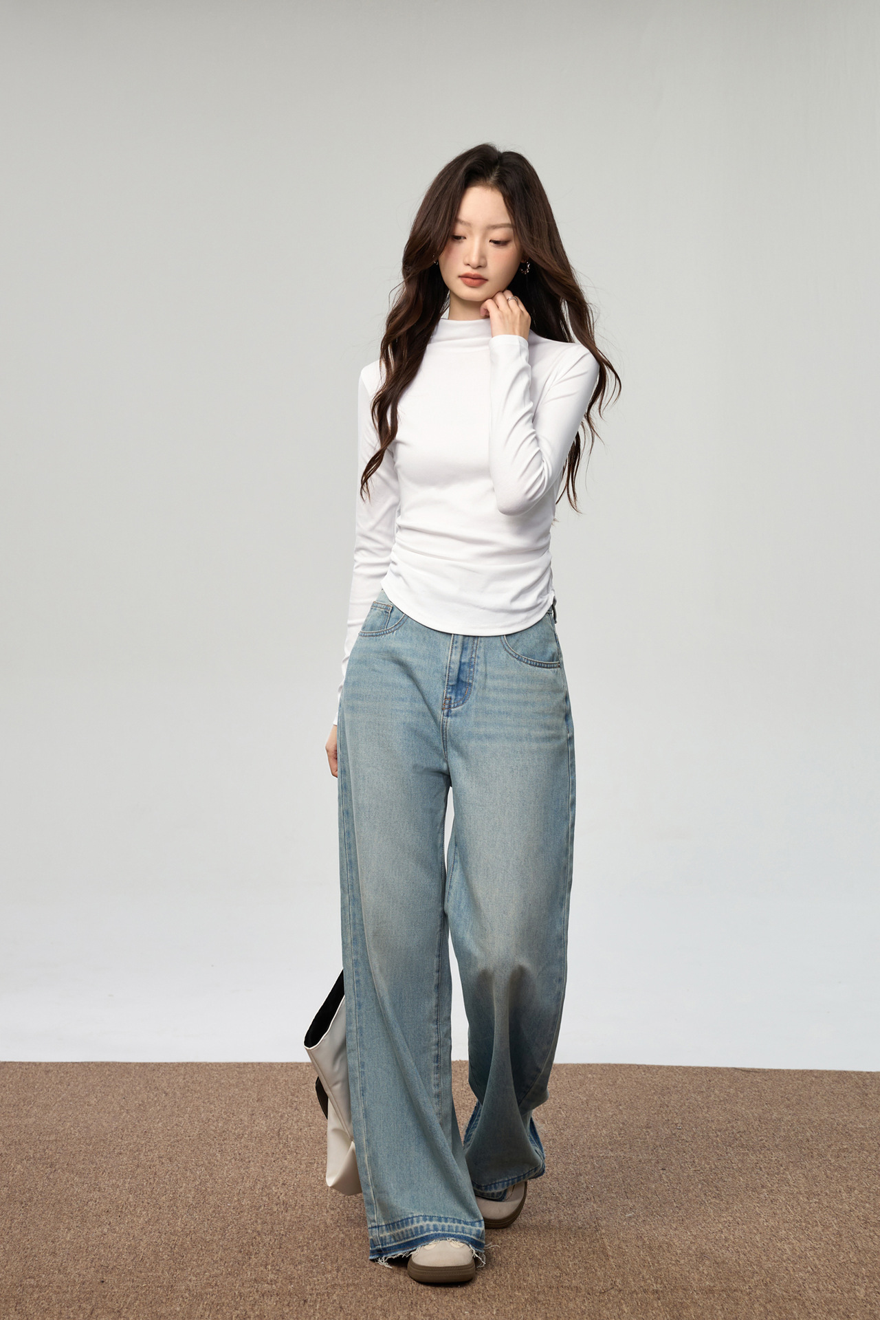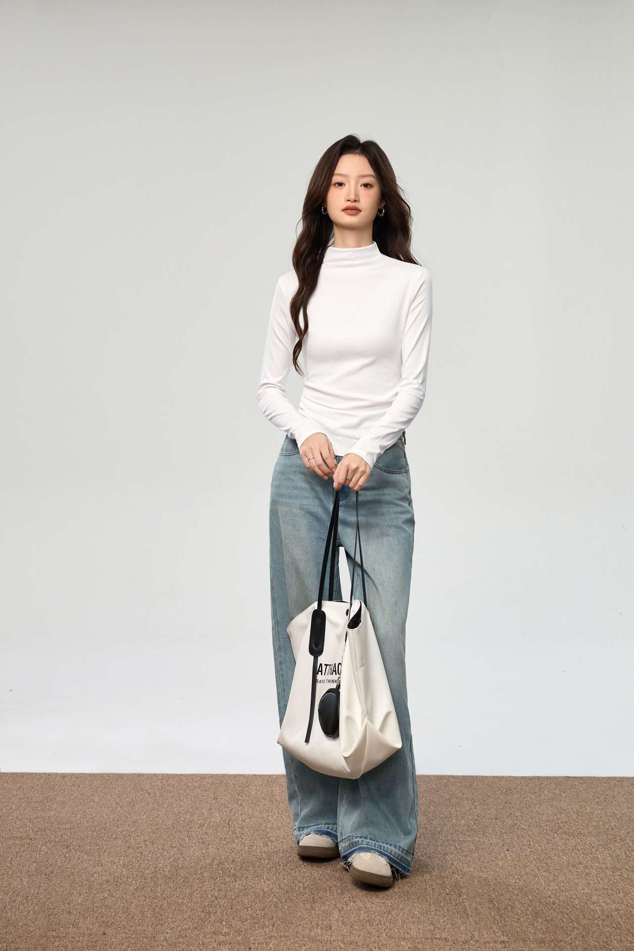 40 combed cotton, protein skin-friendly semi-turtleneck bottoming shirt, women's autumn long-sleeved T-shirt, thin waist pleated top