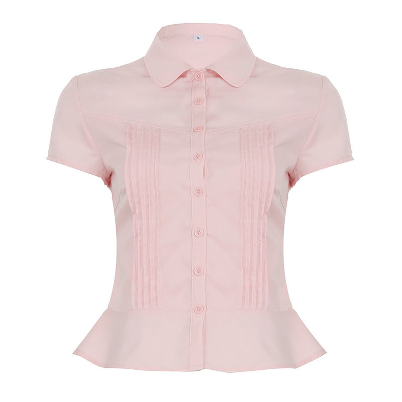 American girly temperament organ pleated solid color POLO neck short-sleeved shirt waist short breasted button-up top