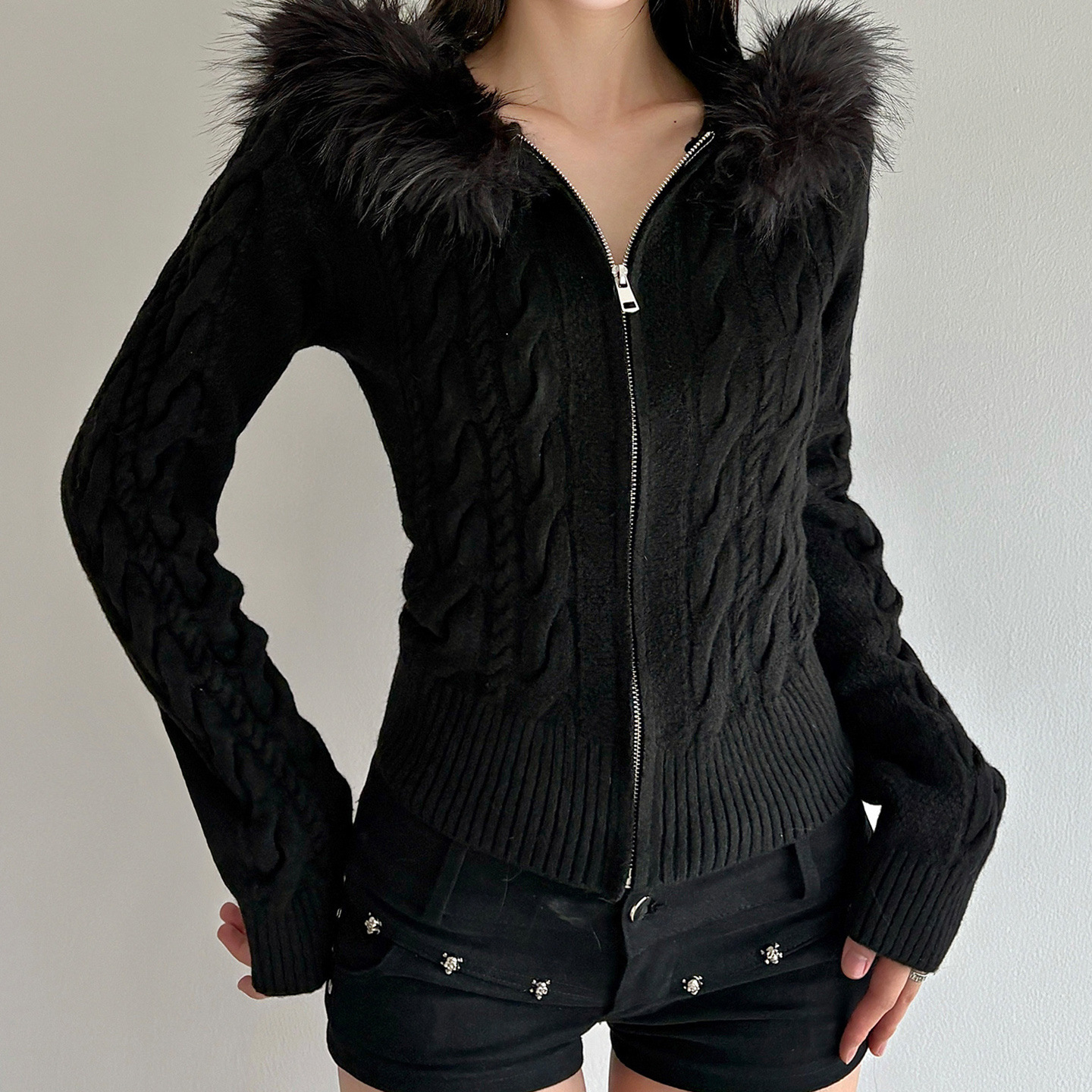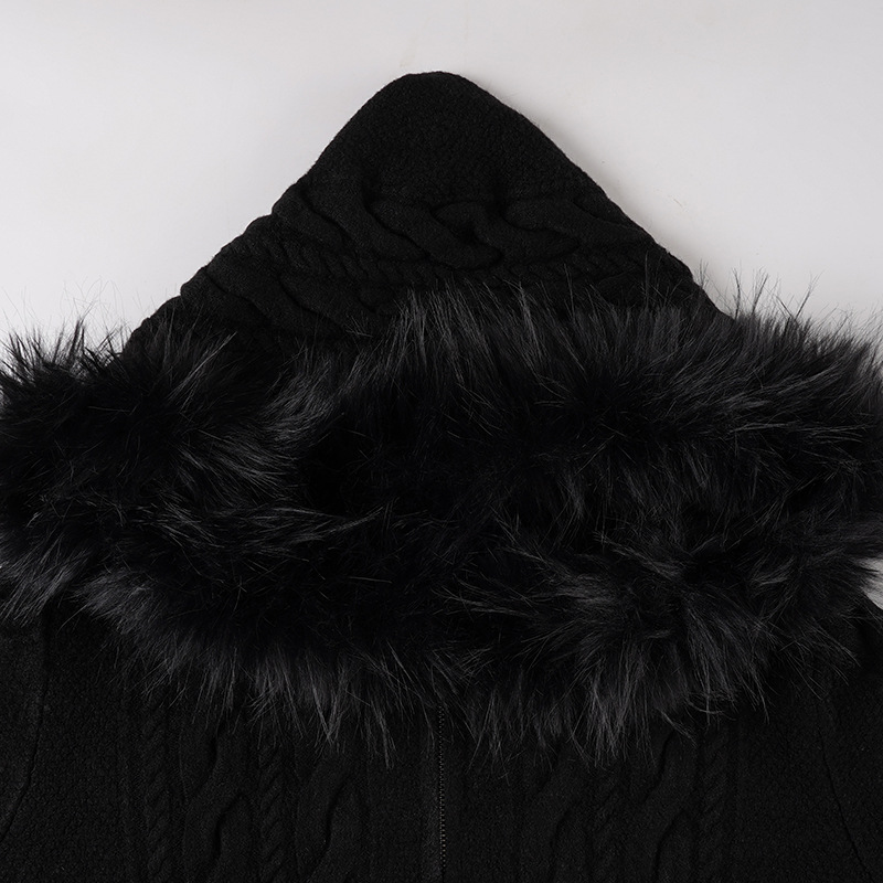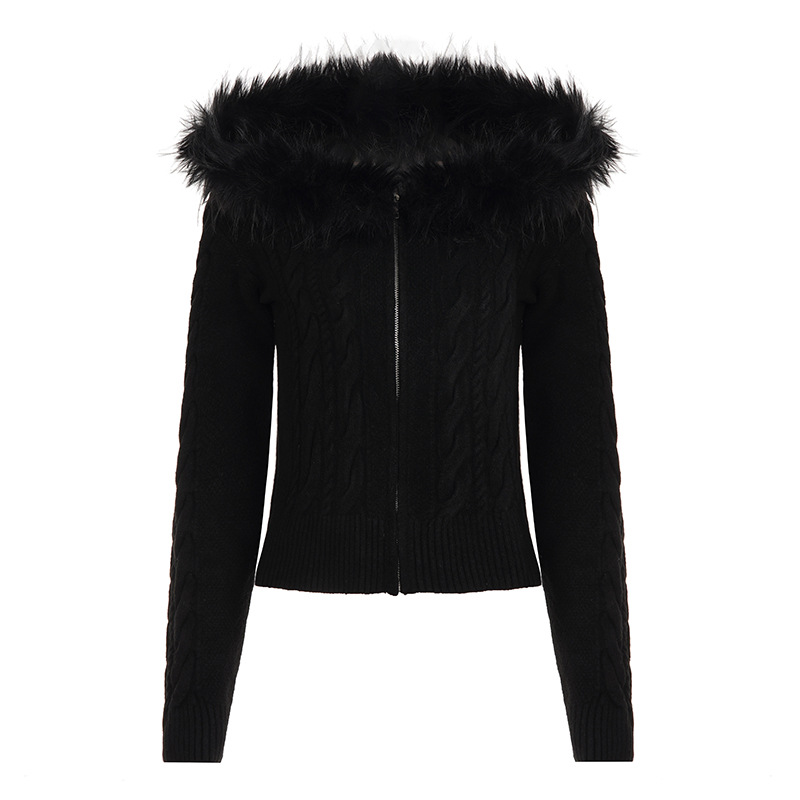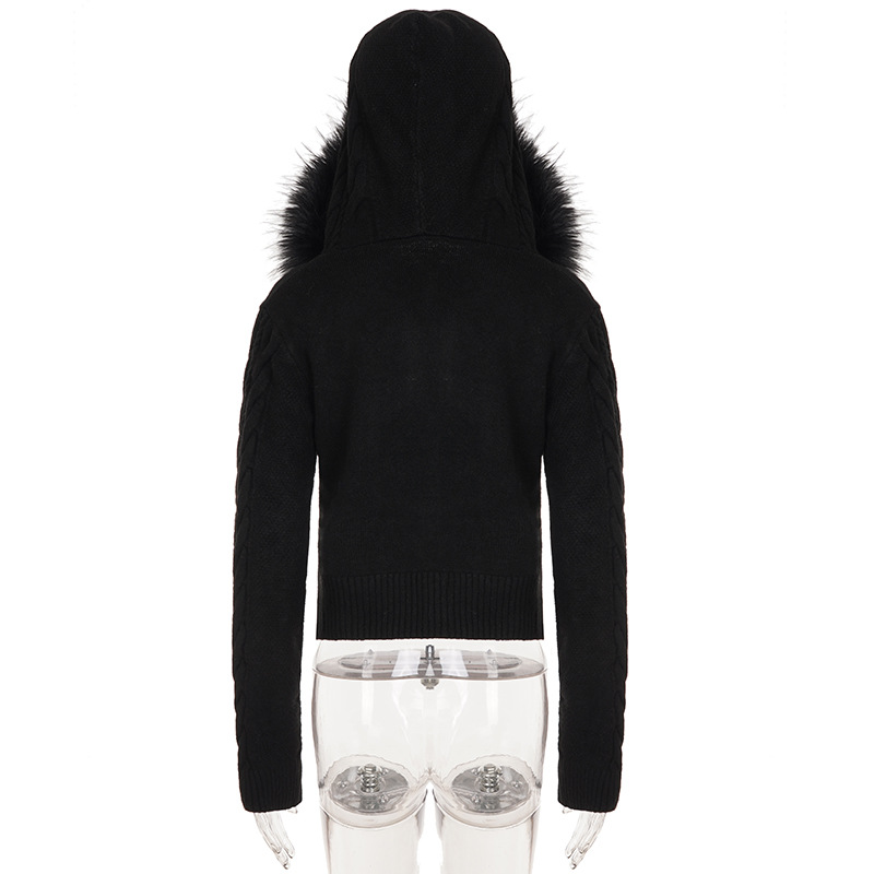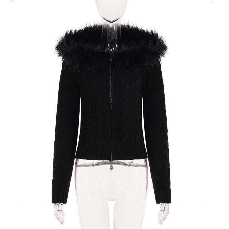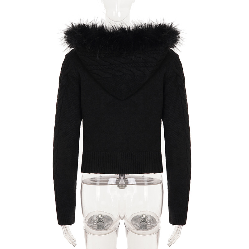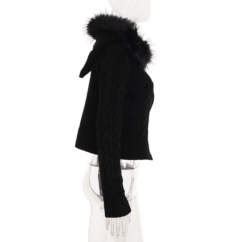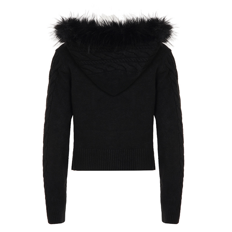 American retro fluffy hooded zipper cardigan twist sweater autumn and winter slim waist short Spice Girl new coat