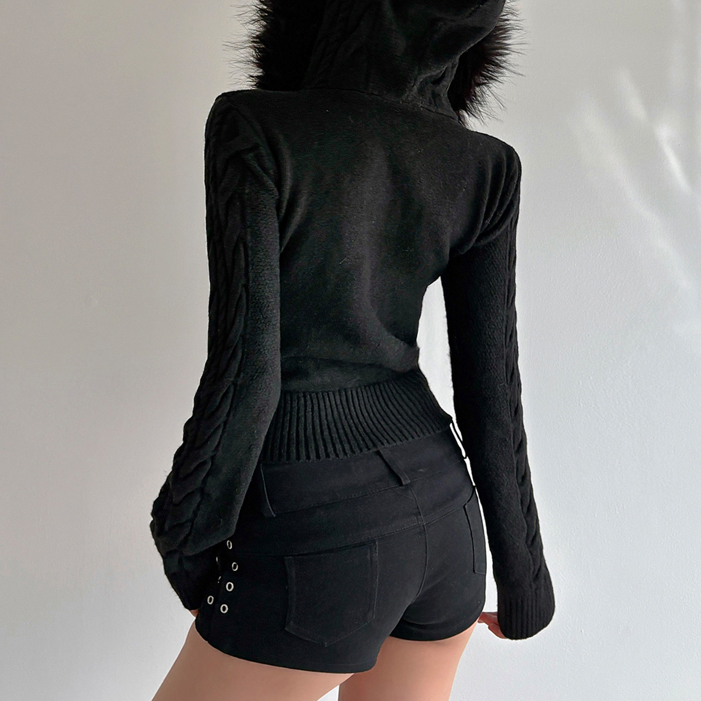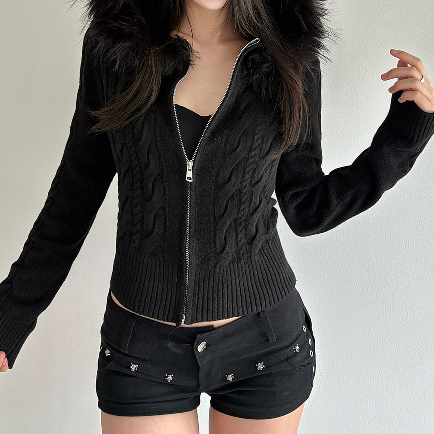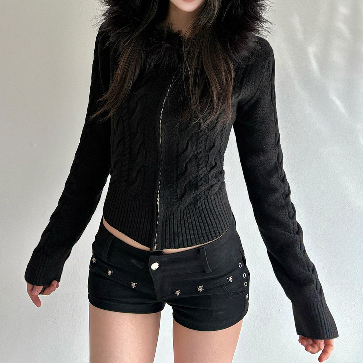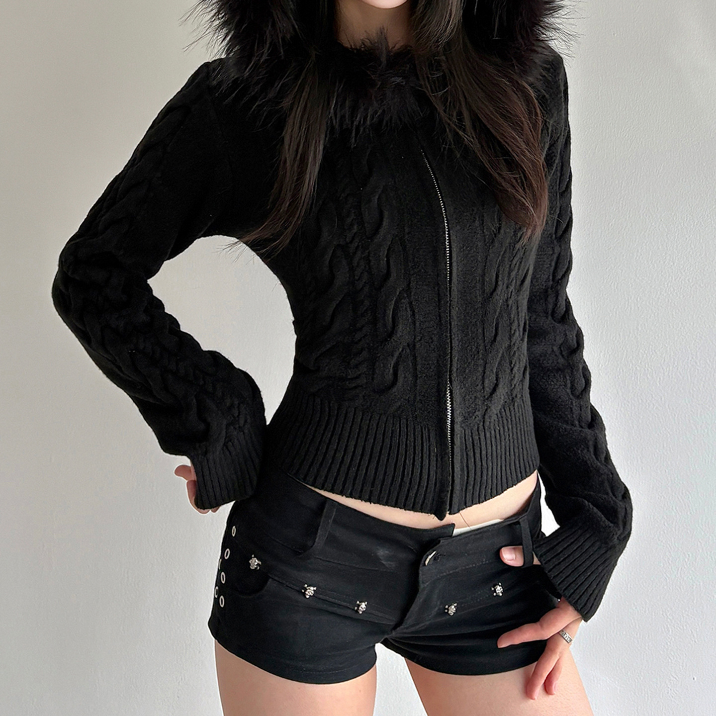 American retro fluffy hooded zipper cardigan twist sweater autumn and winter slim waist short Spice Girl new coat