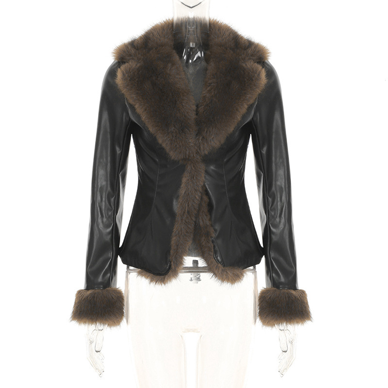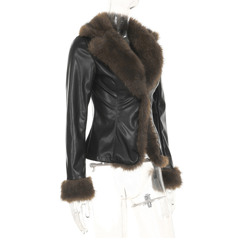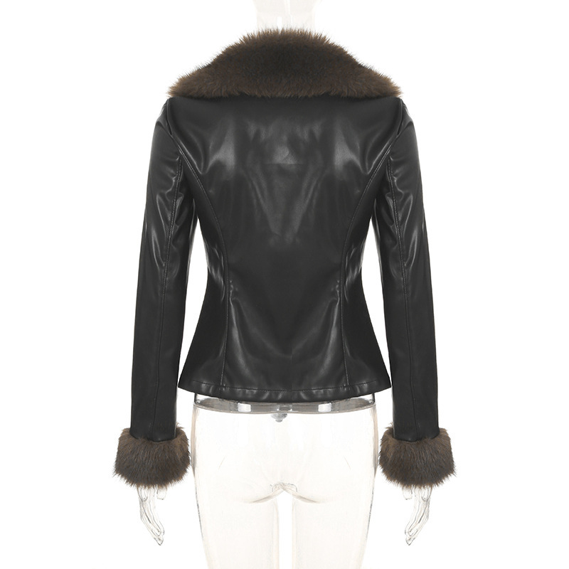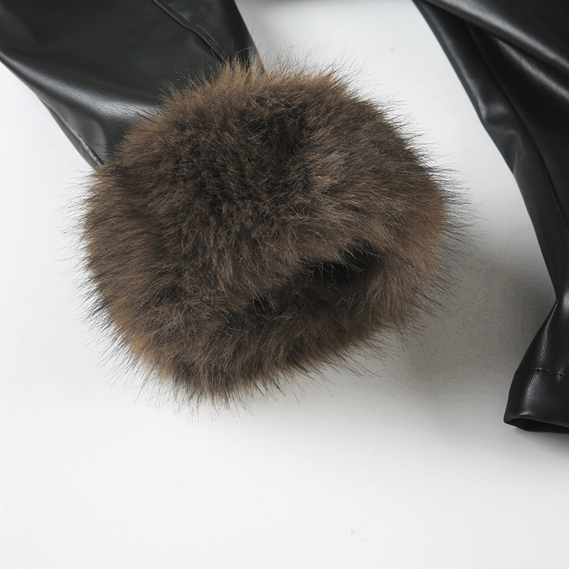 American winter new fur collar V-neck spliced leather jacket street hottie fashion slim fit warm jacket