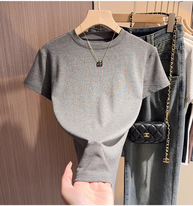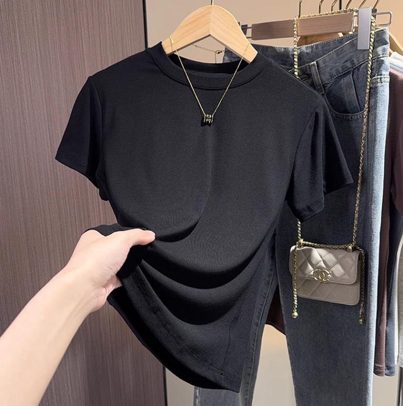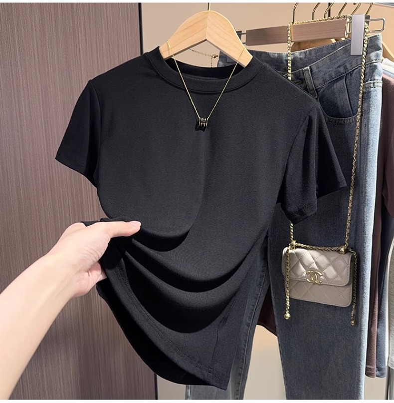 apricot short-sleeved t-shirt women's 2025 summer new high-end small stand-up neck bottoming shirt versatile slim-fitting front shoulder top