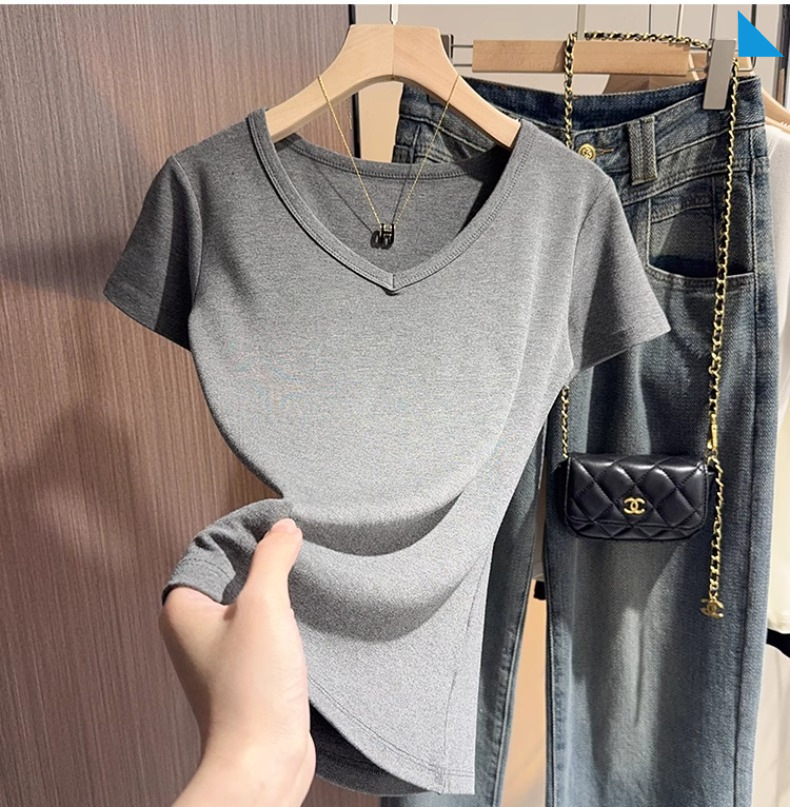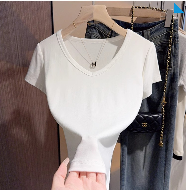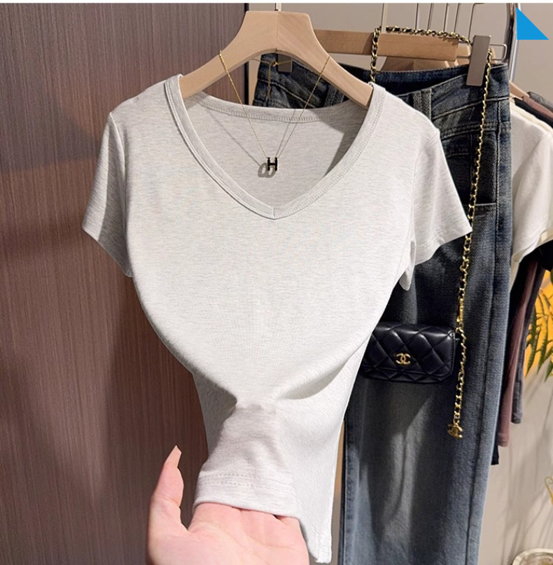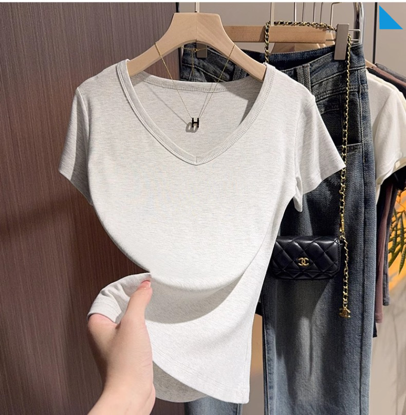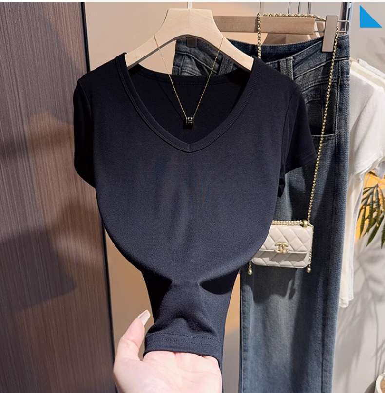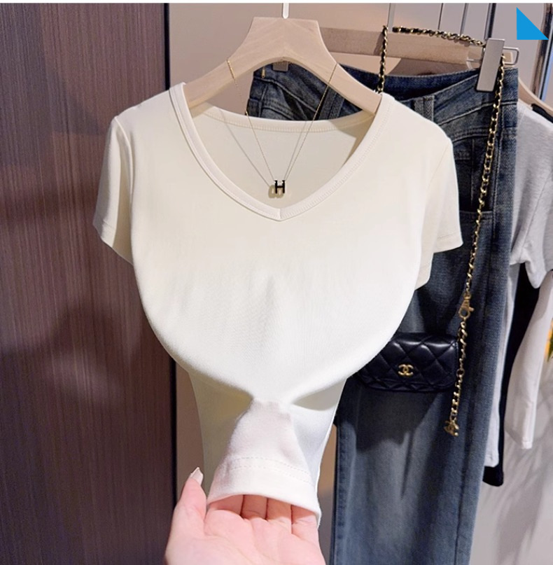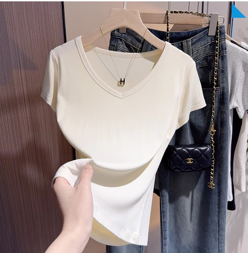 apricot v-neck t-shirt women's short-sleeved front shoulder versatile summer high-end bottoming shirt fashion temperament Korean outerwear top