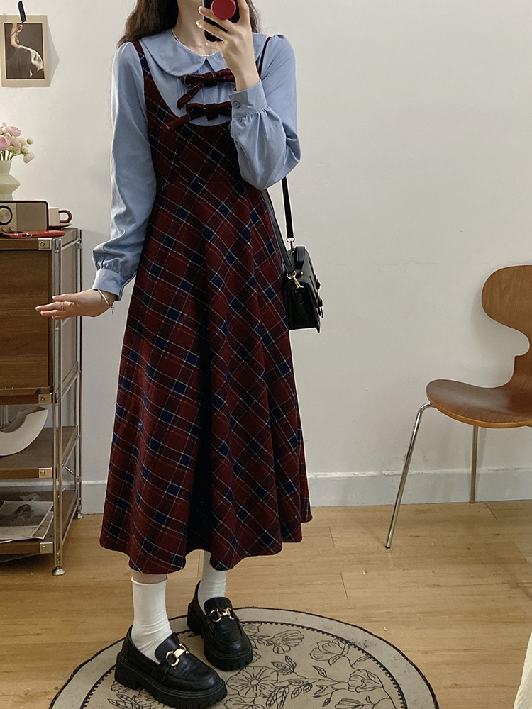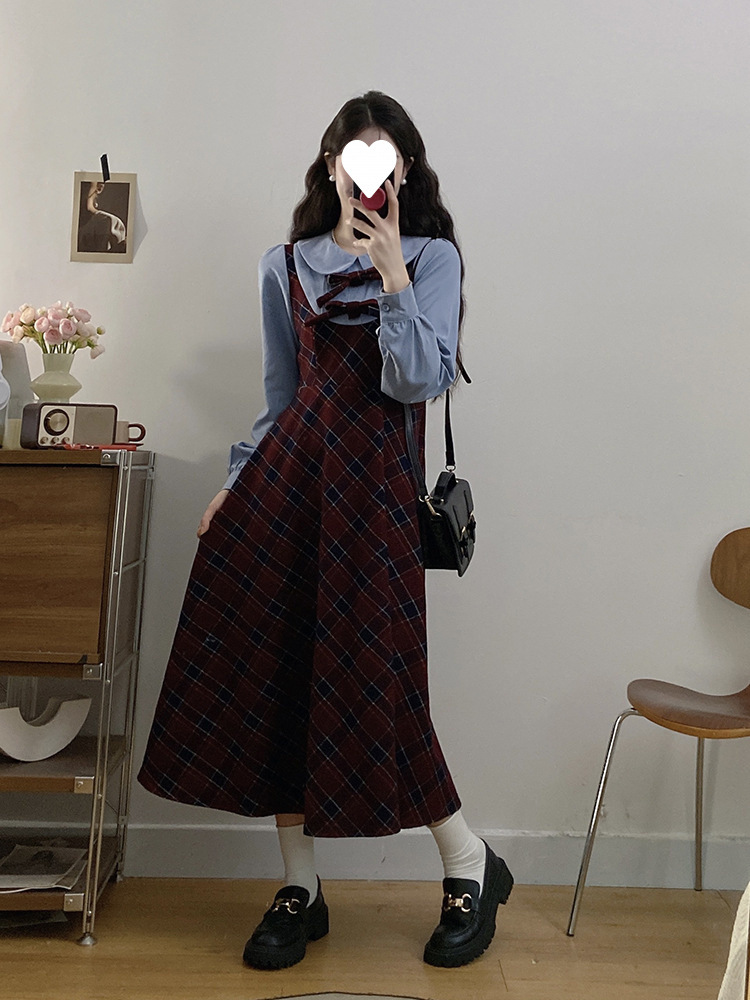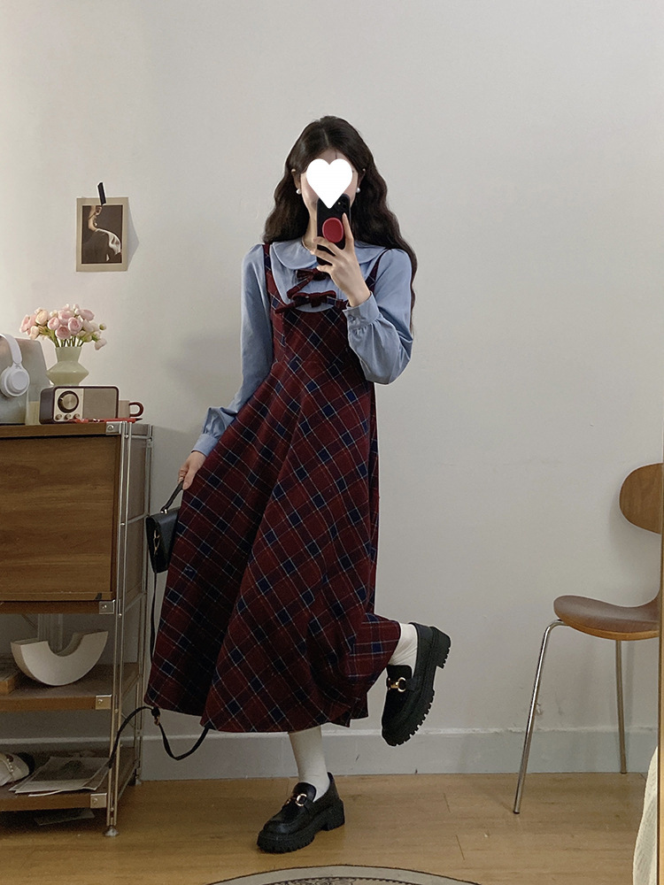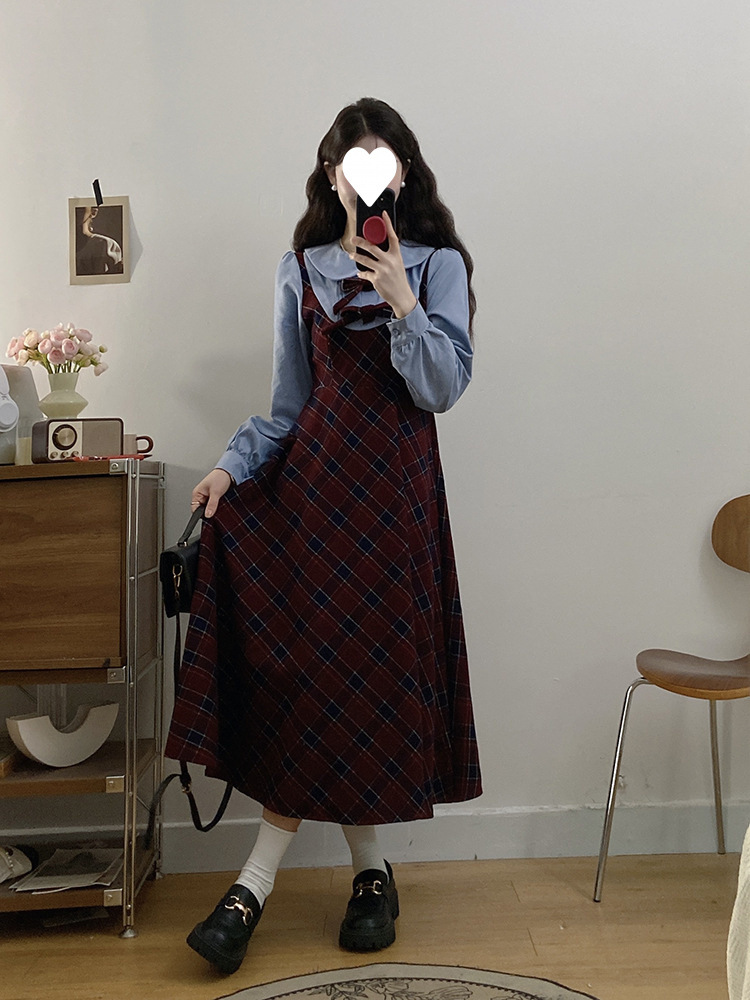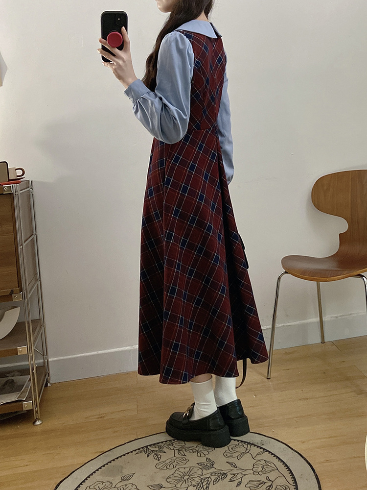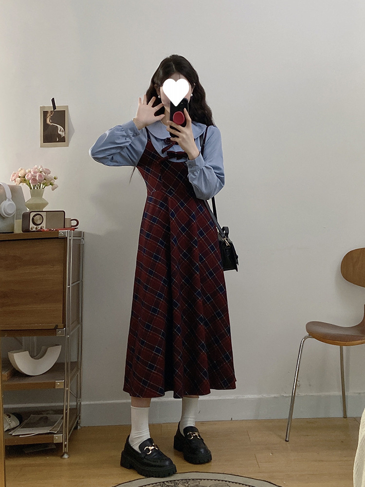 Autumn and winter retro college style niche design sense fake two-piece plaid dress women's waist thin gentle temperament skirt