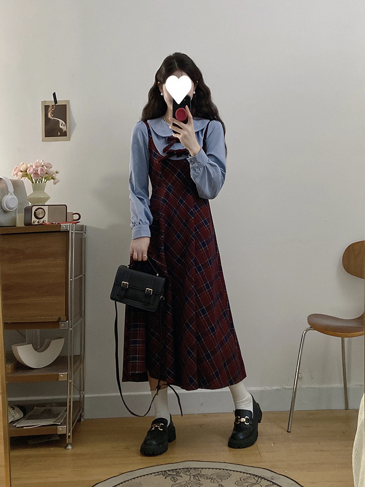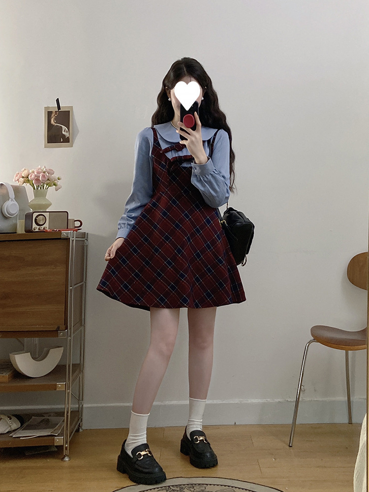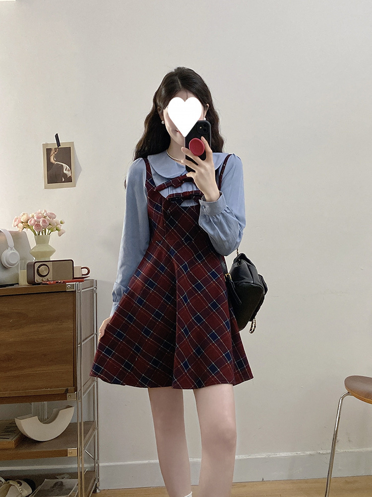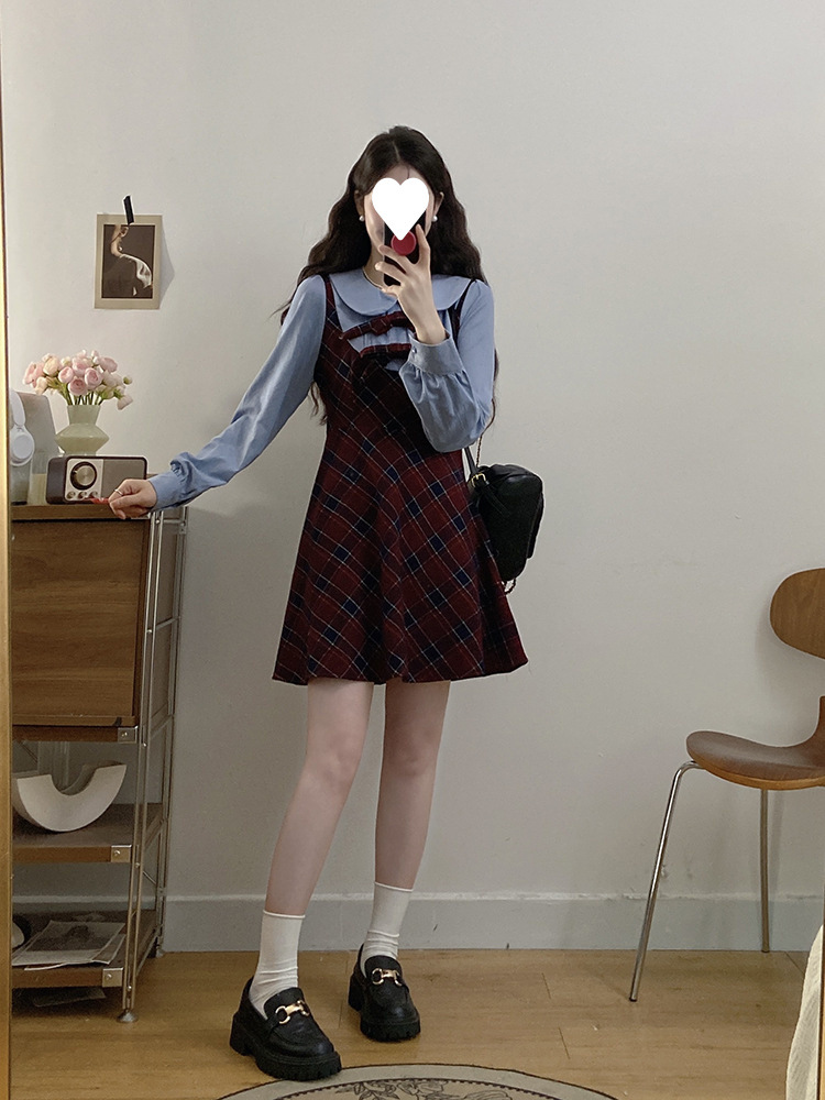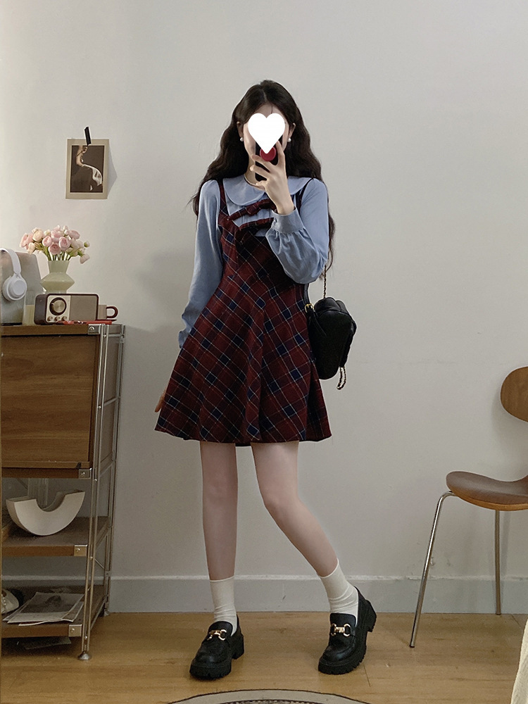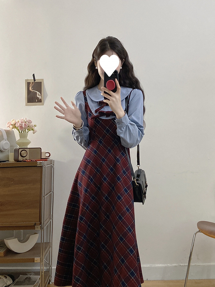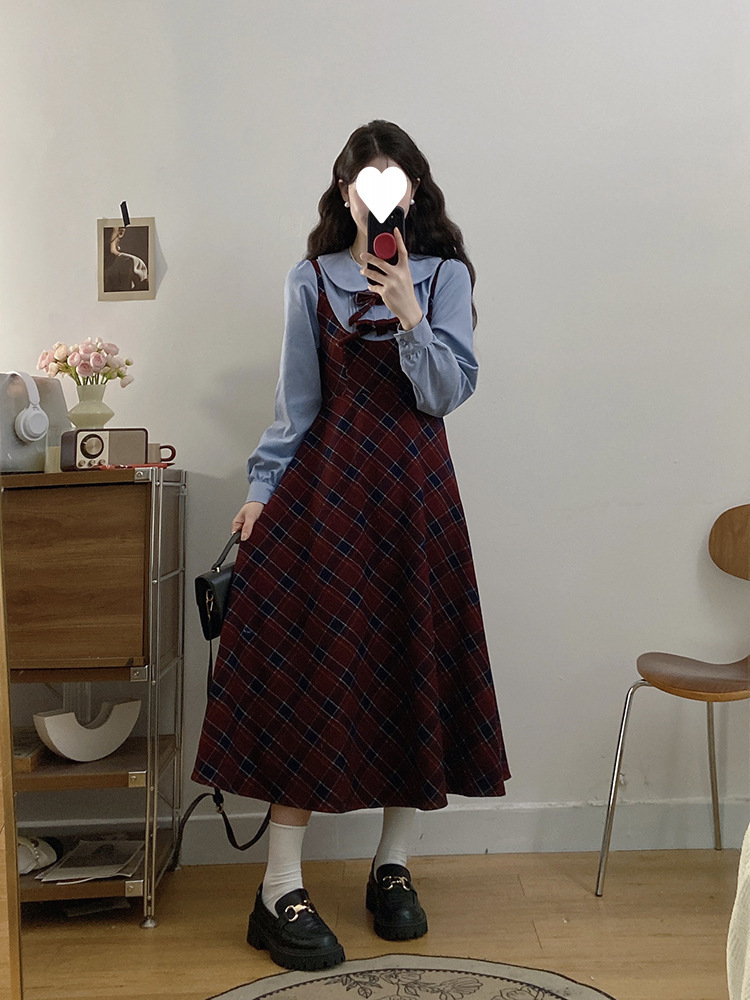 Autumn and winter retro college style niche design sense fake two-piece plaid dress women's waist thin gentle temperament skirt