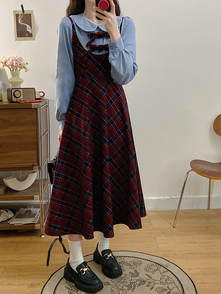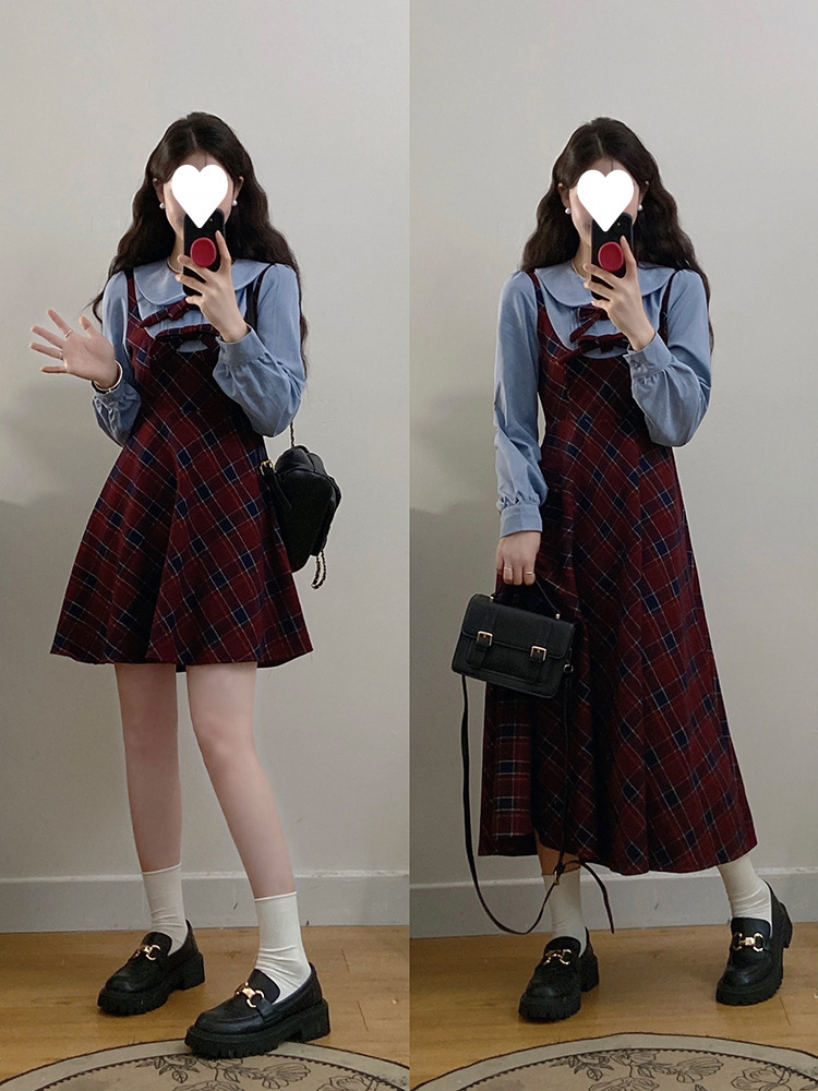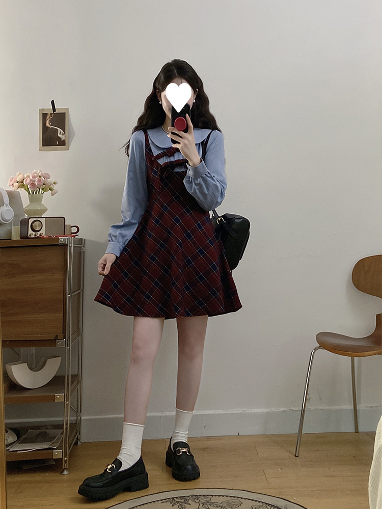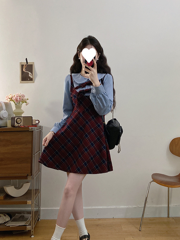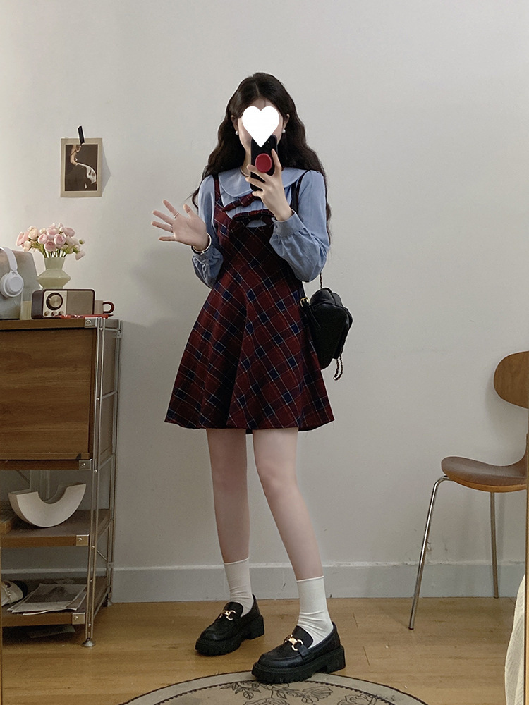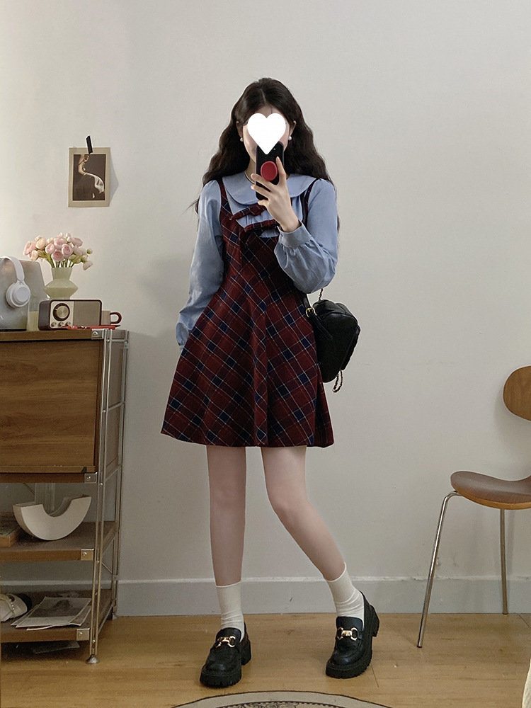 Autumn and winter retro college style niche design sense fake two-piece plaid dress women's waist thin gentle temperament skirt