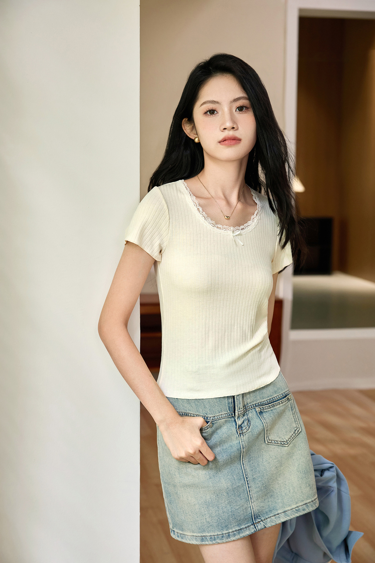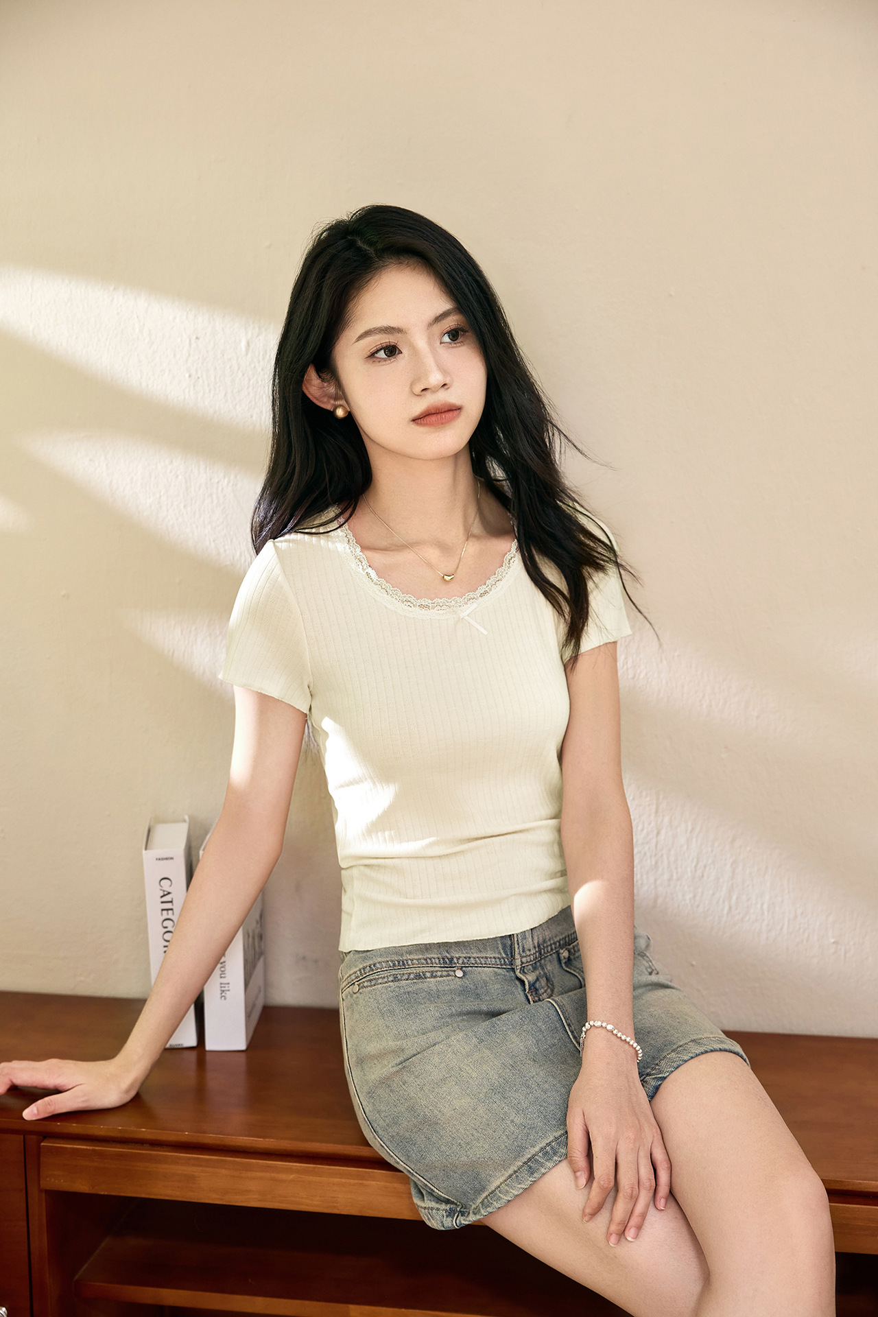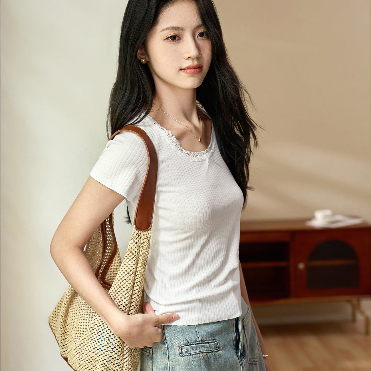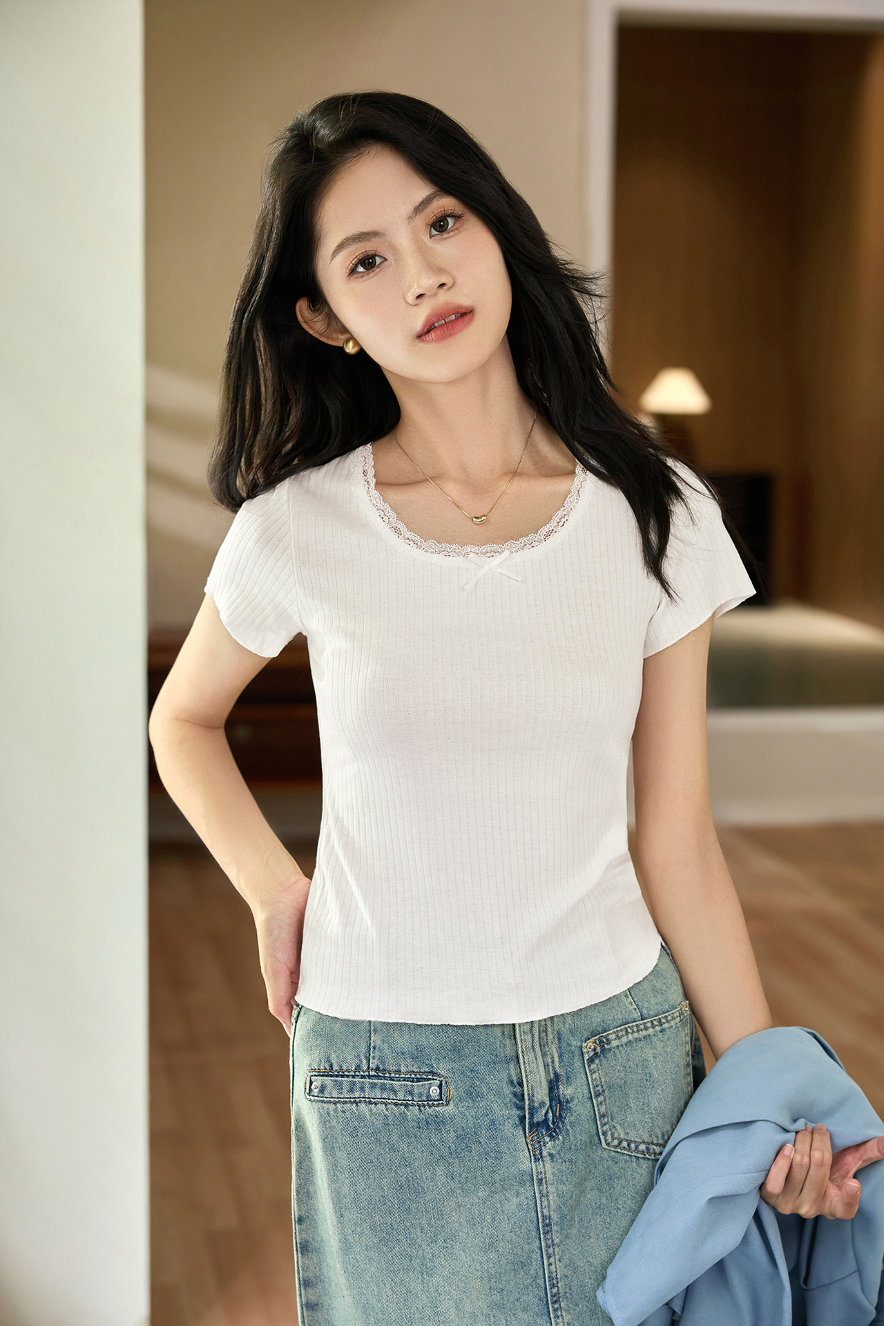 Ballet style pure lace U-neck T-shirt women's 2026 summer new retro short-sleeved curled edge bottoming shirt top