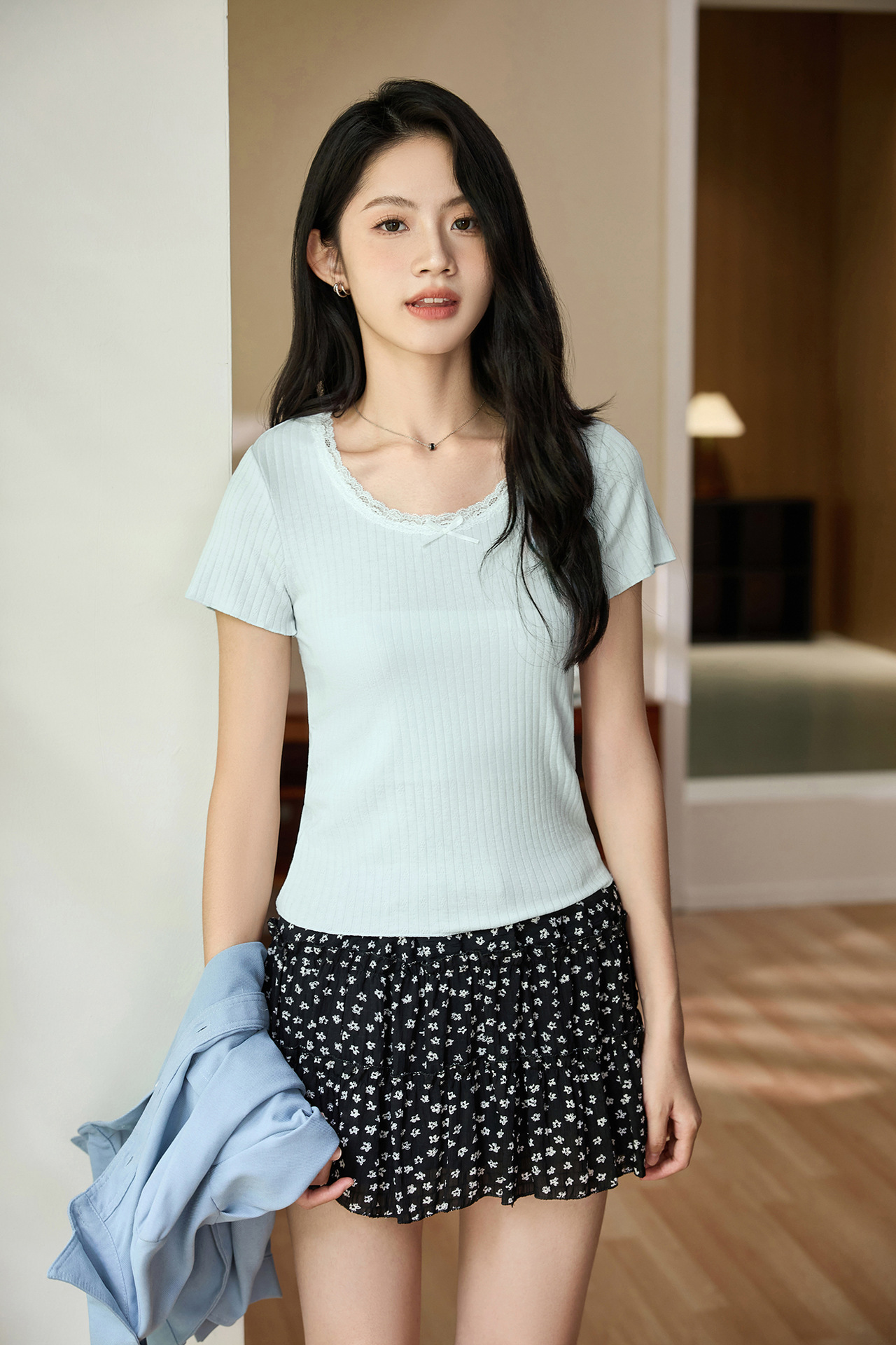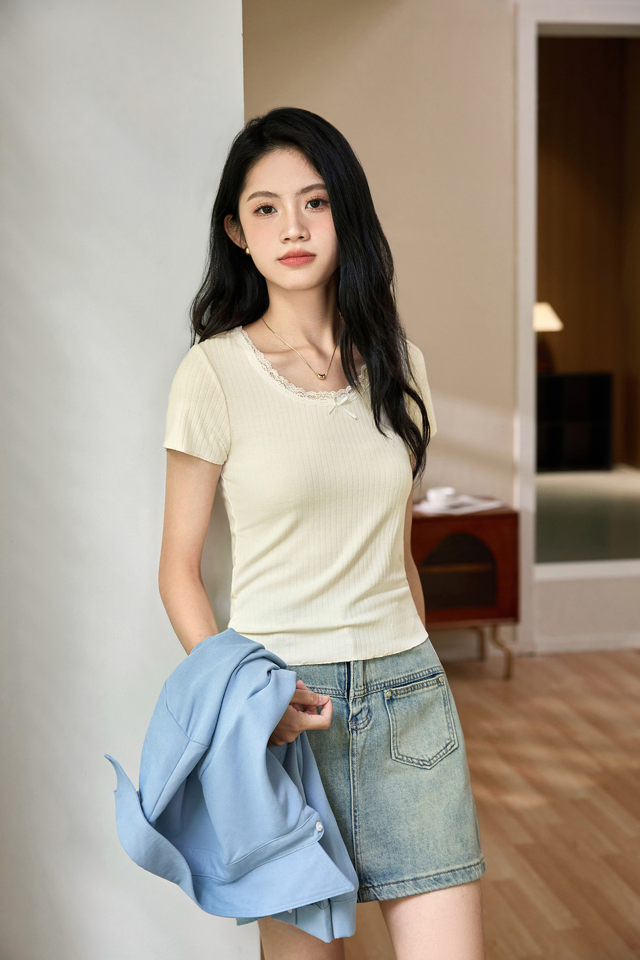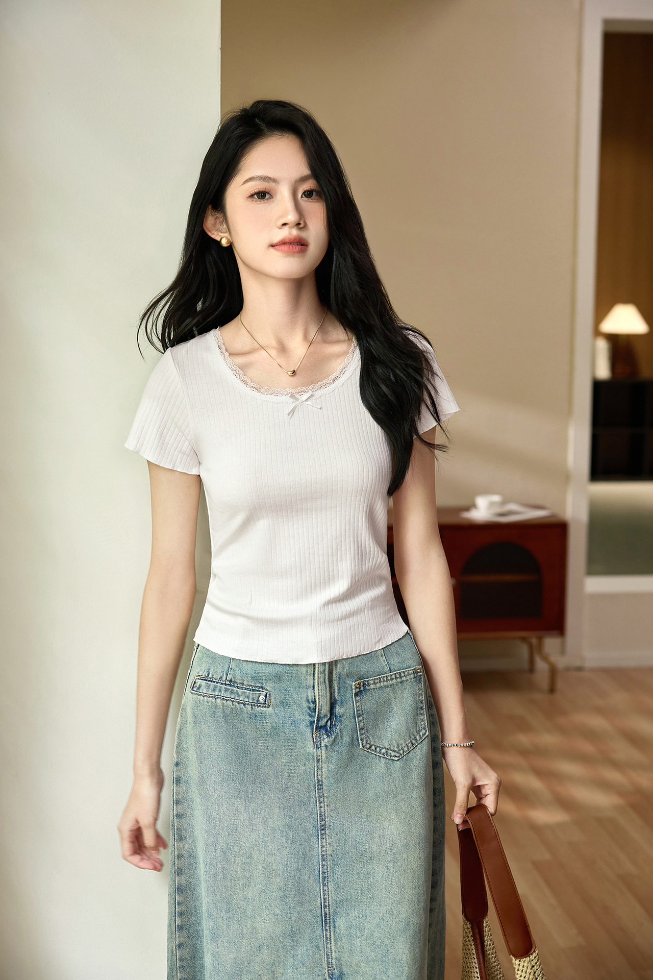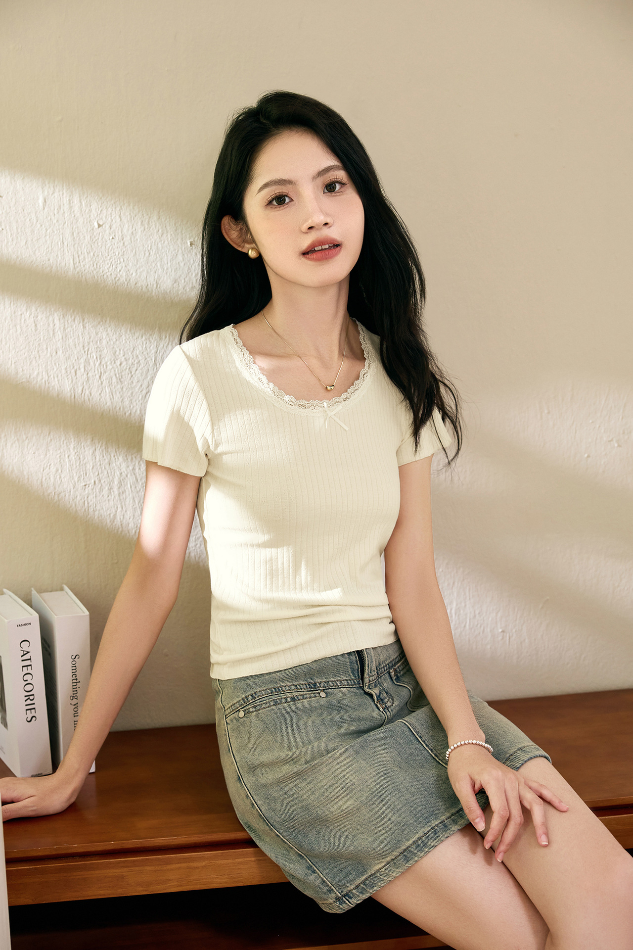 Ballet style pure lace U-neck T-shirt women's 2026 summer new retro short-sleeved curled edge bottoming shirt top