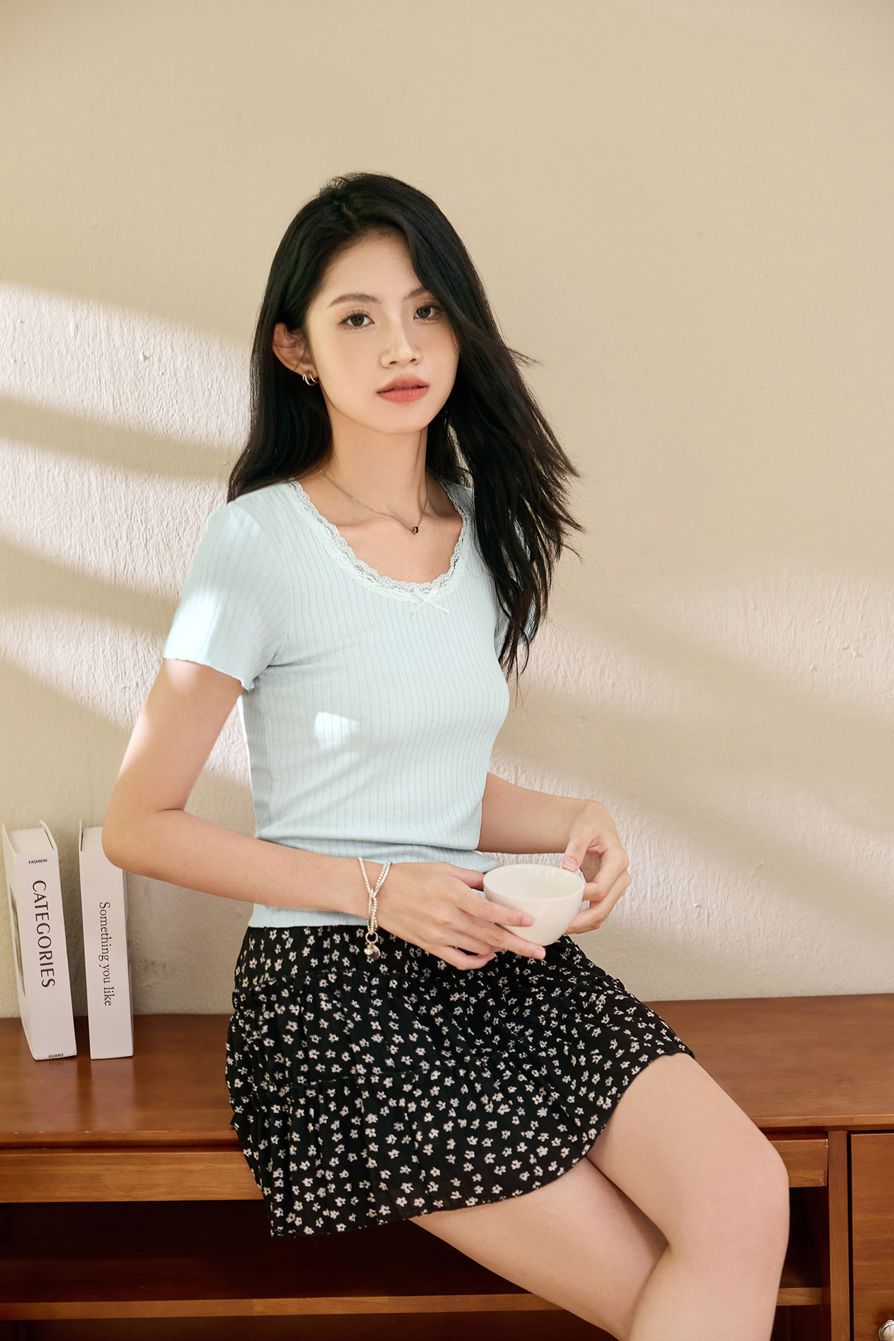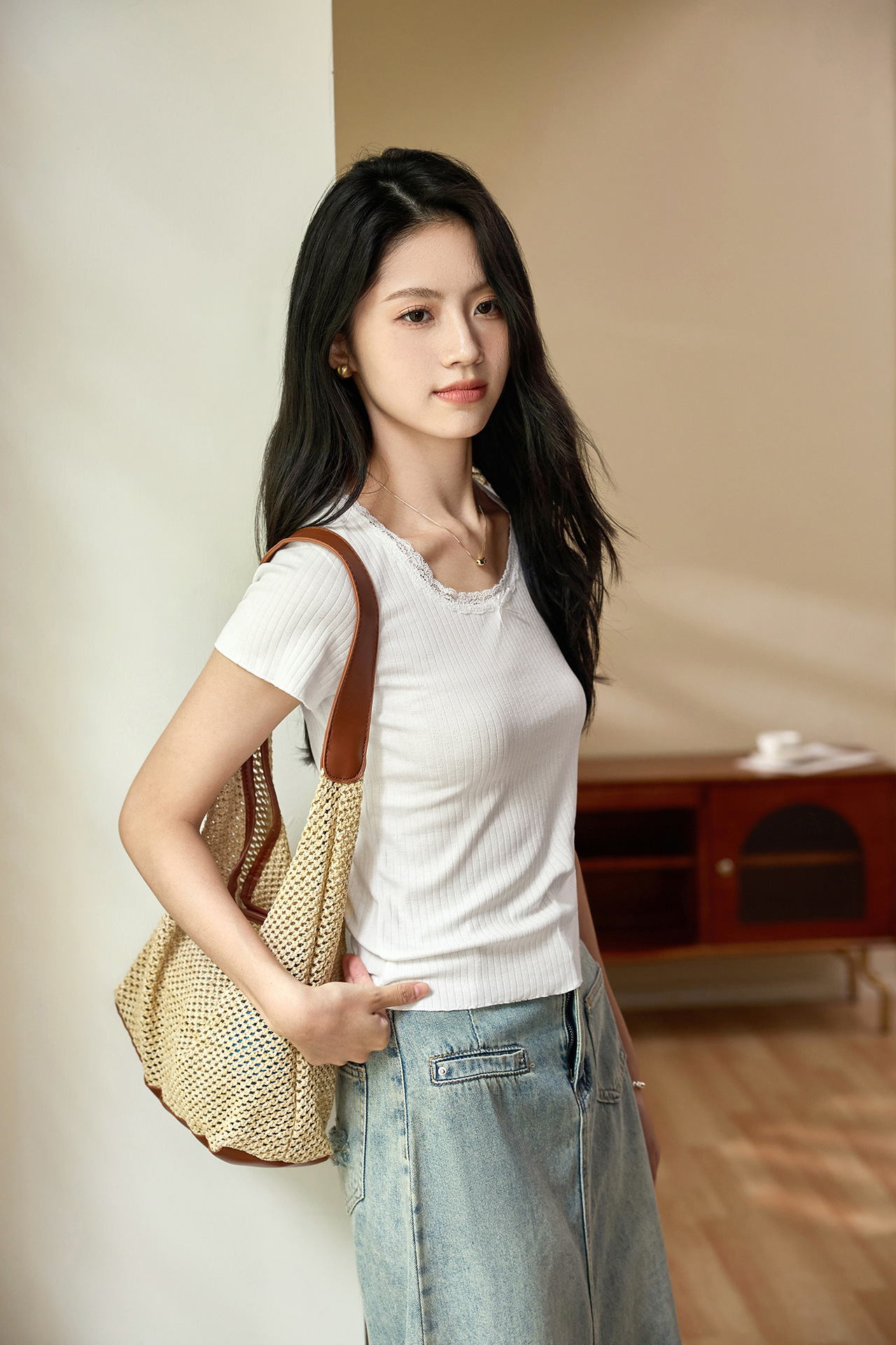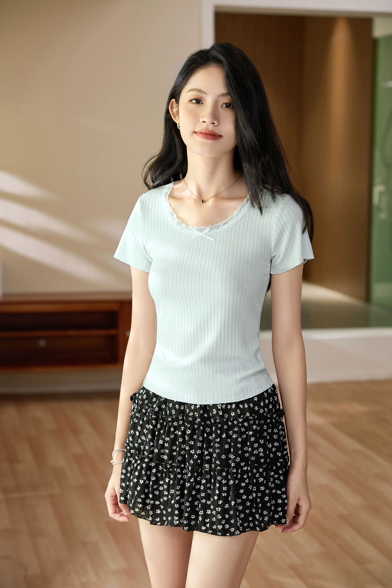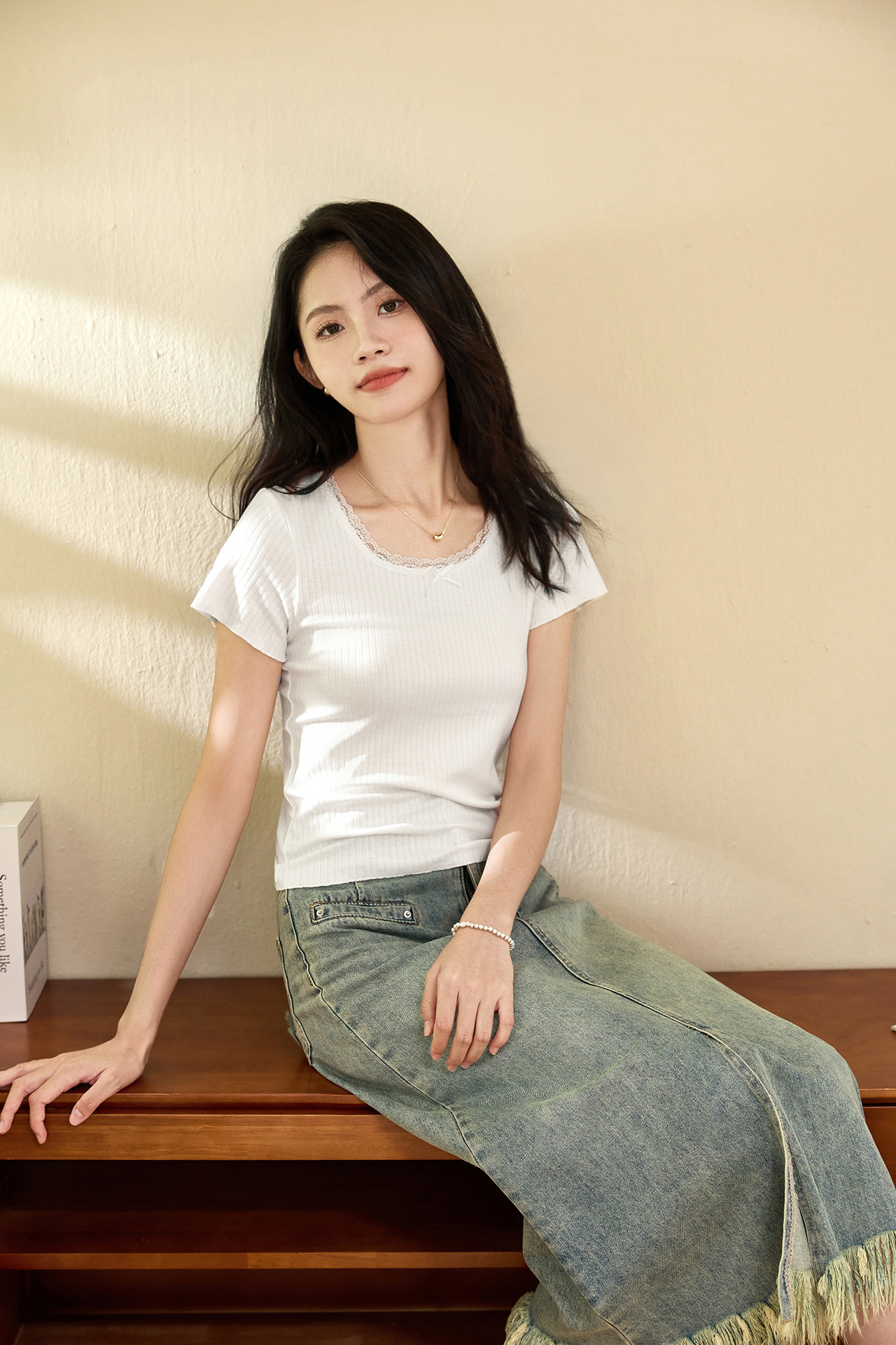 Ballet style pure lace U-neck T-shirt women's 2026 summer new retro short-sleeved curled edge bottoming shirt top