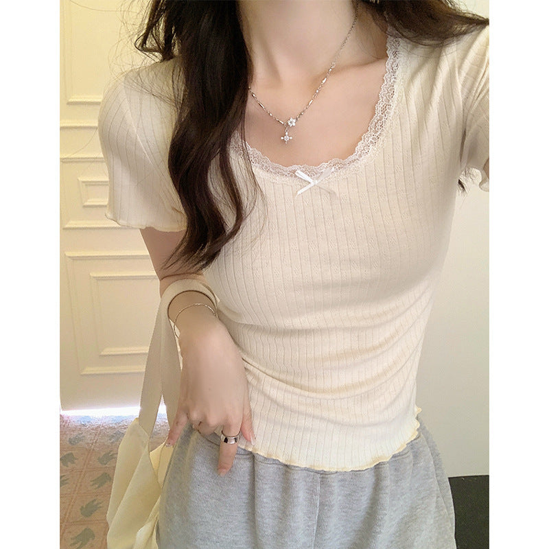 Ballet style pure lace U-neck T-shirt women's 2026 summer new retro short-sleeved curled edge bottoming shirt top