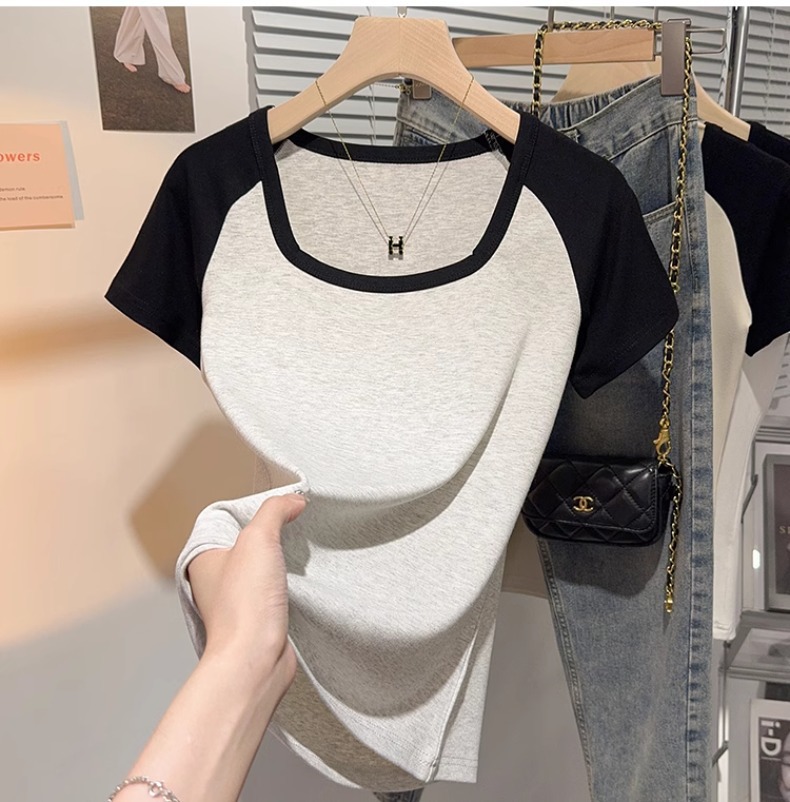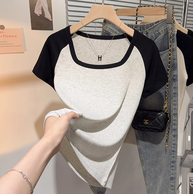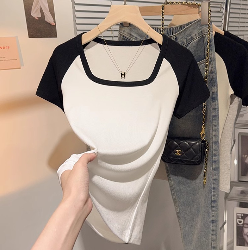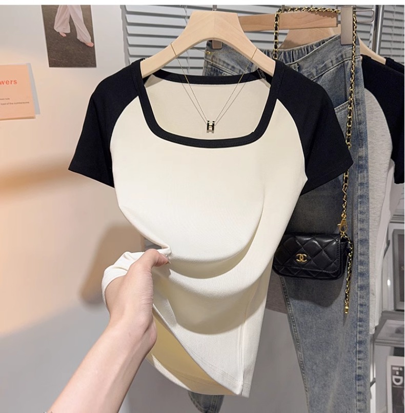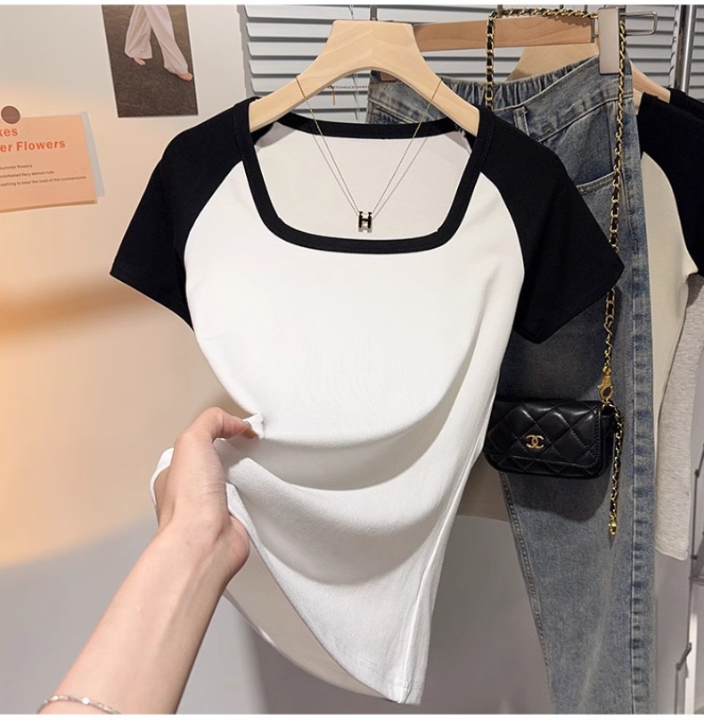 Black and white square neck contrasting color versatile slim-fitting short-sleeved T-shirt women's summer new thin tight top bottoming shirt