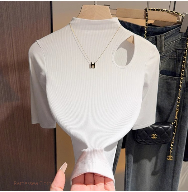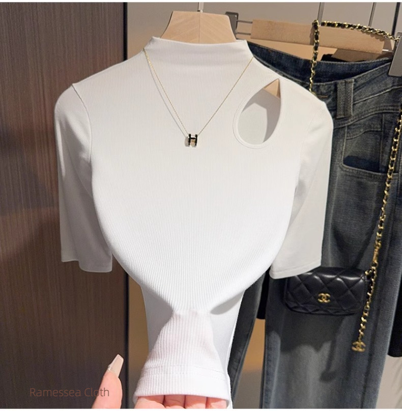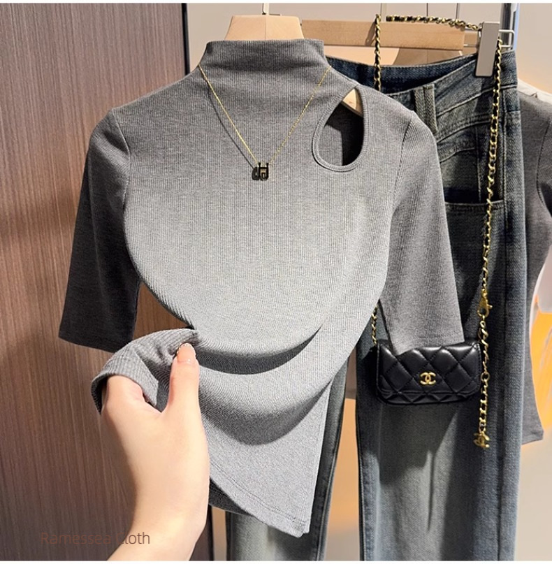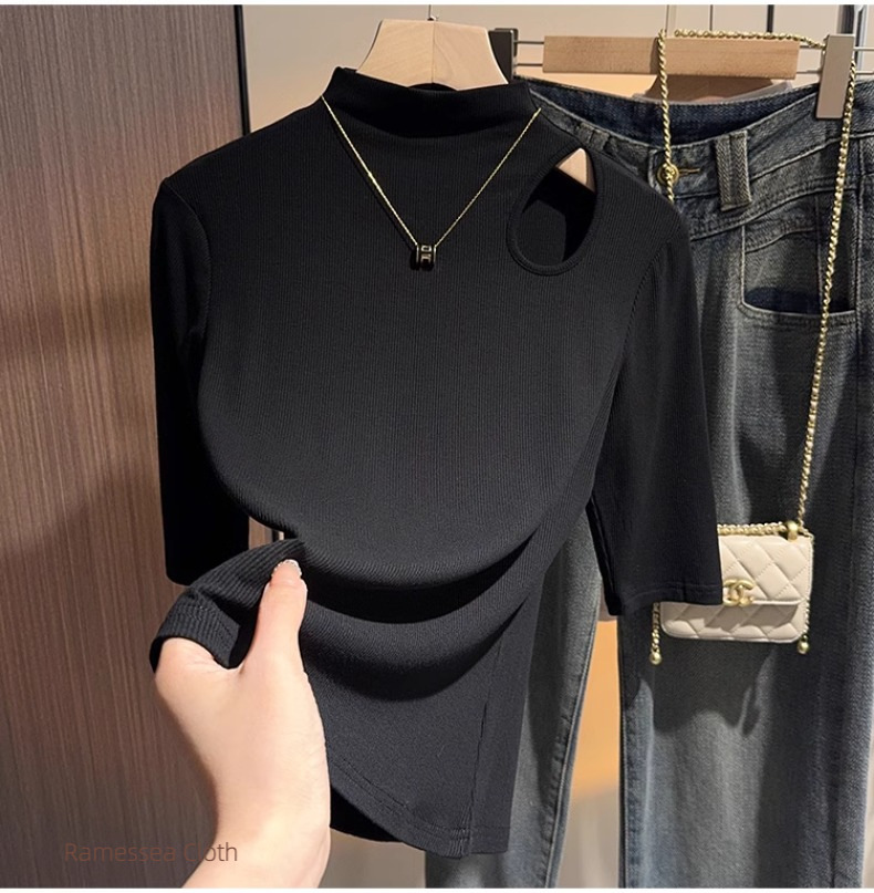 Black hollowed-out semi-turtleneck five-quarter-sleeved t-shirt bottoming shirt women's spring and autumn thin and versatile design mid-sleeved top