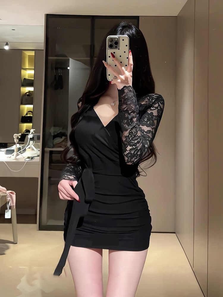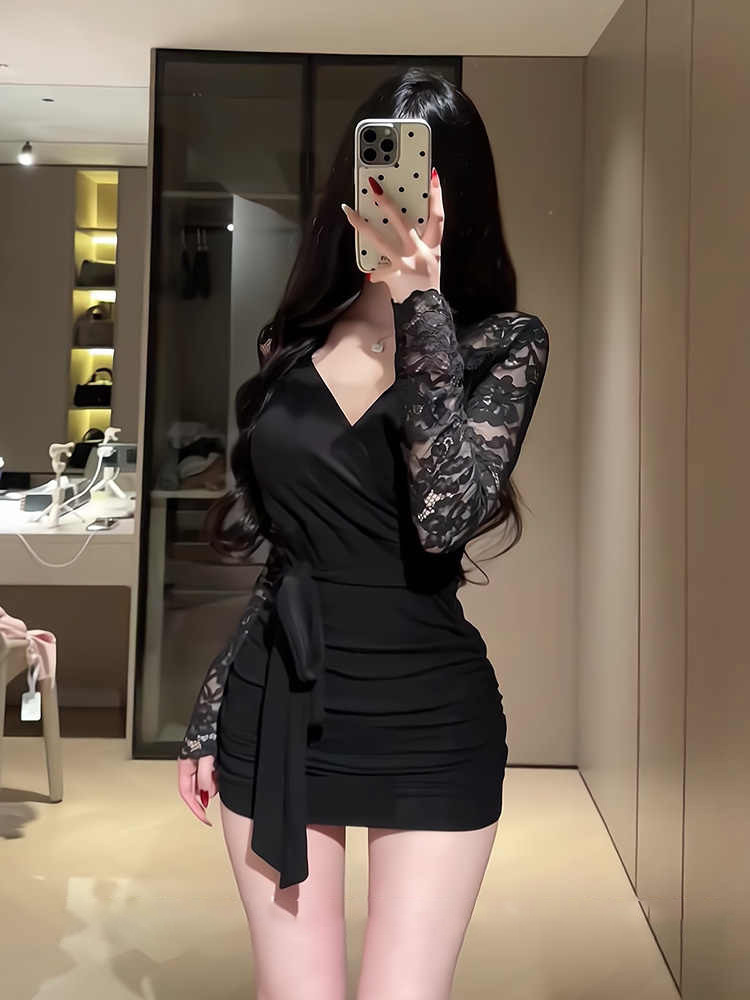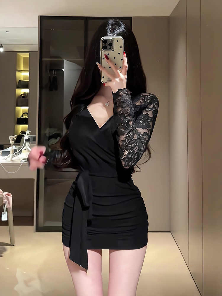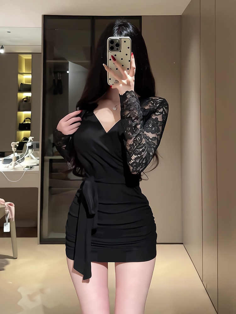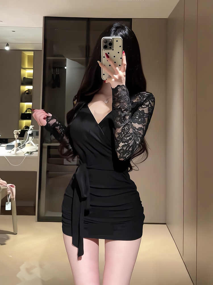 Black temperament, V-neck long sleeves, inner dress, women's spring hot girl, slimming slimming lace hip-hugging short skirt
