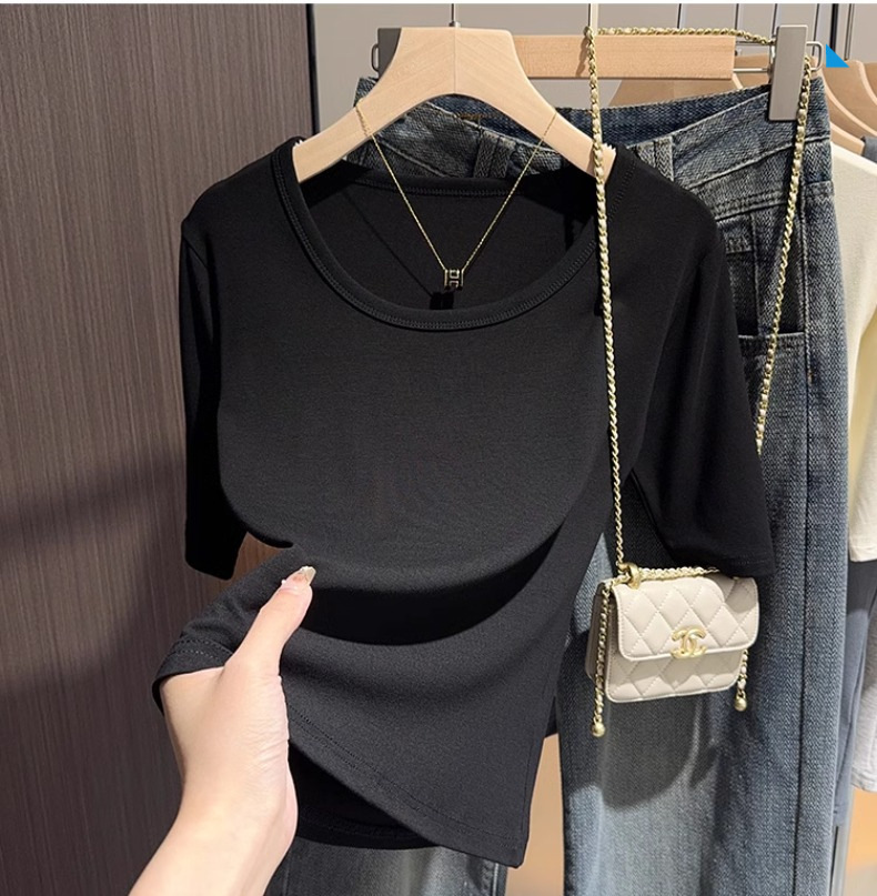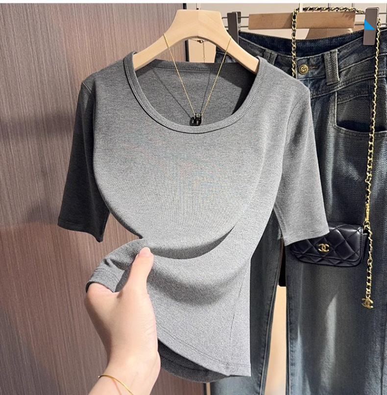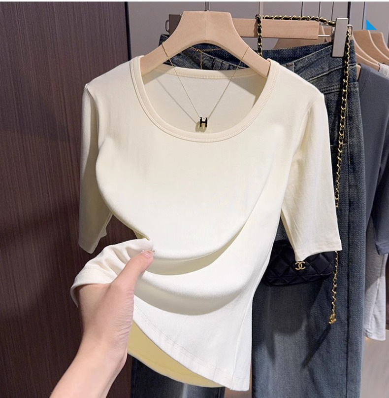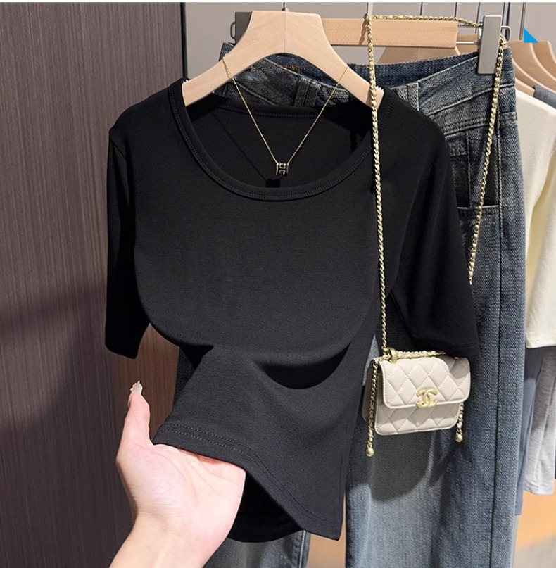 Black threaded knitted five-quarter-sleeved bottoming shirt T-shirt women's spring and autumn slim-fit half-sleeved U-neck middle-sleeved front shoulder clothes