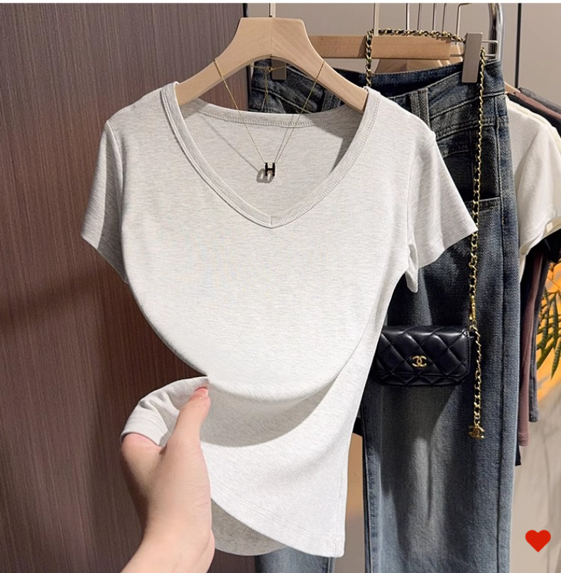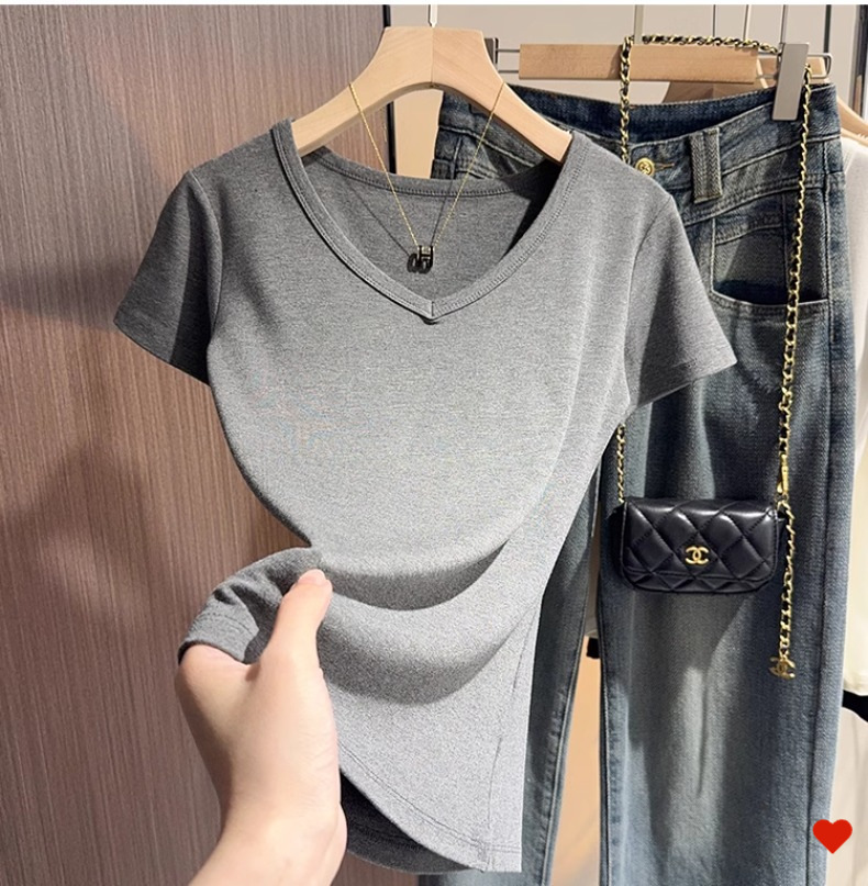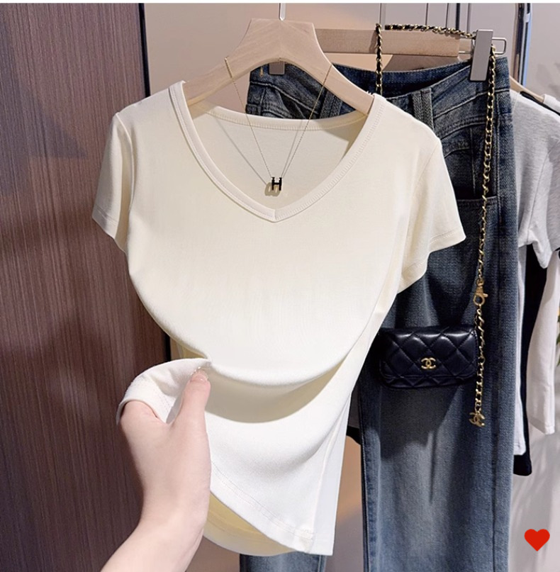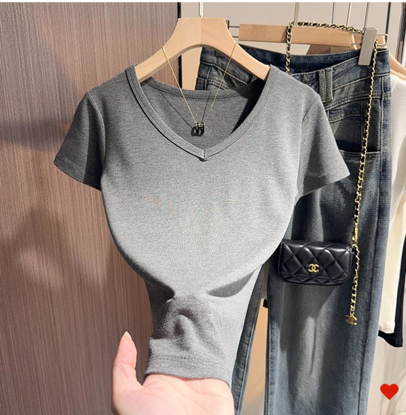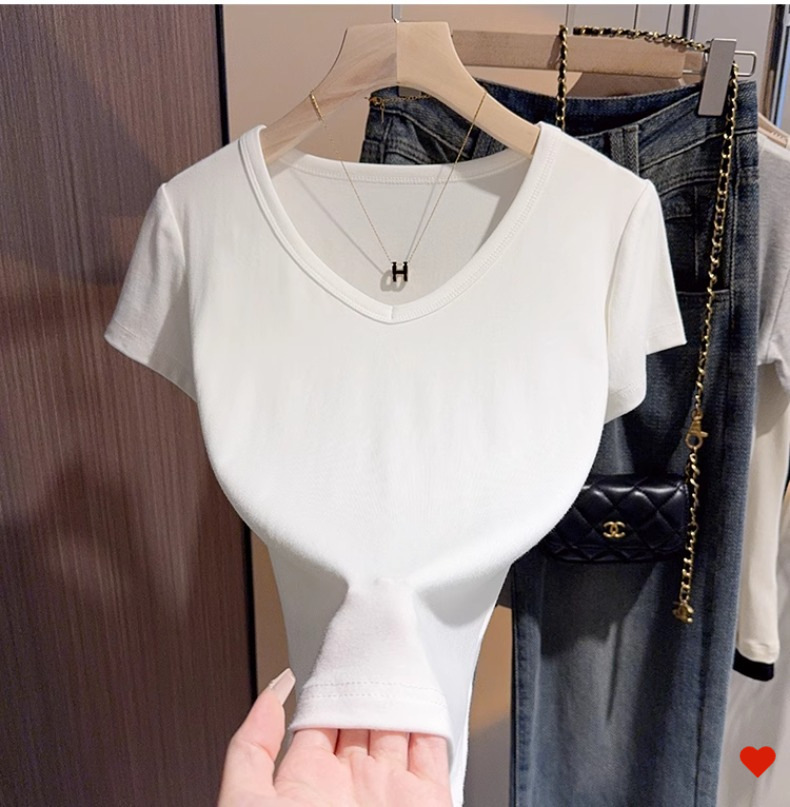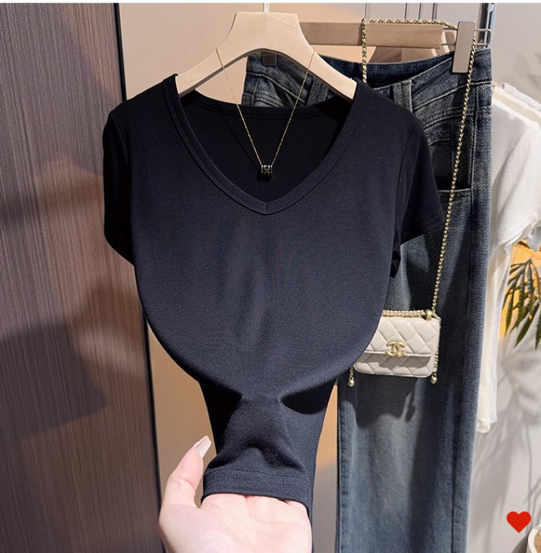 Black v-neck t-shirt women's short-sleeved front shoulder versatile summer new high-end bottoming shirt collarbone temperament Korean top
