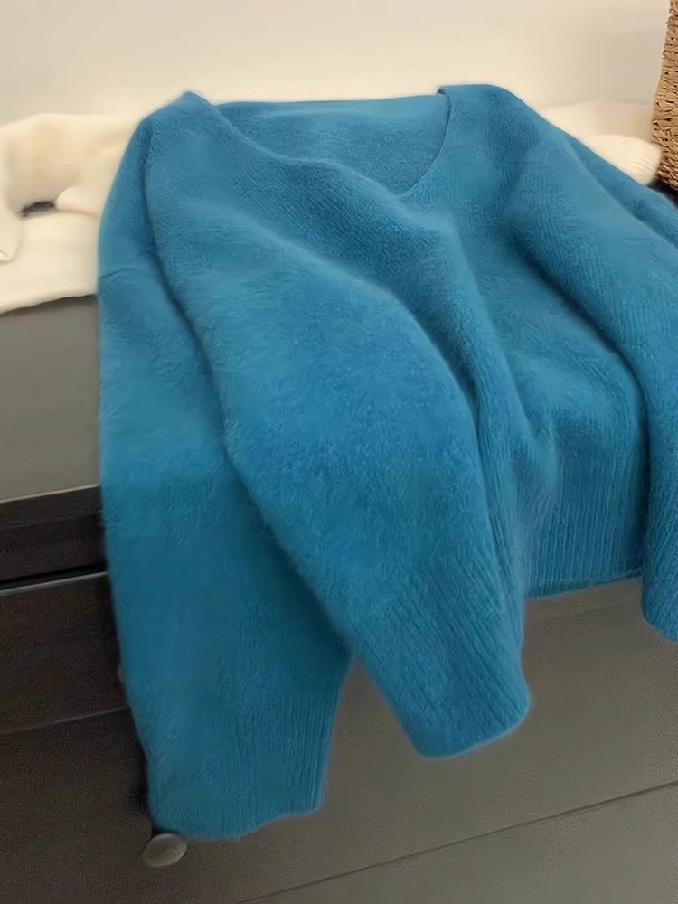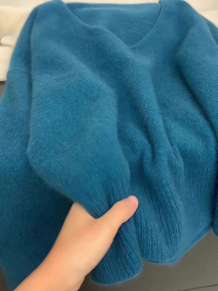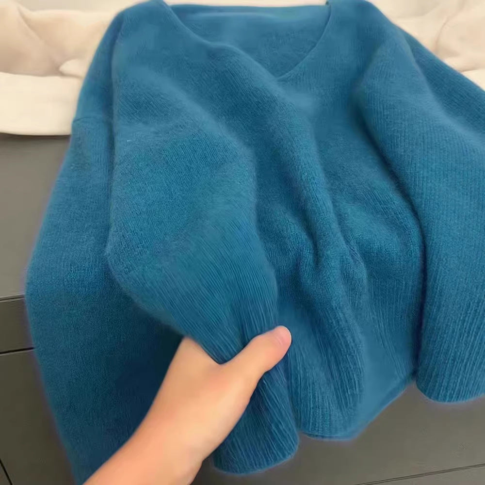 Blue v-neck soft waxy imitation raccoon fleece sweater women's autumn and winter loose lazy wind pullover knitted sweater high-end top