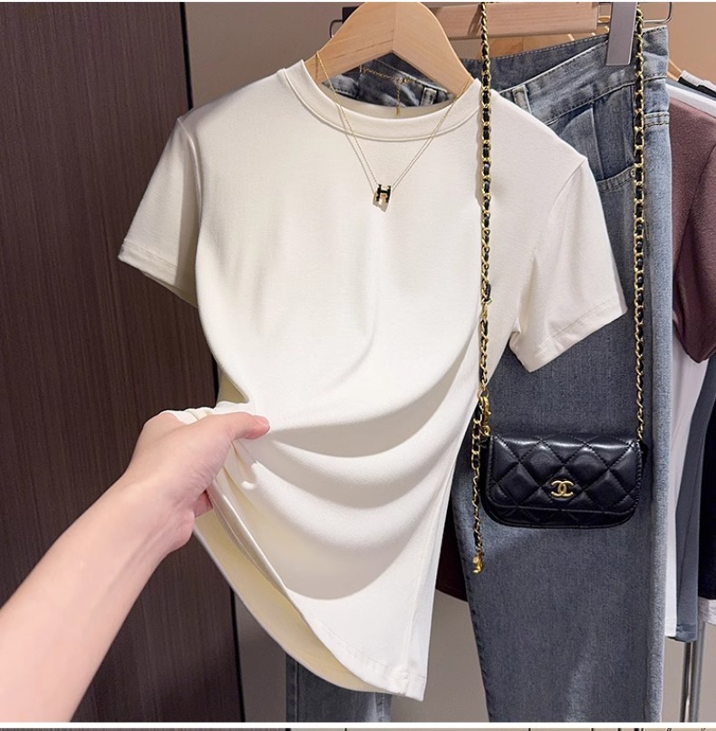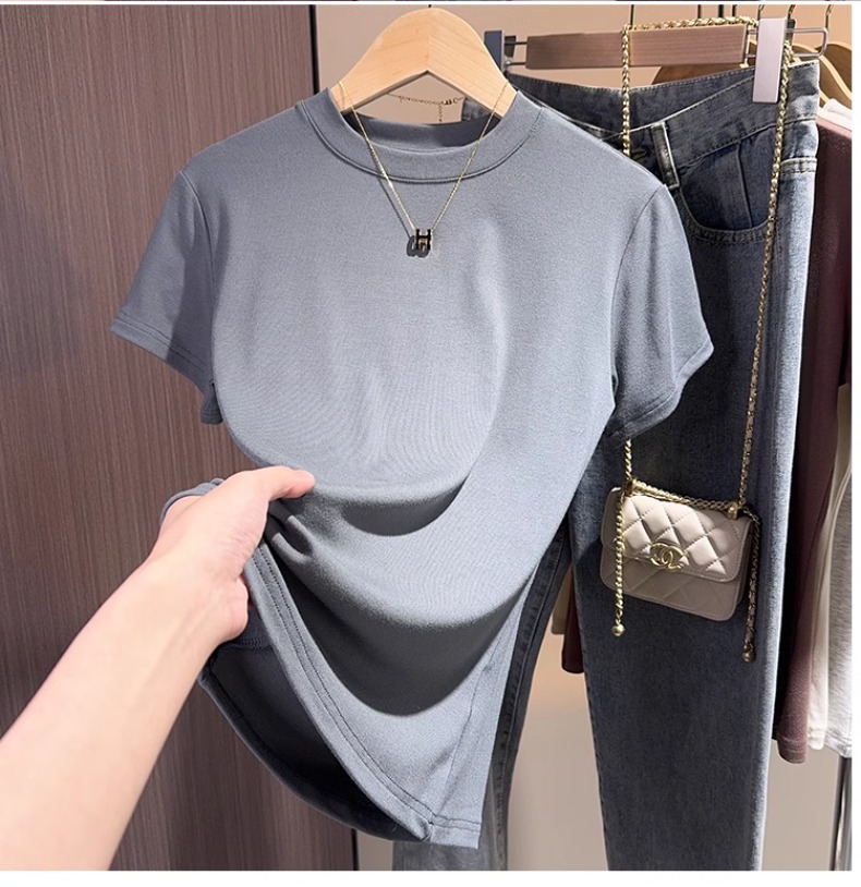 Brown short-sleeved t-shirt women's 2025 summer new high-end bottoming shirt versatile slim-fitting front shoulder top